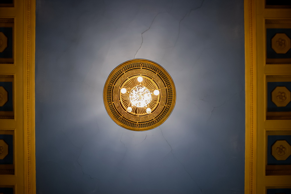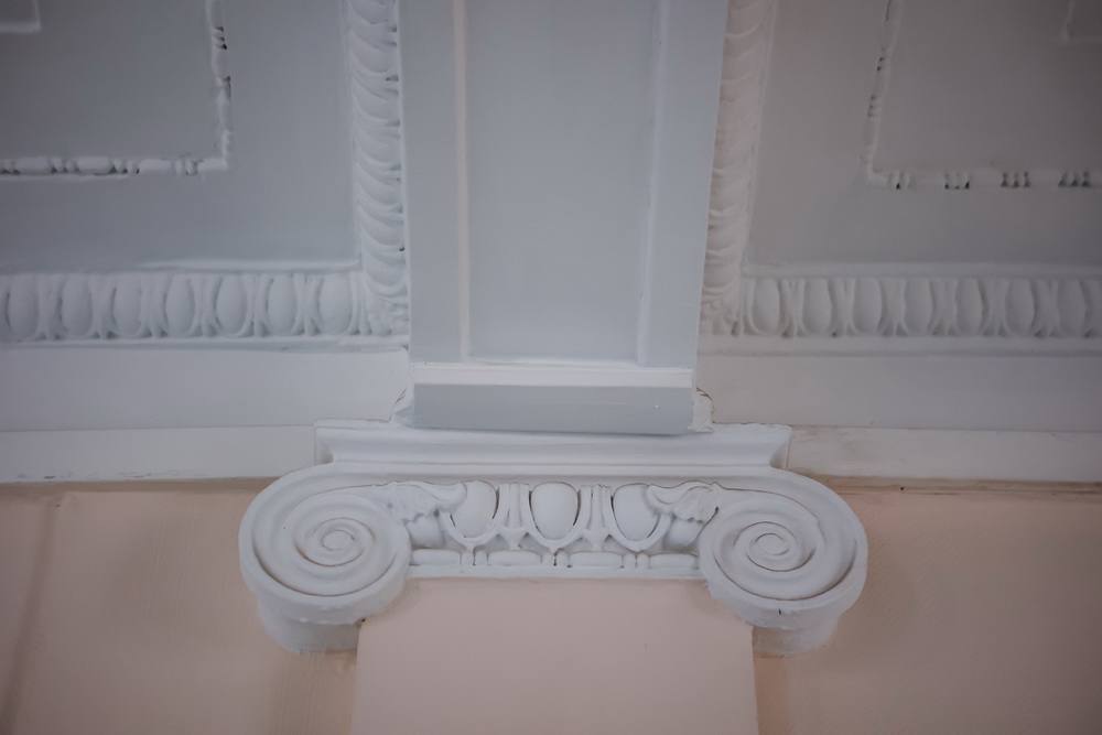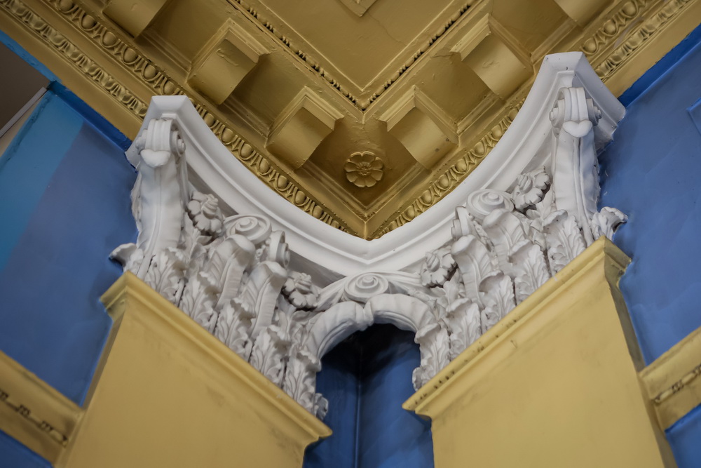 У зала необычное цветовое решение — основной цвет стен — голубой, весь лепной декор выкрашен жёлтым.