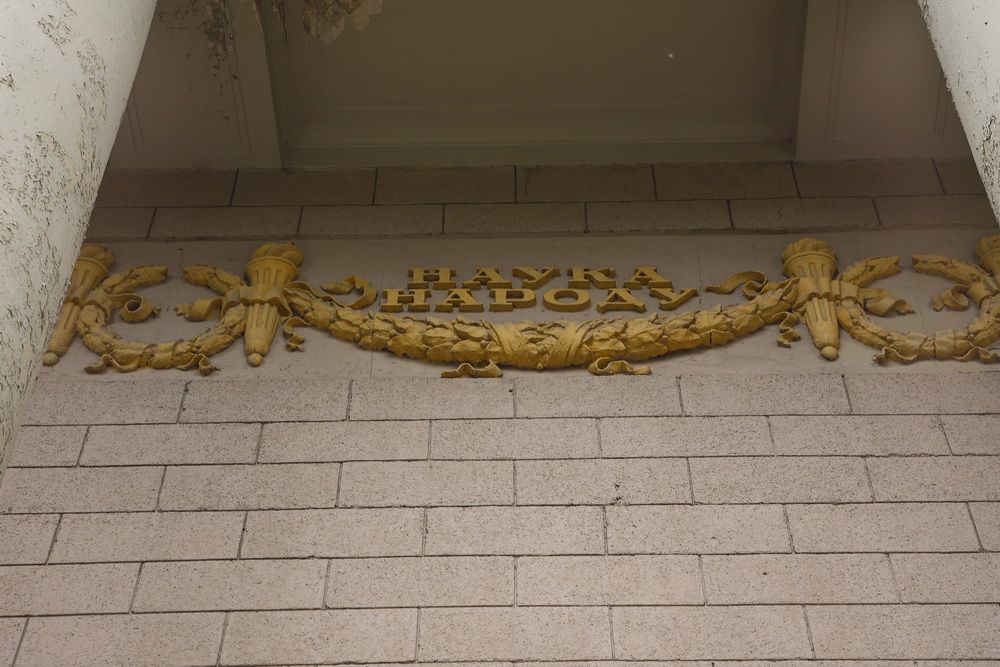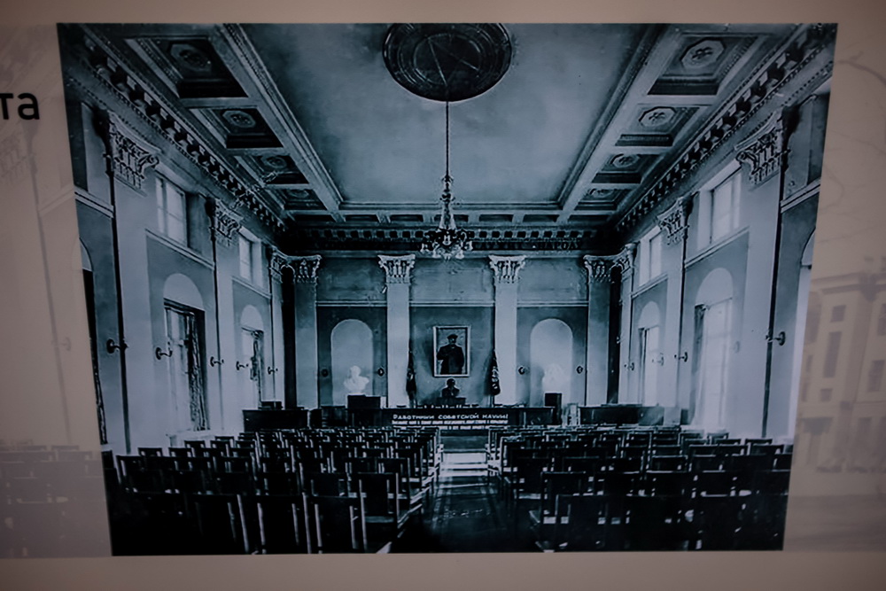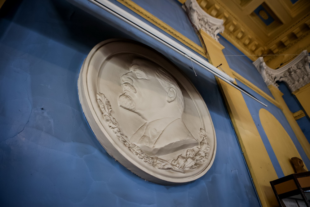 На центральной стене зала сохранился большой круглый барельеф с портретом Ленина. Правда, его закрыли экраном для проектора. Но он там есть, и при желании на него можно посмотреть.