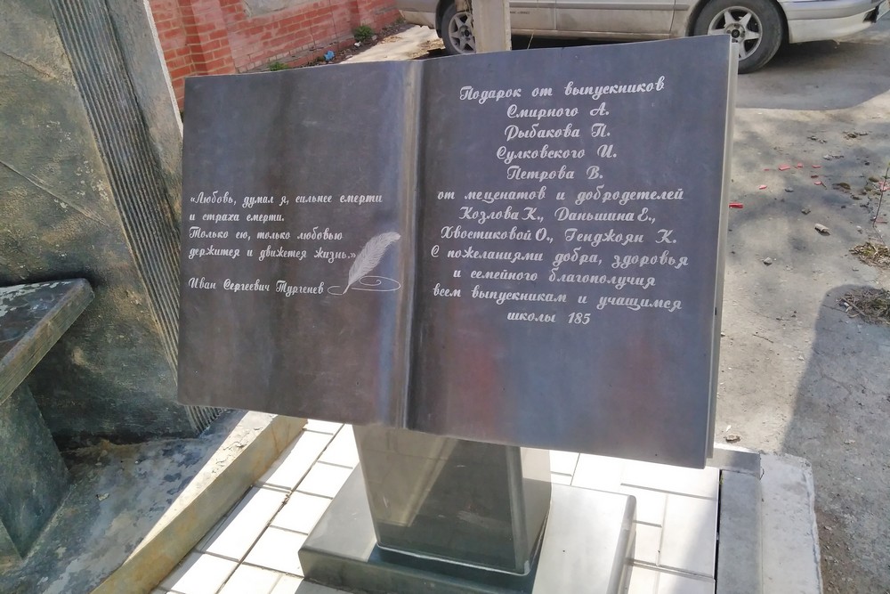 Оригинальную композицию на пересечении улицы Сакко и Ванцетти с улицей Тургенева установили выпускники школы №185. Кстати, в 2019 году администрация Октябрьского района проводила опрос горожан о перспективе сноса этого памятника. Главной претензией к нему стало нарушение правил пожарной безопасности. Но Тургенев и Муму победили и по-прежнему сидят на своём месте.