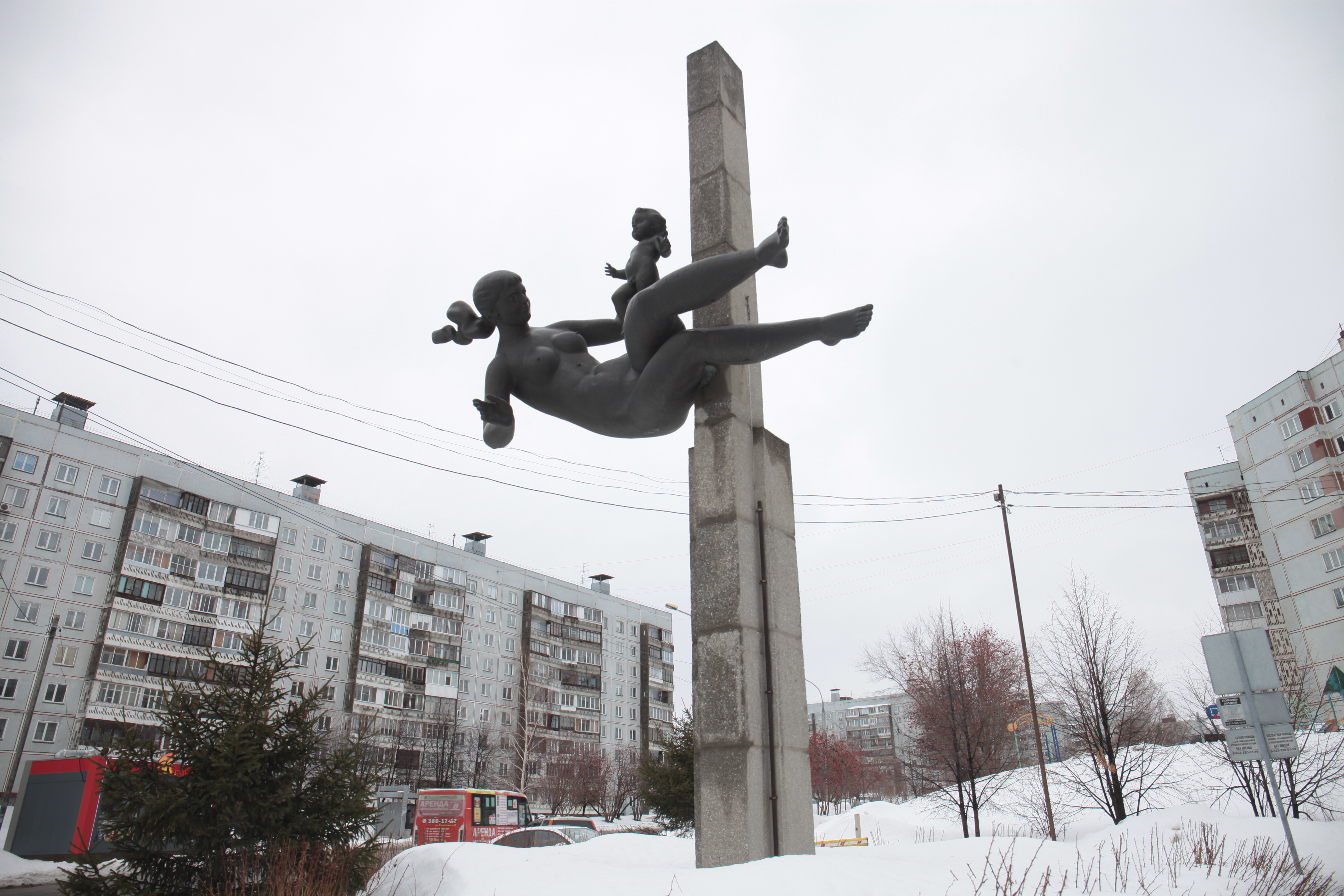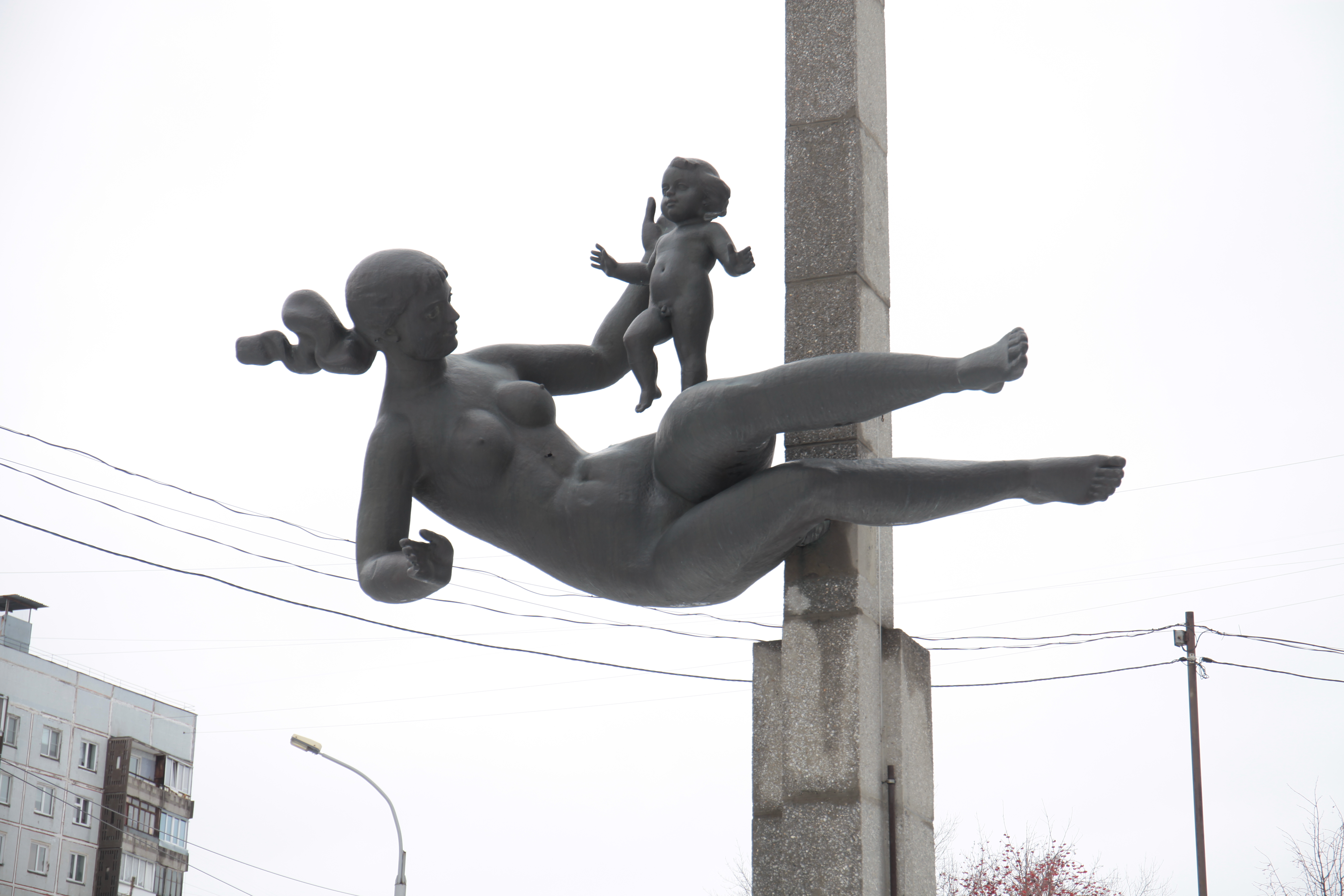 Эта довольно смелая для советских времён скульптурная композиция расположена рядом с детской поликлиникой на Рассветной, 5/1 (Калининский район). Фигуры женщины и младенца как будто летят высоко над землёй. Неподготовленного человека размер сооружения, безусловно, удивит. В длину женская фигура достигает не менее шести метров. Отлита она из метала, внутри полая.