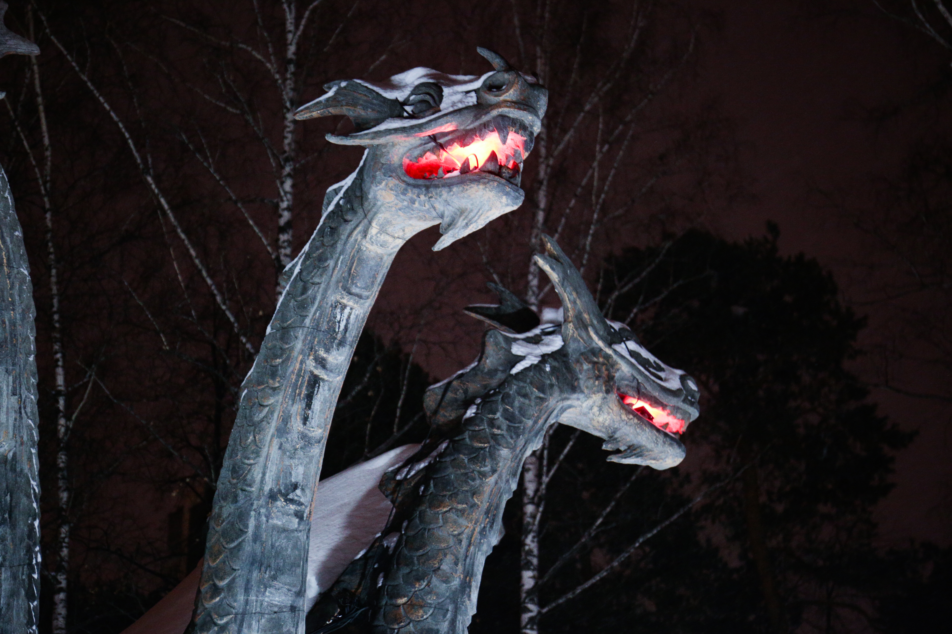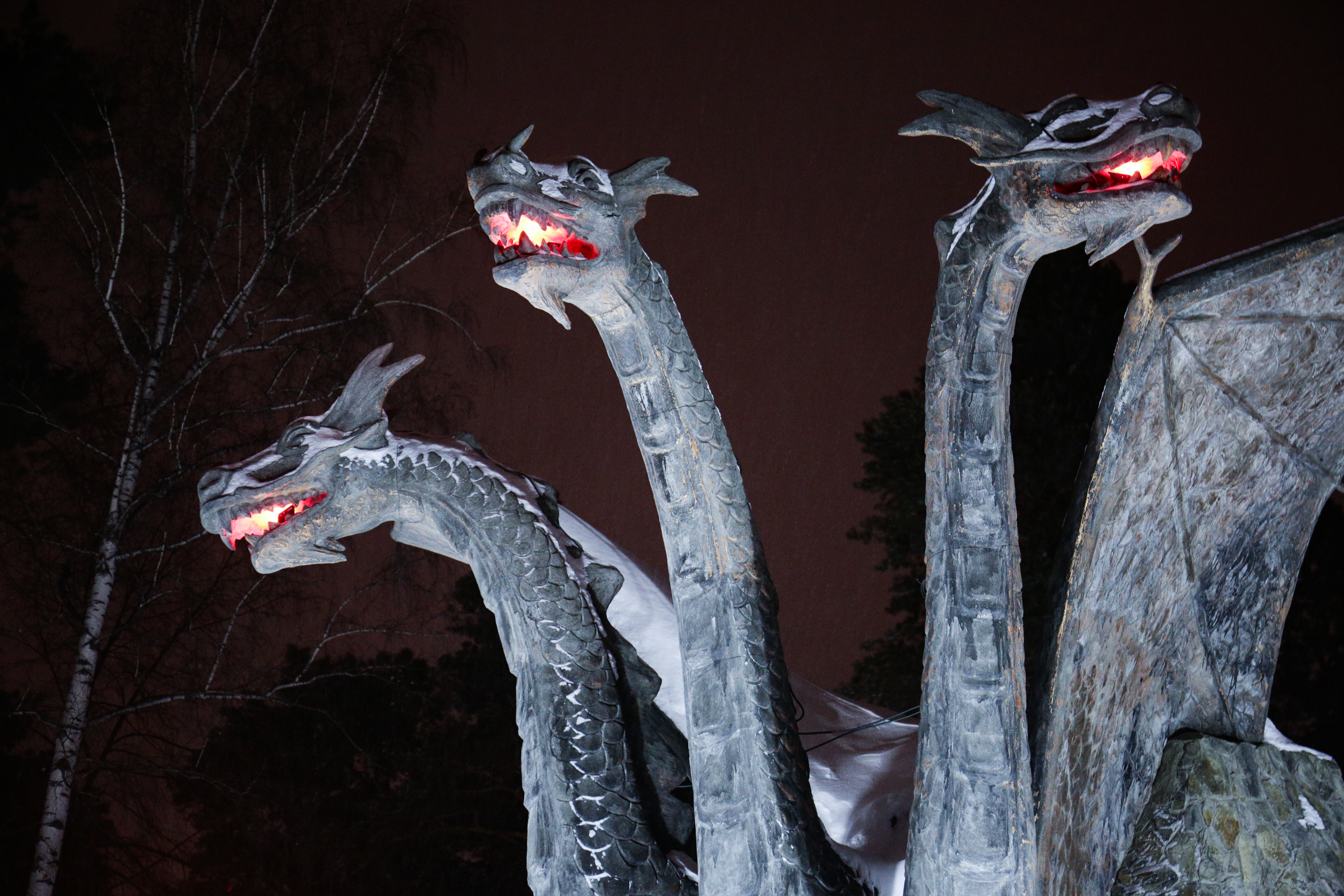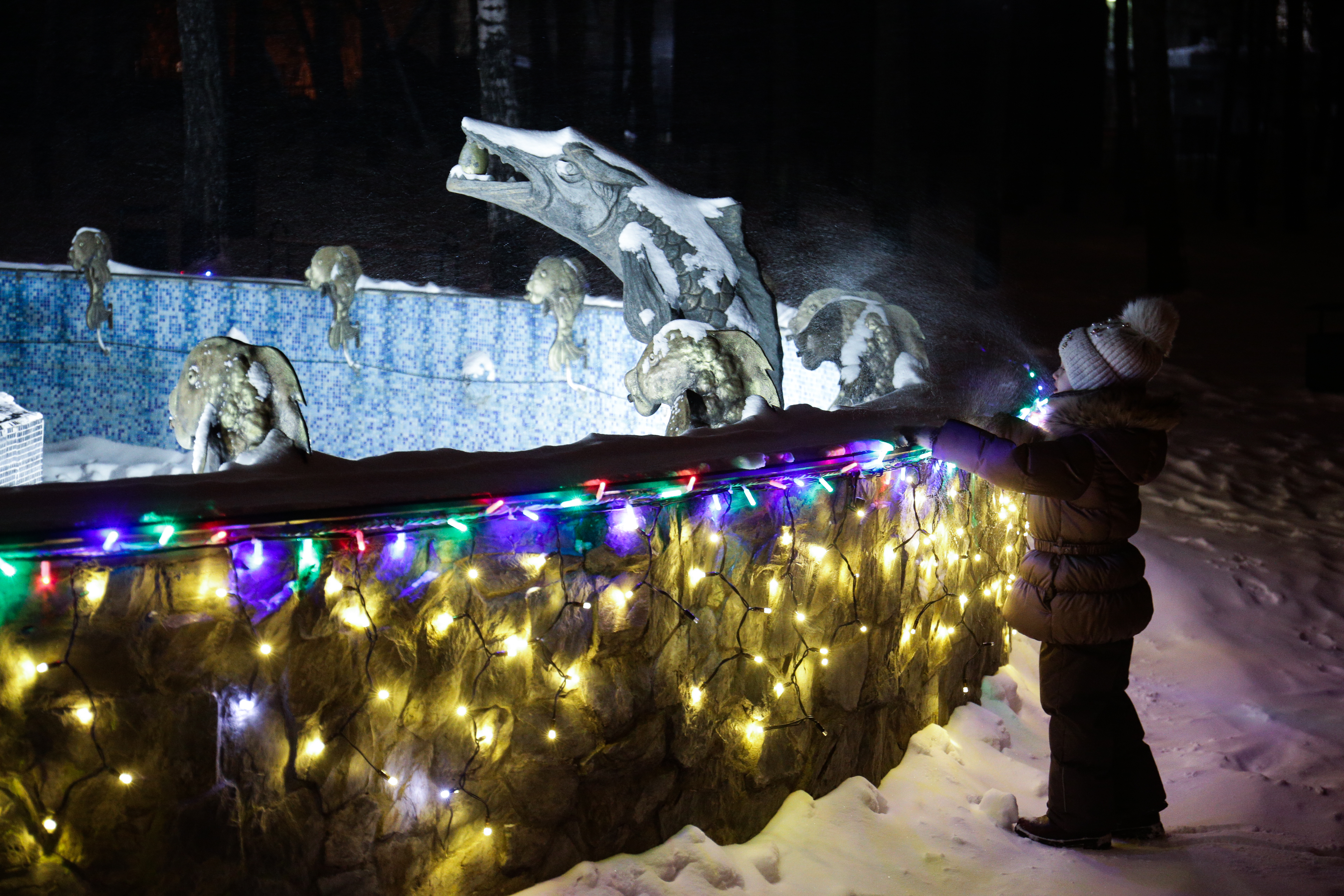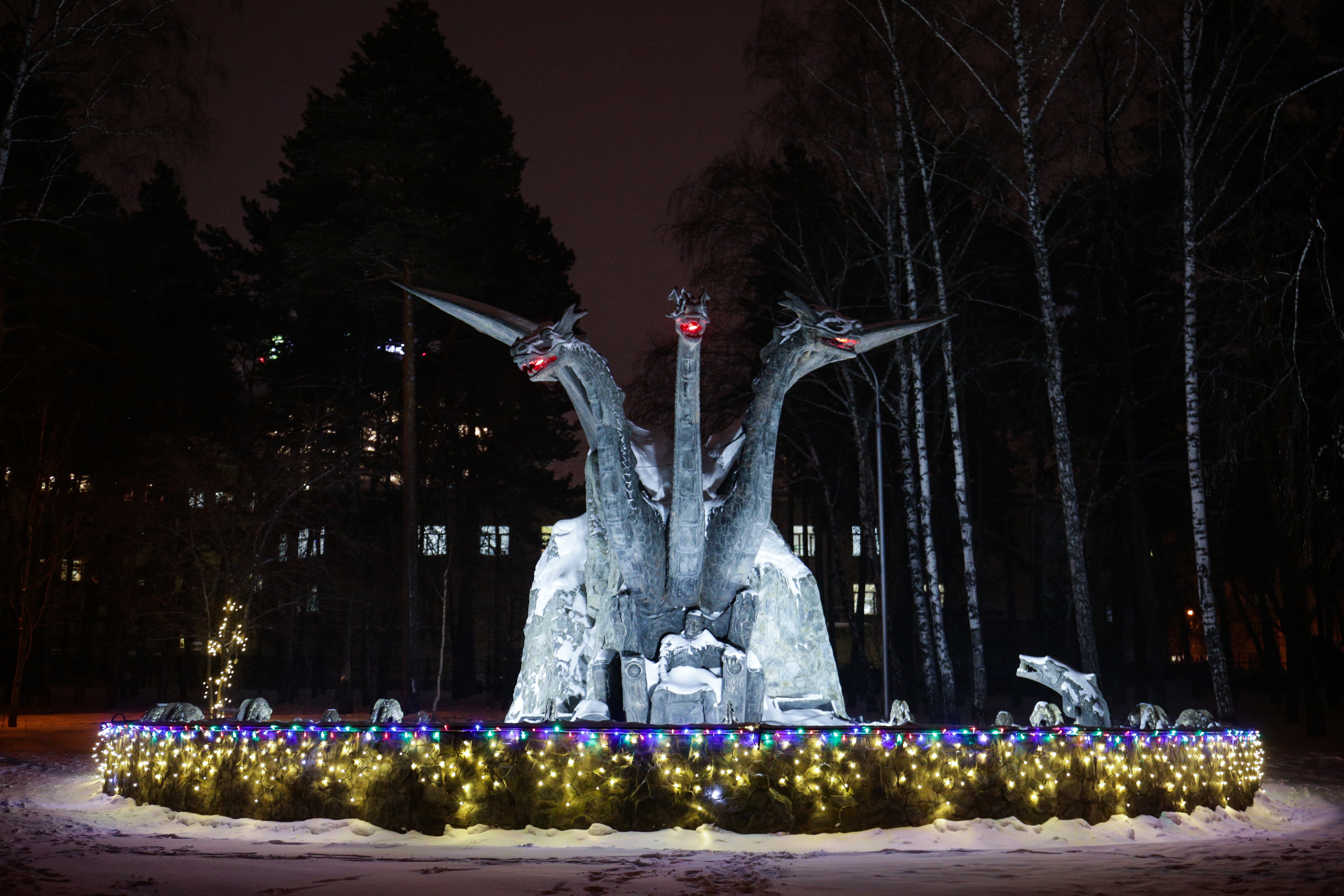 Кстати, в чаше фонтана есть ещё волшебная щука, которая держит в зубах яйцо — видимо, смерть Кощея. По слухам, эта рыба исполняет желания, если почесать ей спинку.