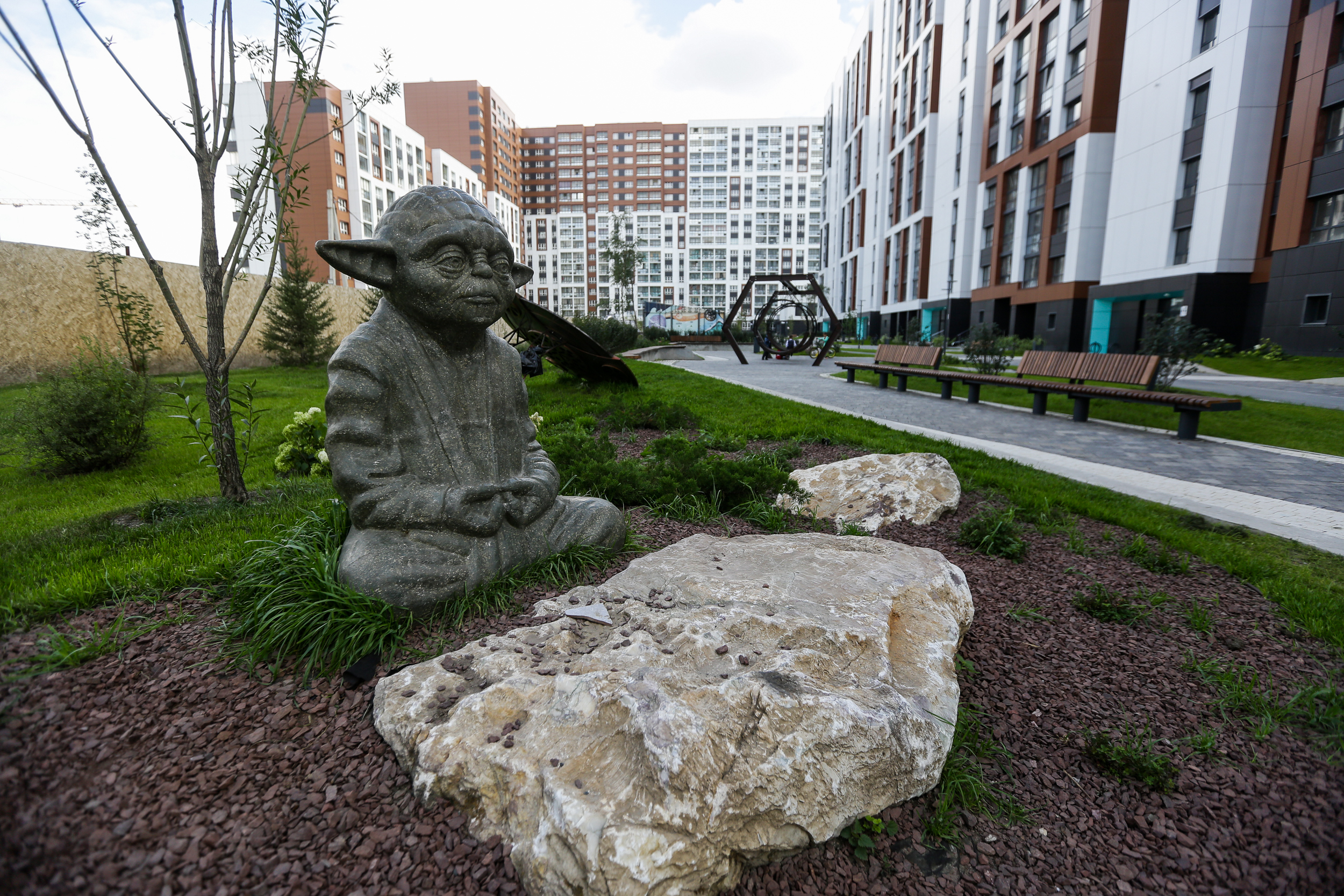 Во дворе ЖК «Галактика» на улице Николая Островского несколько лет назад построили космический парк, главным обитателем которого стал легендарный джедай киносаги «Звёздные войны» Магистр Йода. В медитативной позе он сидит возле летающей тарелки. Сделан он из твёрдого композитного материала, который содержит стеклопластик. Весит скульптура около 60 кг, а высота у неё 1,2 метра.