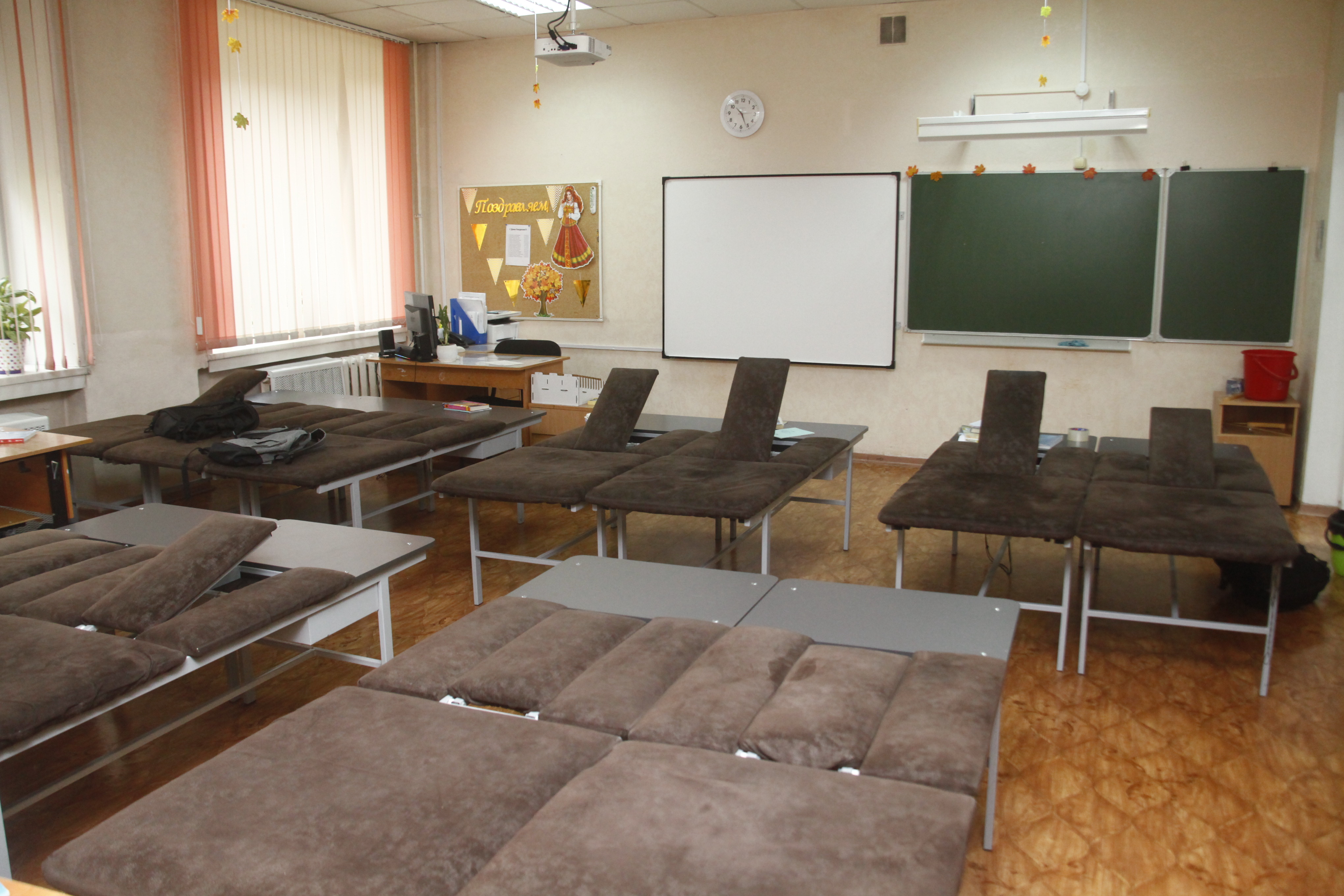 За каждым классом закреплён свой лечащий врач, который определяет, кто на уроках лежит, кто сидит, а кому необходимо стоять. Кушетками-трансформерами оснащены все кабинеты. Раньше дети располагались на простых медицинских кушетках с деревянными подставками.
