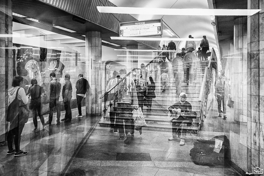 Есть у меня серия «Суета подземки» — про метро. Там я использовал режим мультиэкспозиции, это когда камера сама склеивает два кадра. Главное — удачно сфотографировать, а камера сама доделает работу.