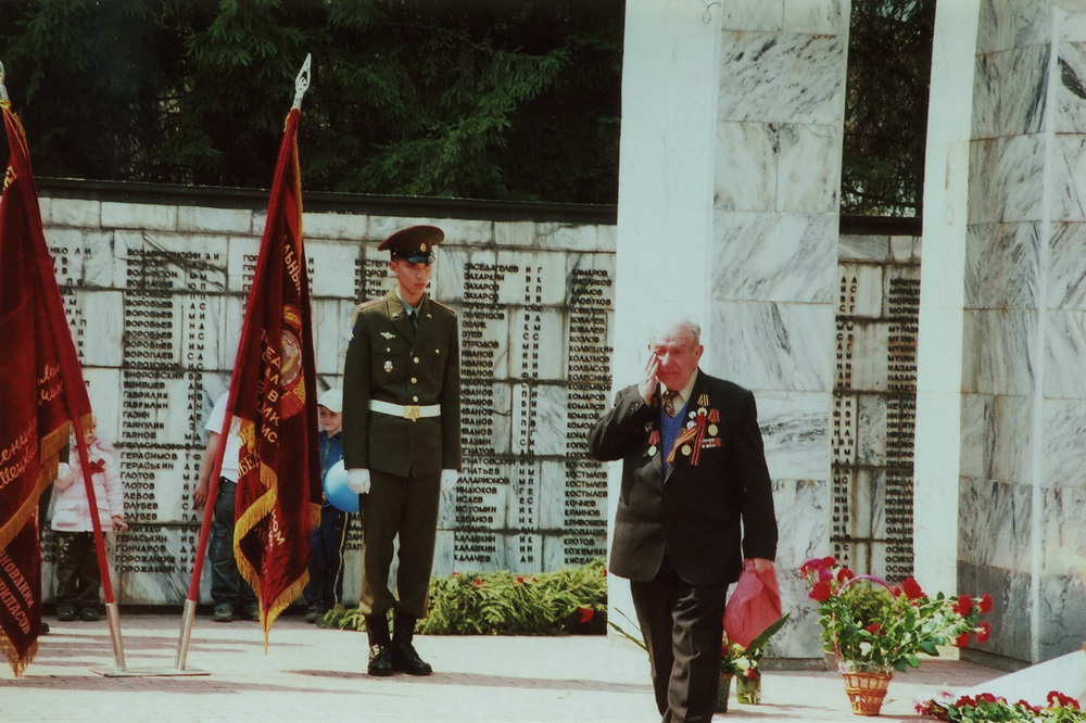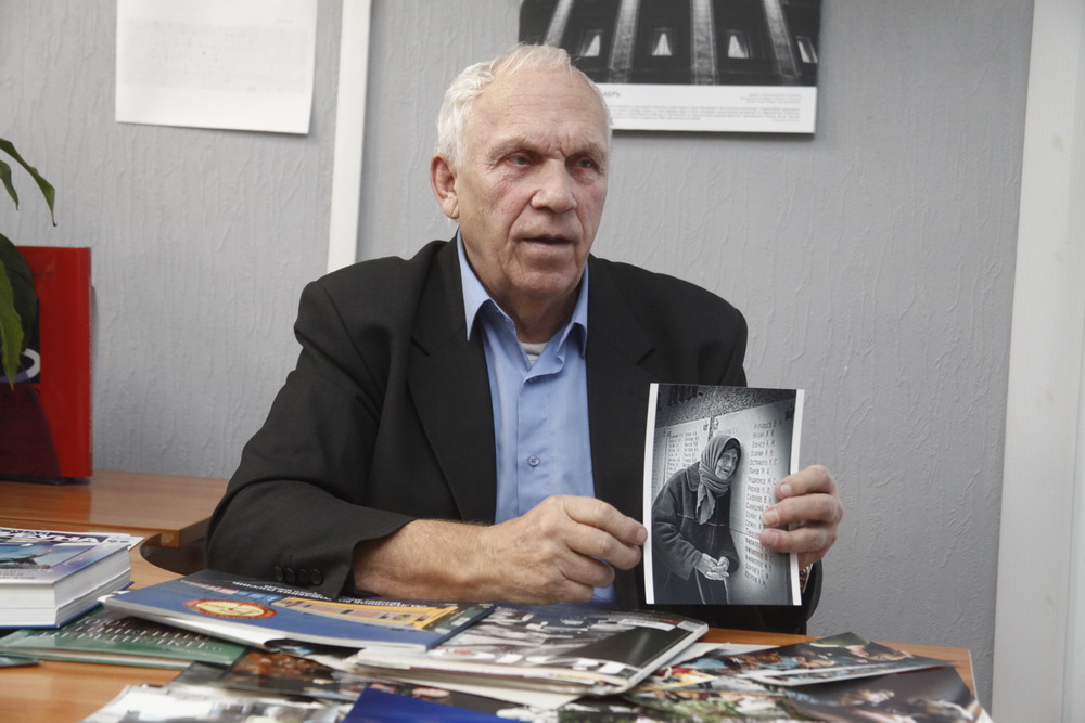 Рассказал он и ещё одну трогательную историю, которая началась во время его поездки в Москву: «В 1999 году летал в командировку и перед обратным рейсом поехал на Красную площадь. Подхожу к Вечному огню и вижу: идёт бабушка и кладёт к мемориалу гвоздики. А я нажимаю на затвор — всё, поймал. Я собираюсь спросить у неё имя и фамилию, но в этот момент меня останавливает капитан милиции, просит документы. Вцепился в меня и не дал мне подойти к женщине, спросить фамилию. Я тогда расстроился, что кадр хороший, а имени не знаю. Редакция журнала „Правопорядок“ попросила у меня этот снимок на 9 Мая. И эта женщина увидела себя на обложке журнала, поскольку работала в Ленинской библиотеке. Она написала письмо в редакцию, поблагодарила и рассказала о себе — сообщила, что её сыновья и муж погибли на войне».