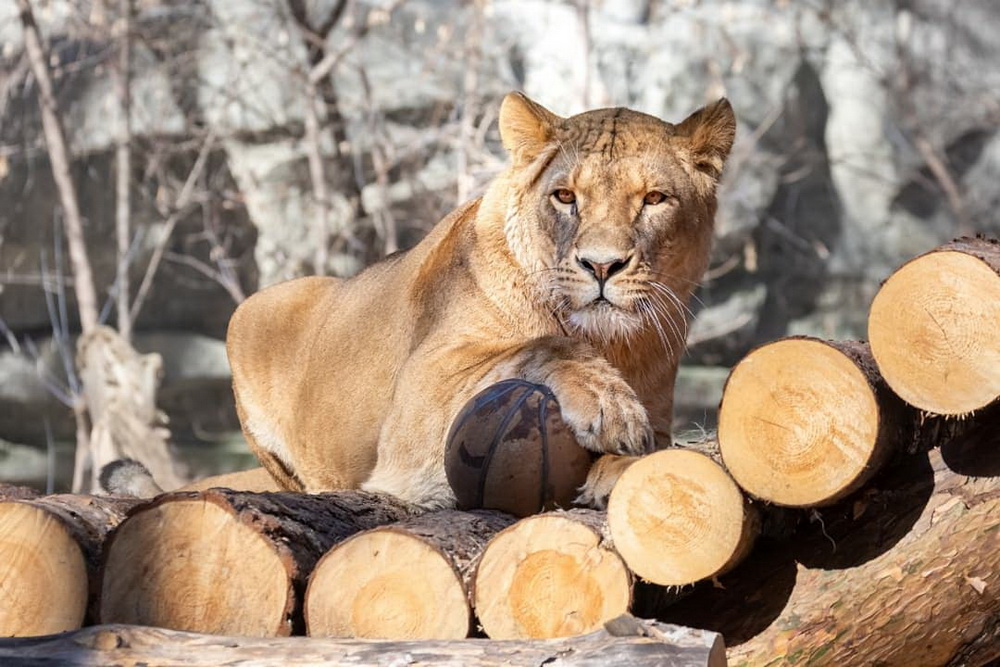 Пополнение и у кошачьих: льву Сэму долго не могли подобрать пару. Без семьи ему было одиноко, ведь львы по природе — социальные животные. Подругу из Санкт-Петербурга — молодую самочку Найтирию — сначала поселили отдельно. Сейчас львы привыкают жить вместе.
