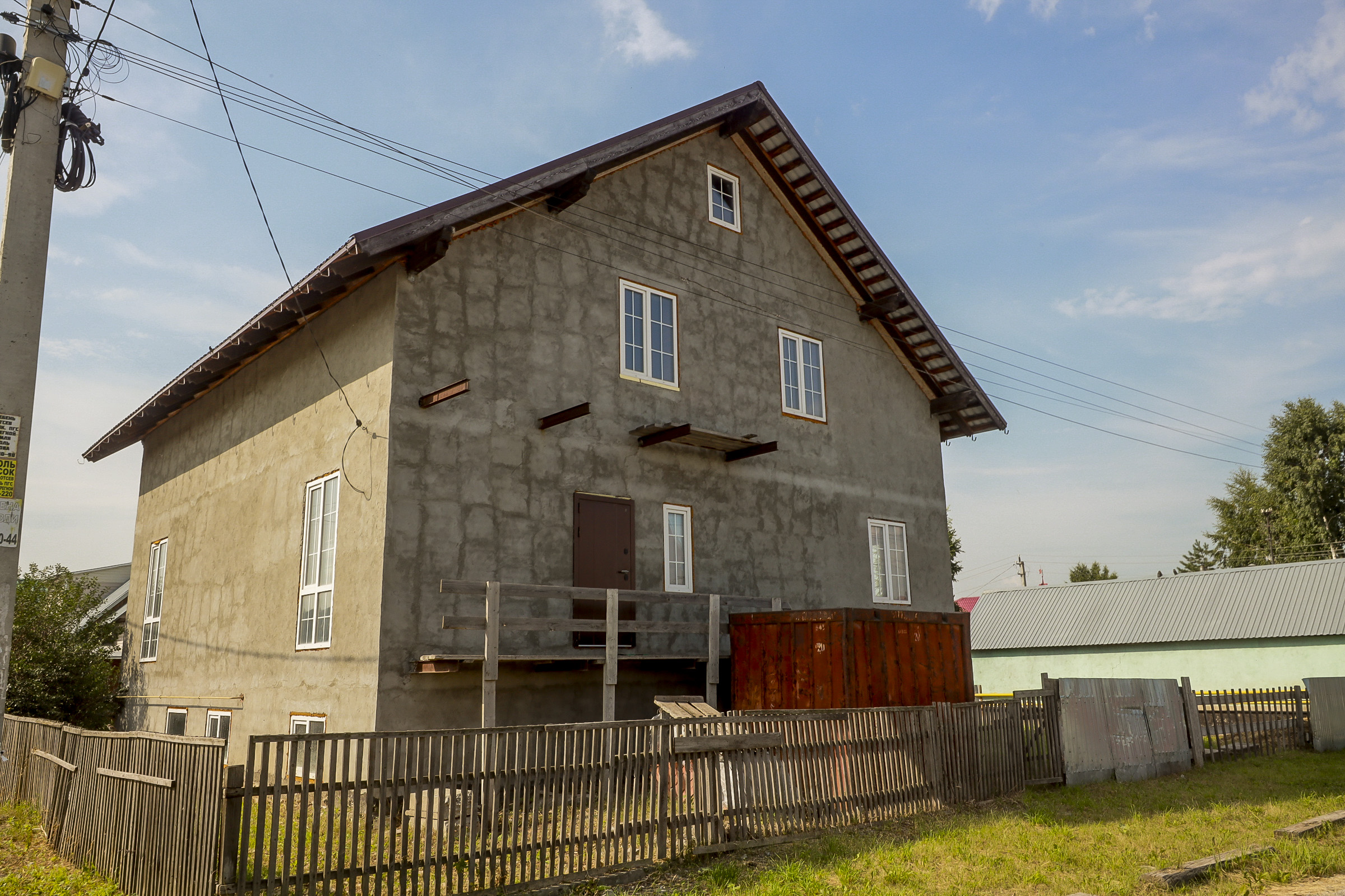 Это бревенчатая изба с редким планировочным решением — крытым переходом к уличному туалету.