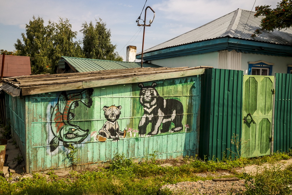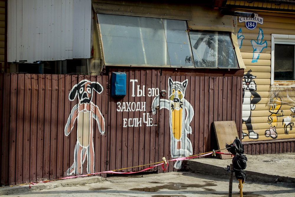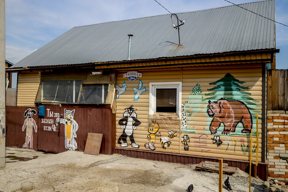 Ещё одна достопримечательность улицы Степной — дом с персонажами мультфильма «Жил-был пёс» на воротах и фасаде. Хозяйка рассказала, что рисунок сделал её знакомый художник пять лет назад.