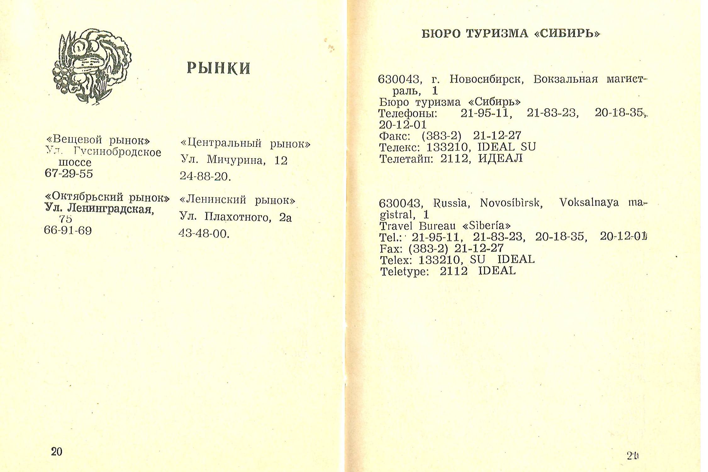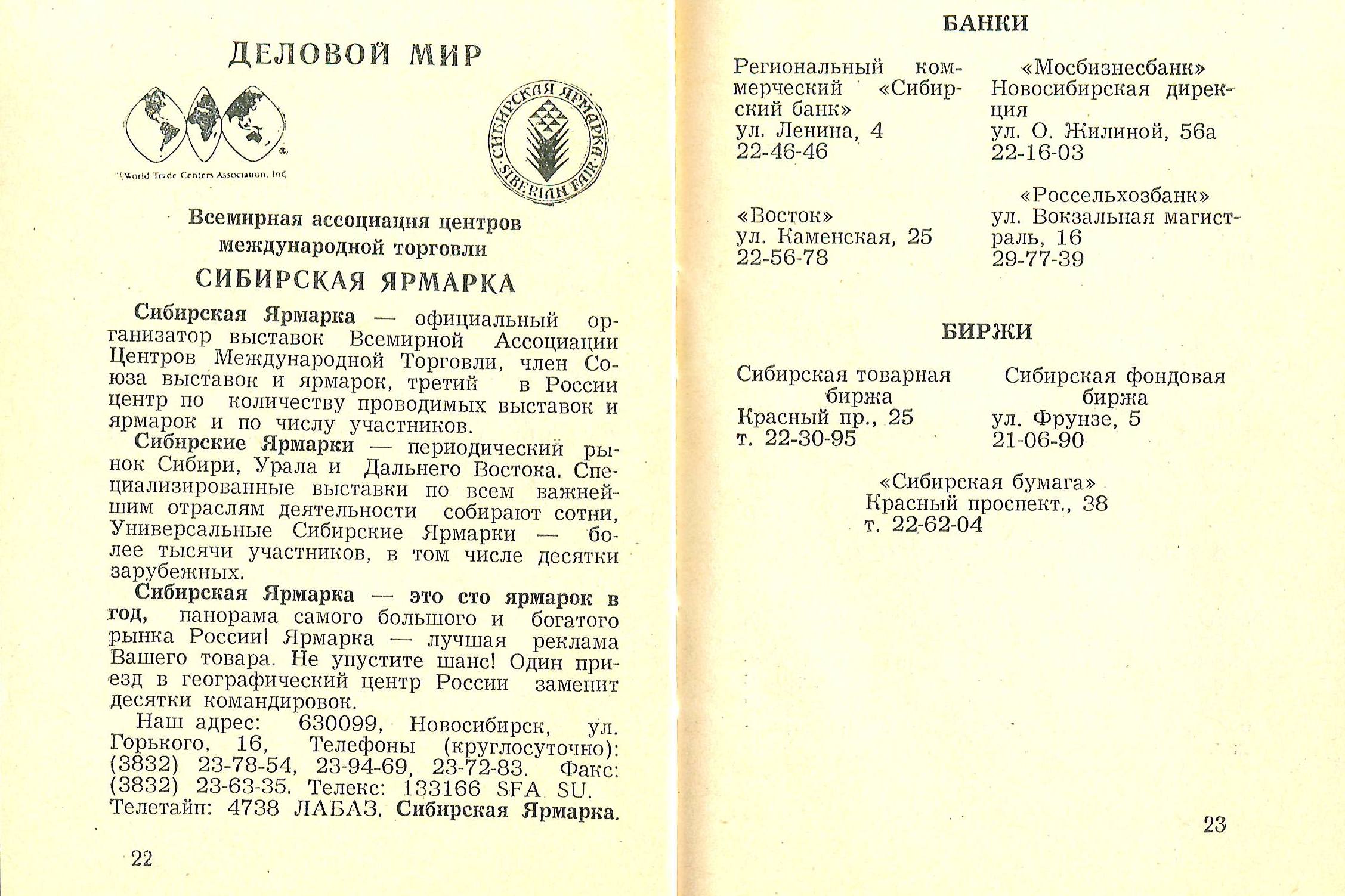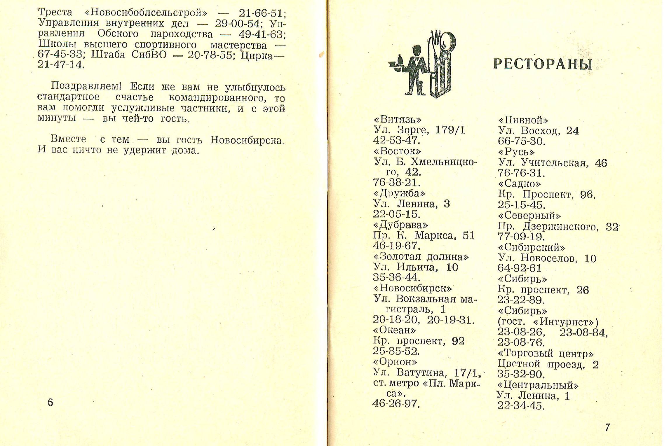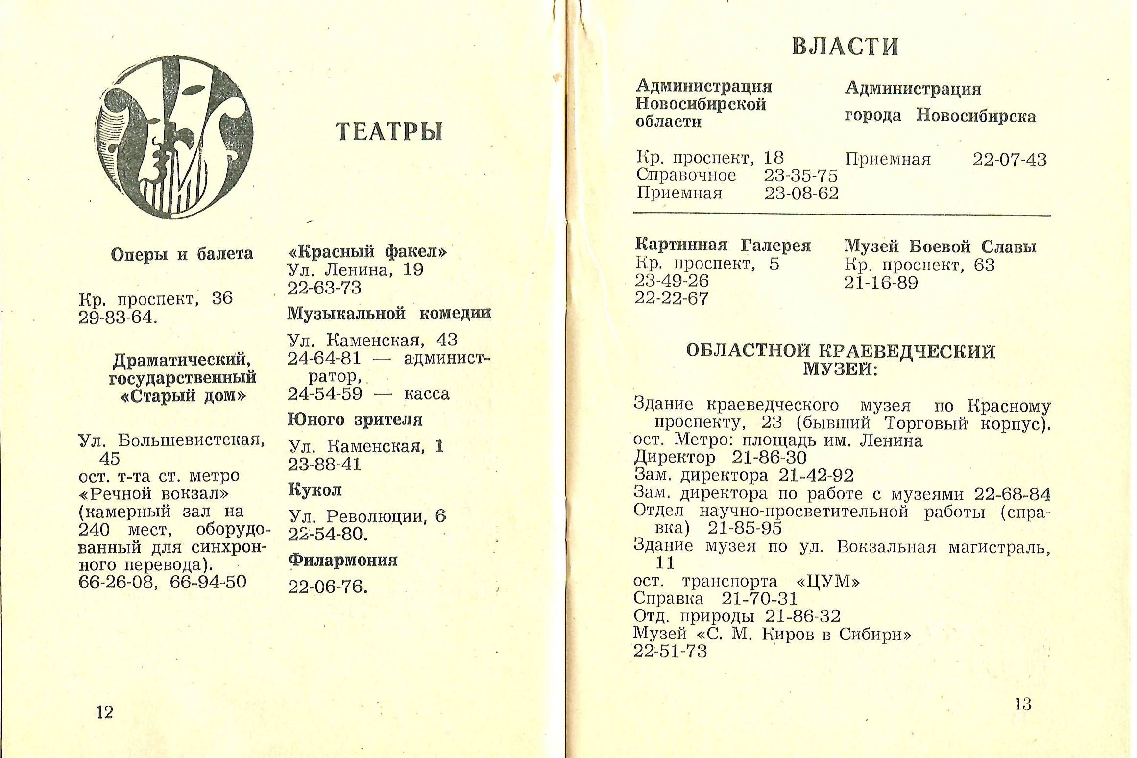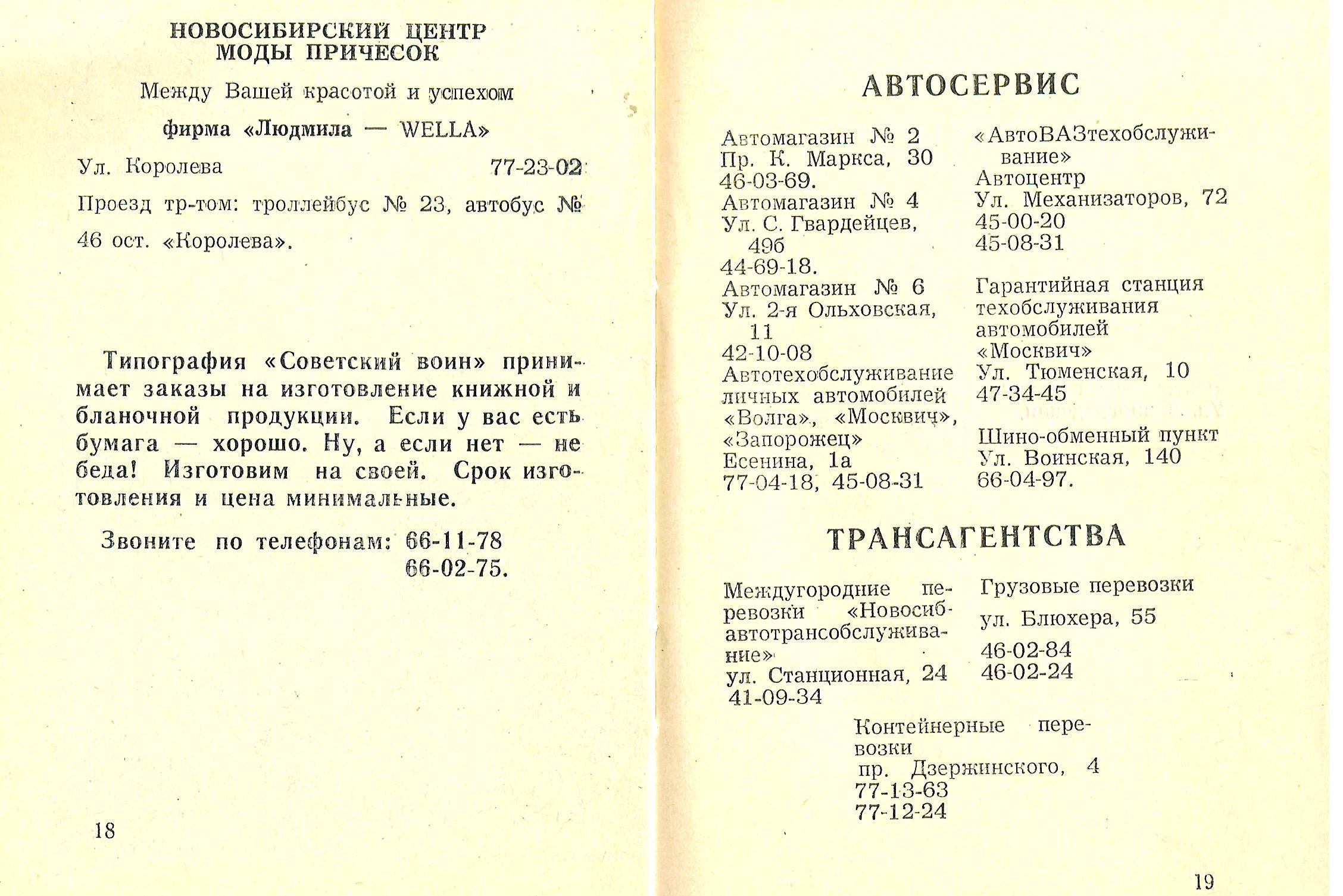 Первый разворот справочника посвящён мероприятиям, который проходили в 100-летний юбилей Новосибирска. Это всевозможные фестивали, торжества, выставки и конкурсы. Следом в отдельный раздел собраны все городские гостиницы, действующие на тот момент в Новосибирске. Их всего шесть! Составители справочника советуют тем, кому не удалось поселиться в одной из них, попробовать обратиться по телефонам в ведомственные гостиницы. Их оказалось 19. Затем идут два раздела с ресторанами и кафе. За ними список кинотеатров. Отметим, что не все они дожили до наших дней. На следующих страницах размещена информация о рынках, банках, биржах, транспортных компаниях и АЗС.