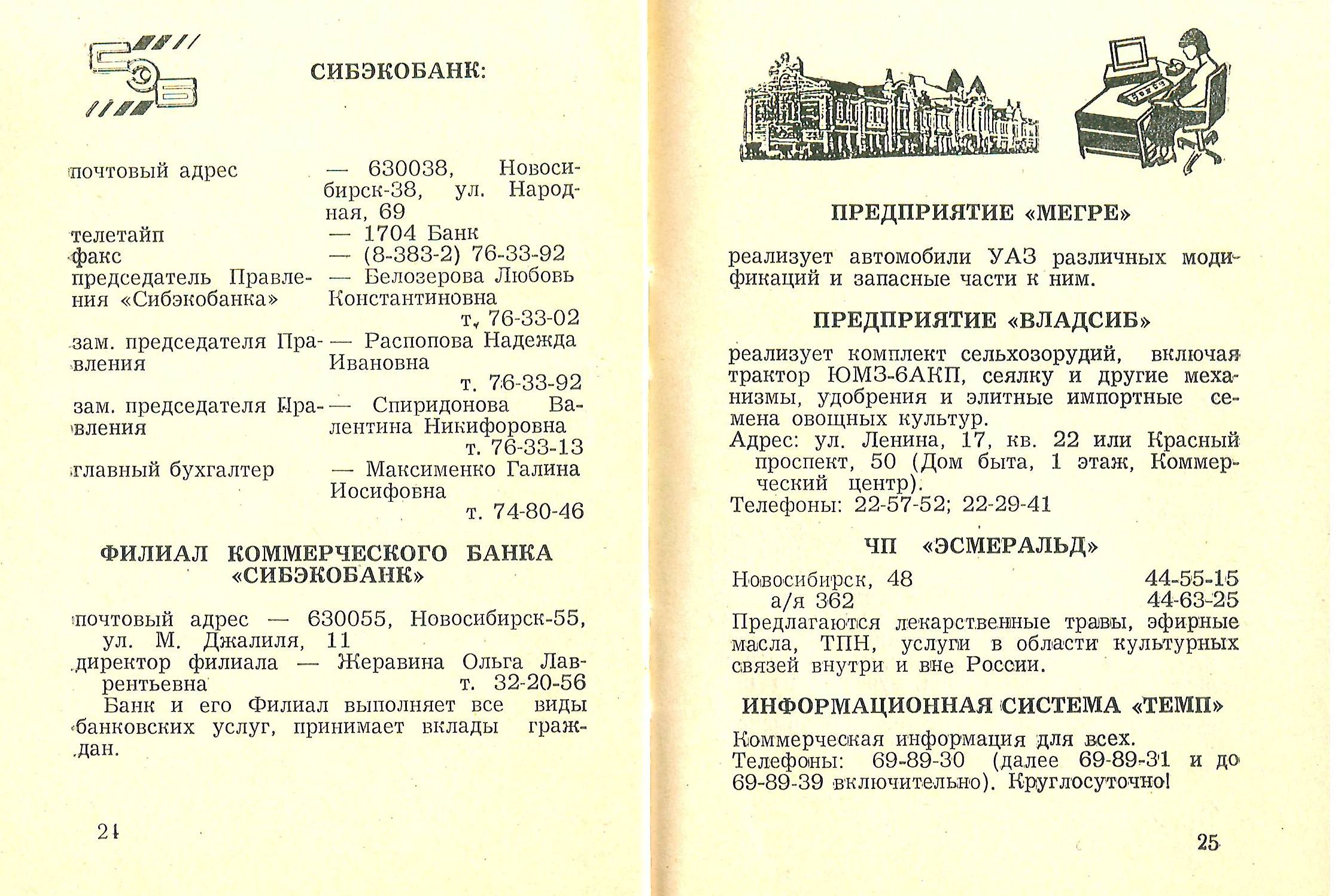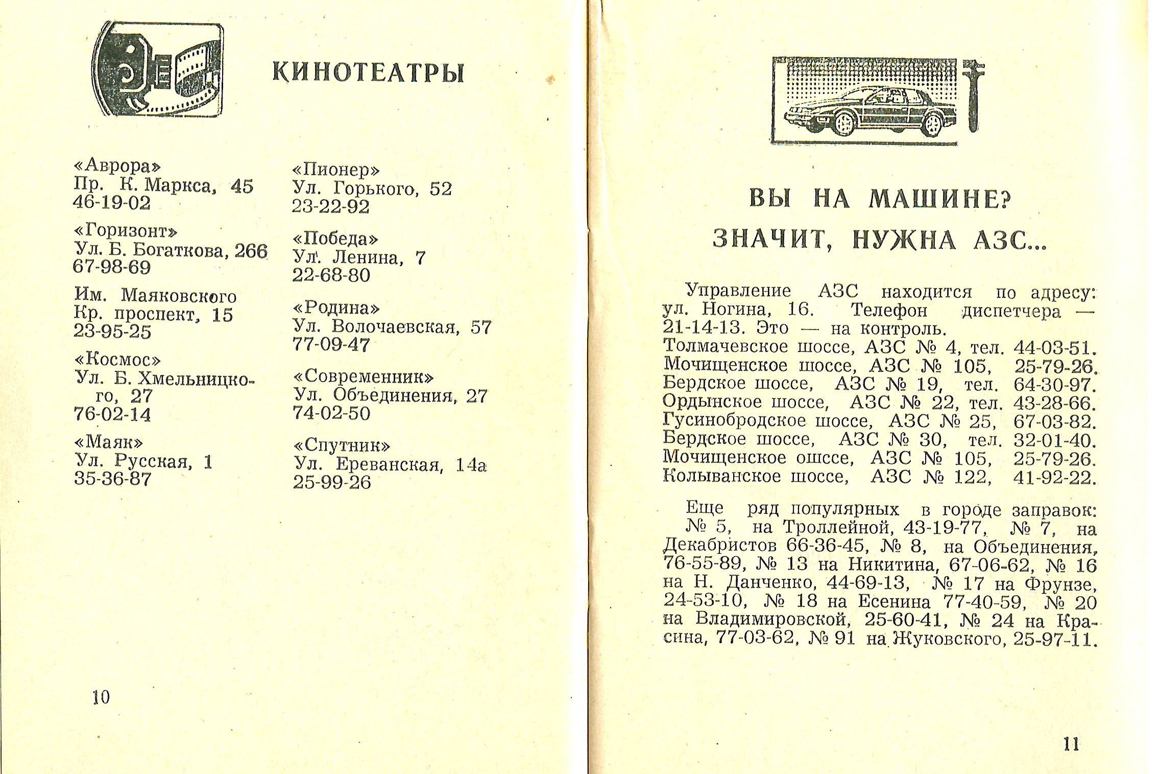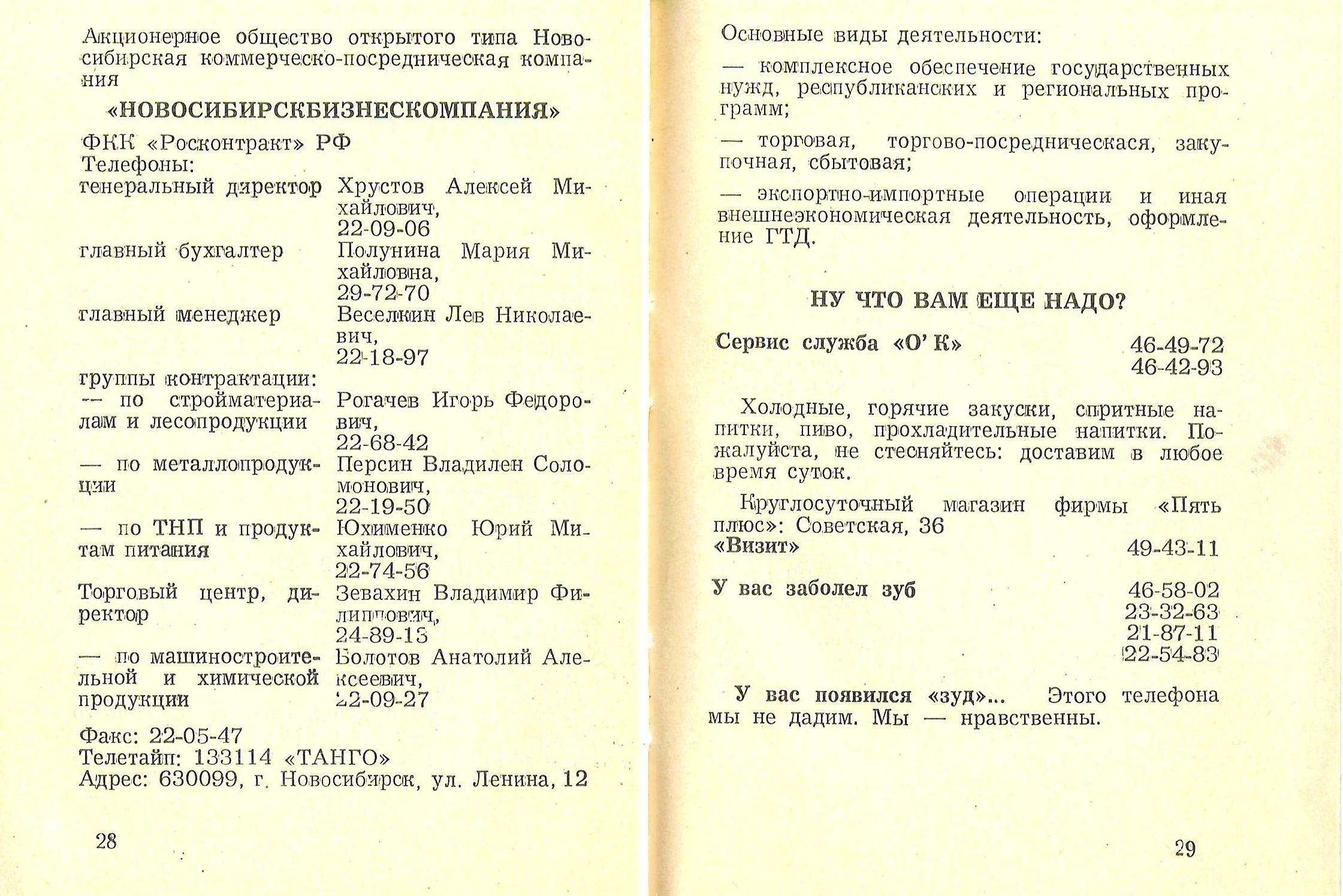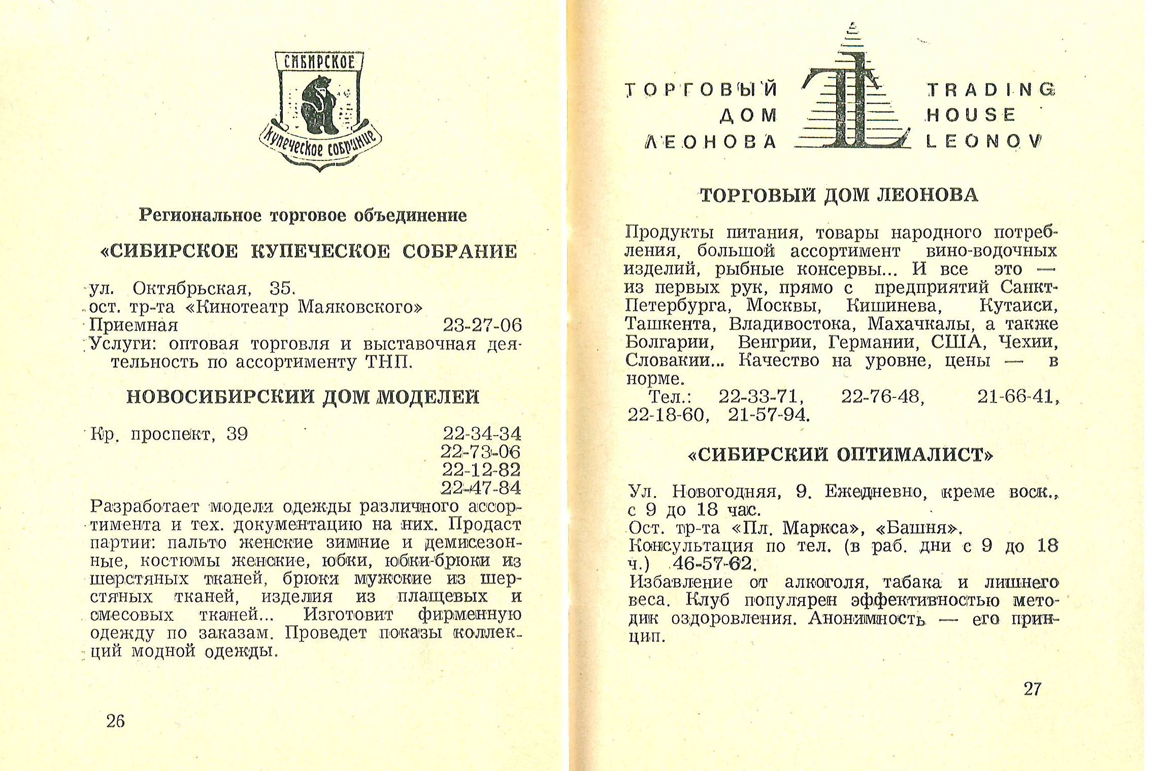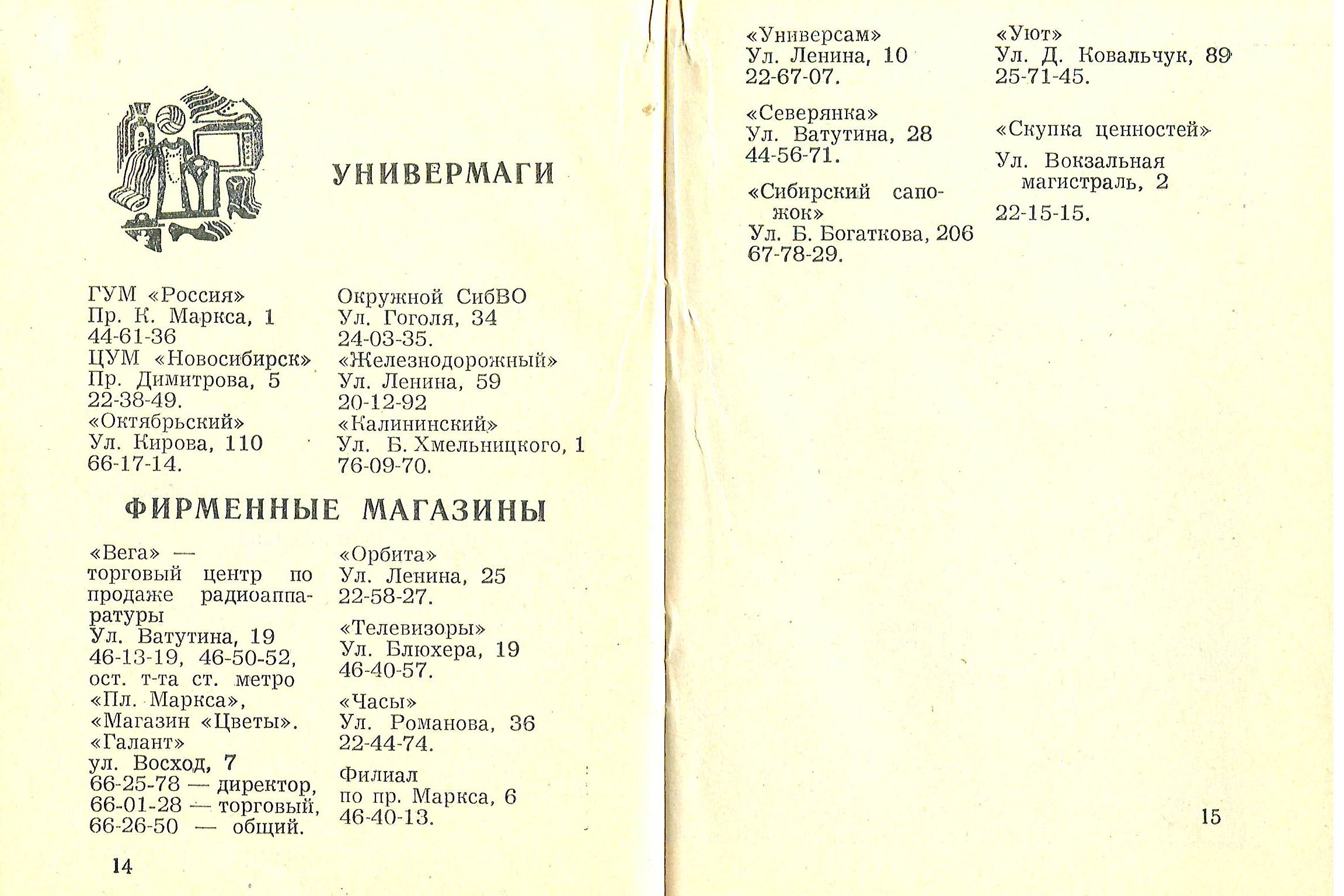 Первый разворот справочника посвящён мероприятиям, который проходили в 100-летний юбилей Новосибирска. Это всевозможные фестивали, торжества, выставки и конкурсы. Следом в отдельный раздел собраны все городские гостиницы, действующие на тот момент в Новосибирске. Их всего шесть! Составители справочника советуют тем, кому не удалось поселиться в одной из них, попробовать обратиться по телефонам в ведомственные гостиницы. Их оказалось 19. Затем идут два раздела с ресторанами и кафе. За ними список кинотеатров. Отметим, что не все они дожили до наших дней. На следующих страницах размещена информация о рынках, банках, биржах, транспортных компаниях и АЗС.