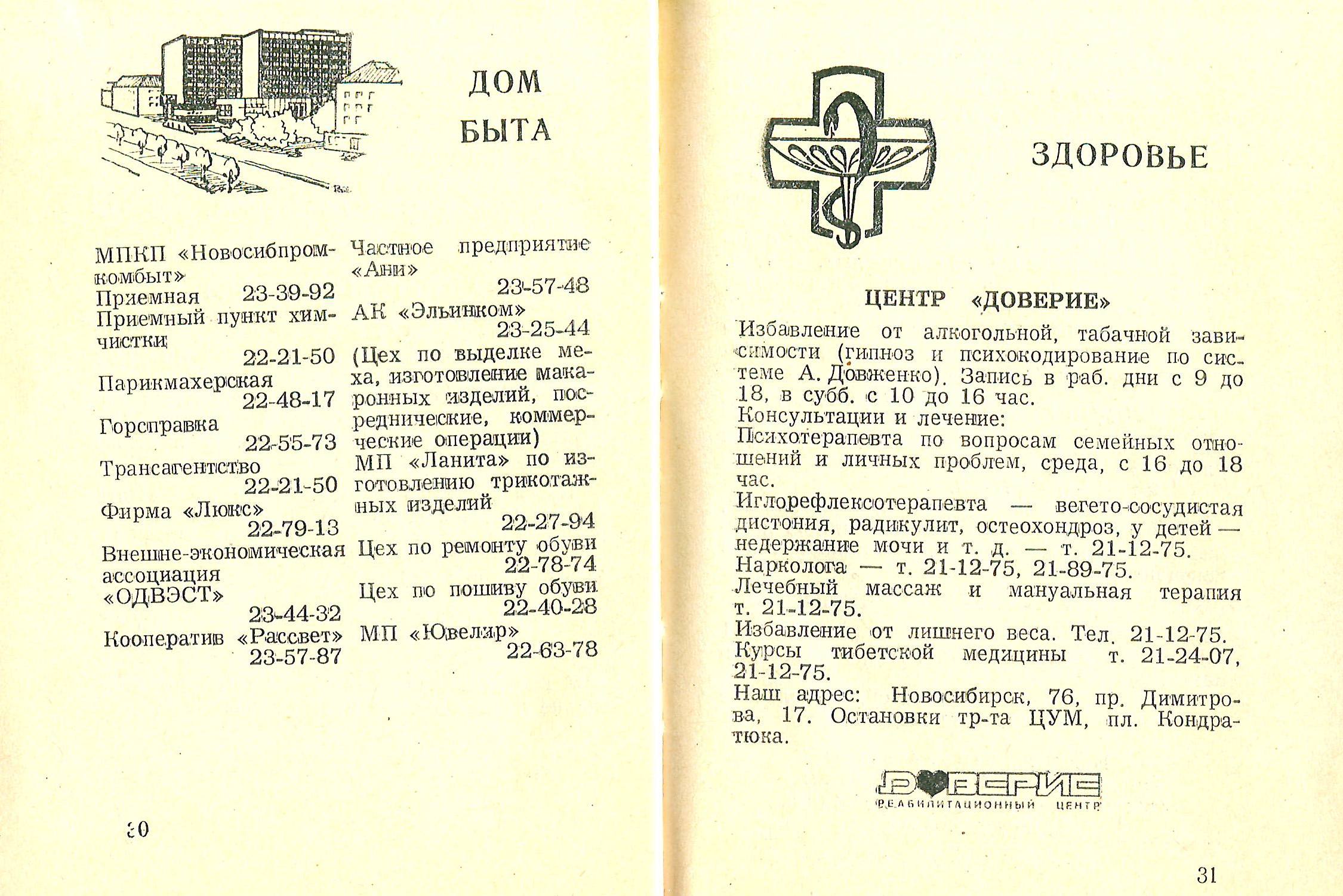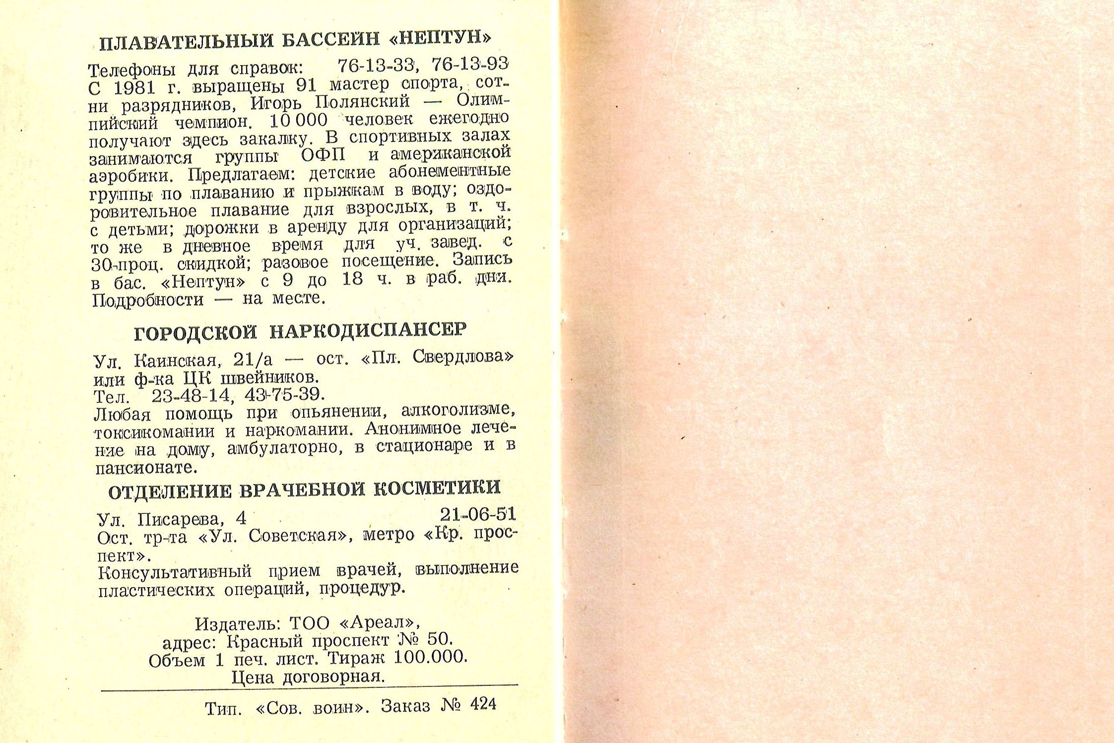 По-настоящему исторический документ оказался в распоряжении редакции «Новосибирских новостей» — справочник по нашему городу за 1993 год. Его выпустили в год векового юбилея Новосибирска тиражом 100 000 экземпляров. Предназначался справочник не только для приезжих, но и для новосибирцев. Это тоненькая книжка из 30 страниц, где можно найти исчерпывающую информацию о магазинах, рынках, театрах, кинотеатрах, ресторанах и кафе, работавших в нашем городе 30 лет назад. Есть там даже...