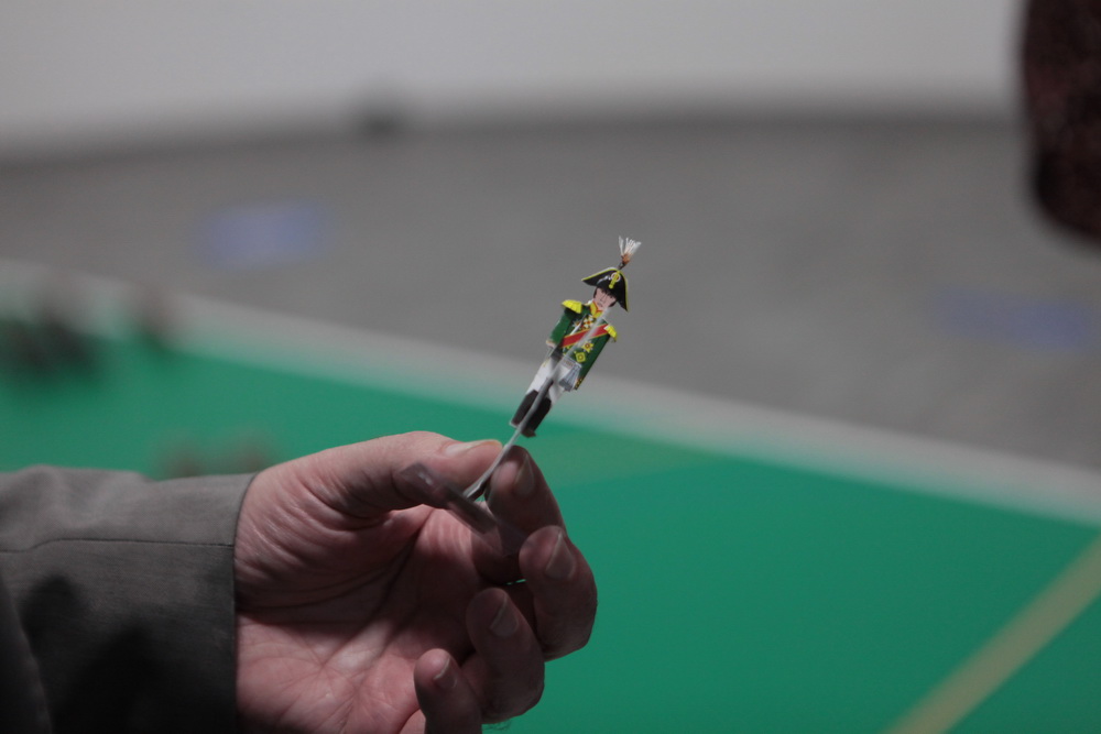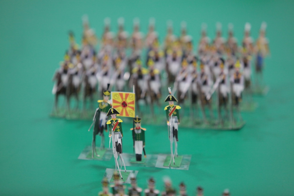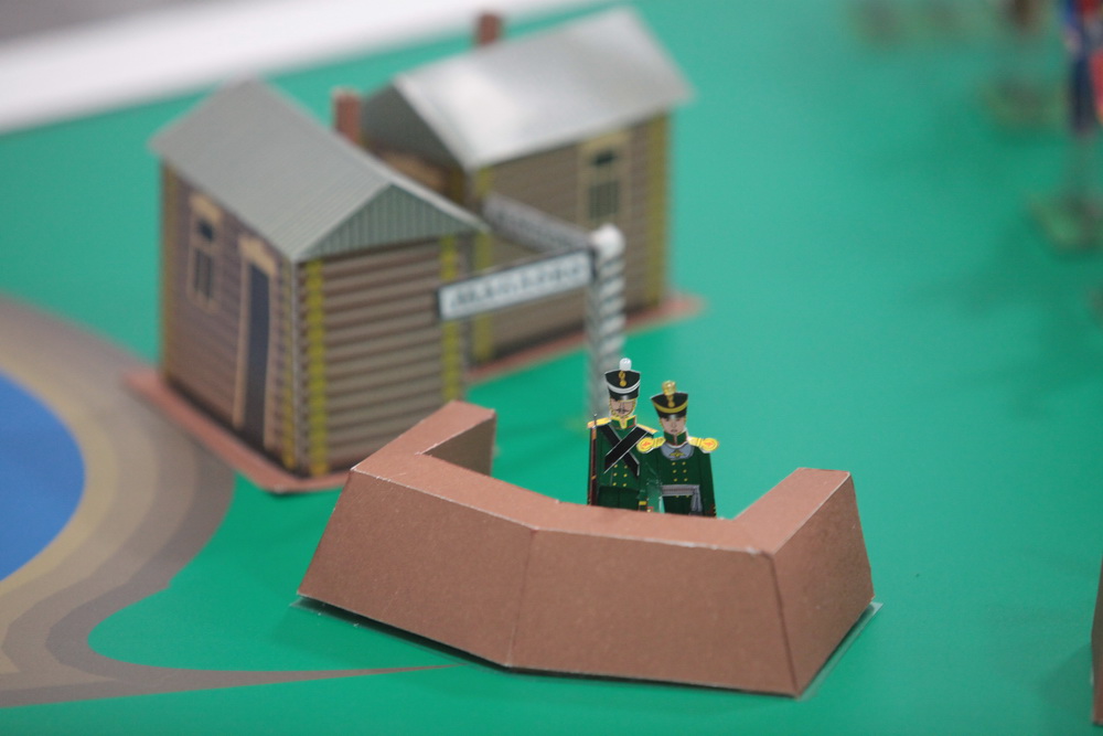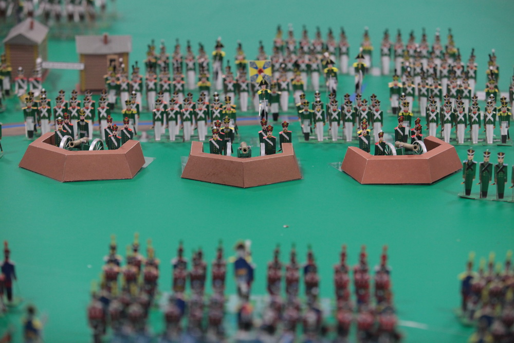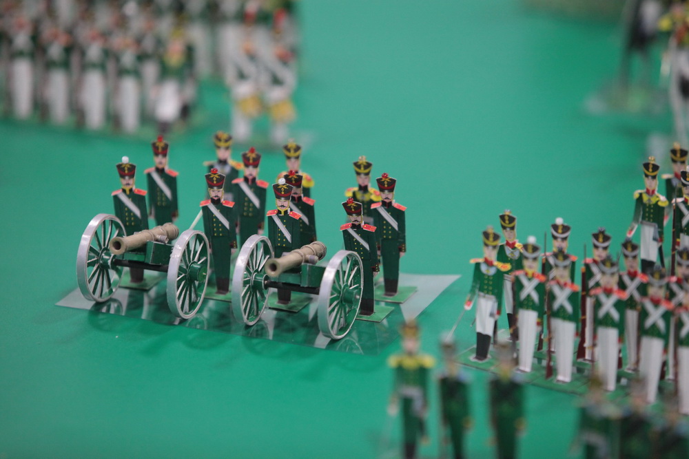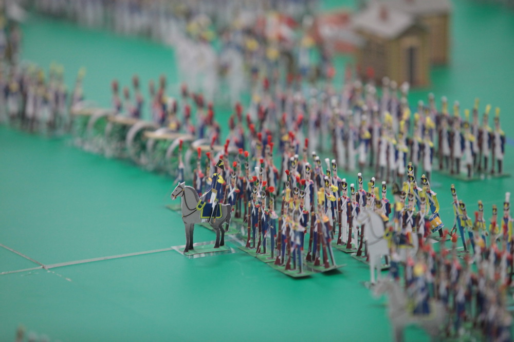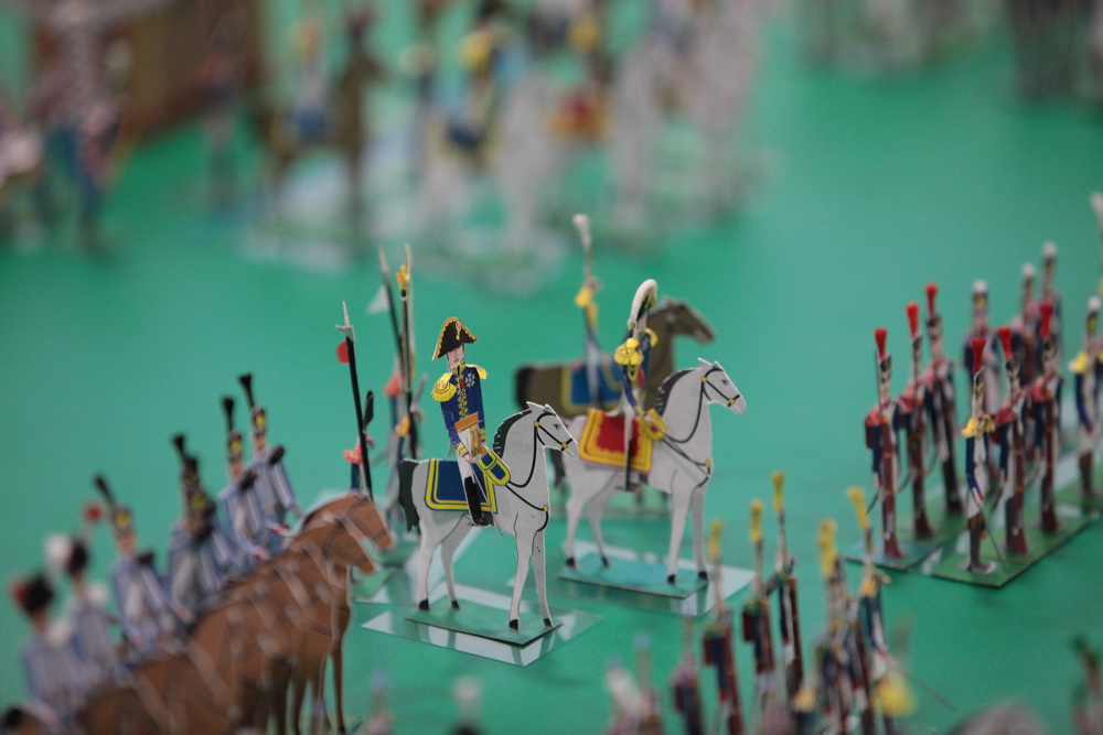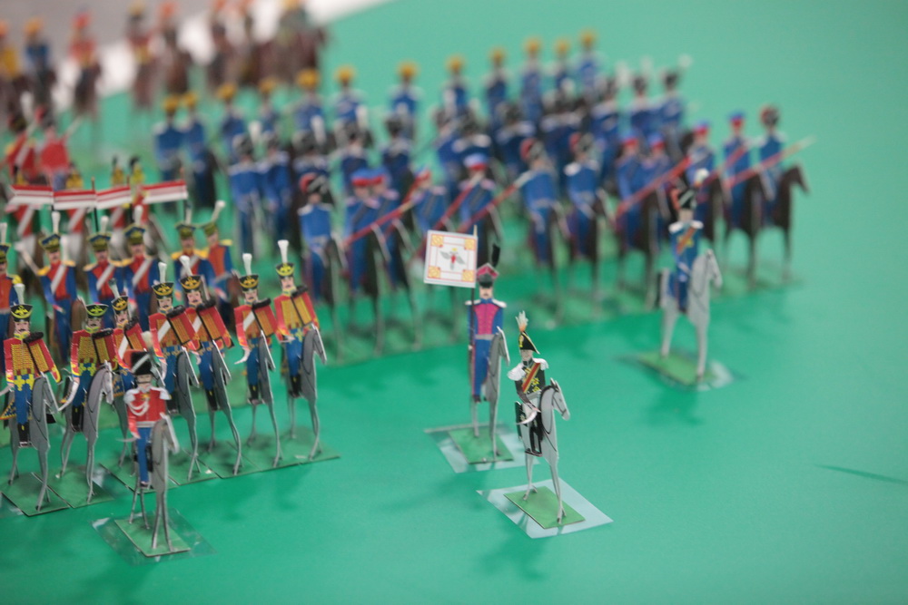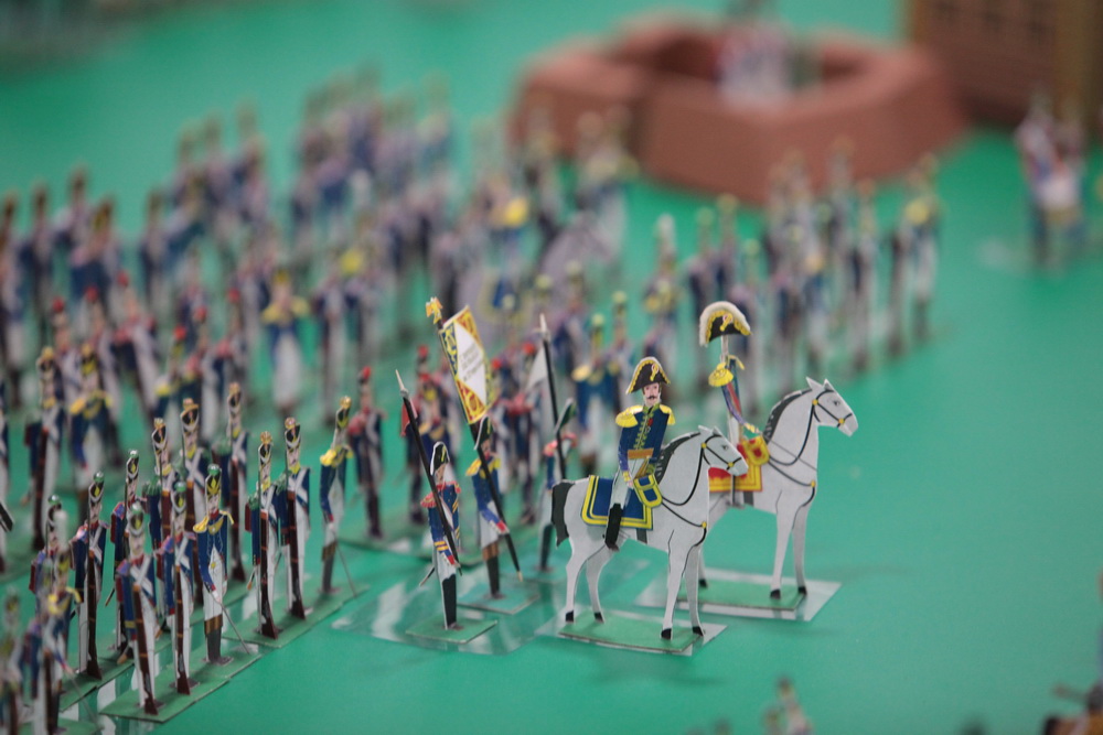 Каждый солдатик выполнен из бумаги и картона в масштабе 1:32 с точностью до мелочей. Одна фигурка на макете символизирует 100 реальных участников битвы. Это соответствует 138 000 французских войск и 128 000 русских войск. Если как следует присмотреться, то на солдатиках можно увидеть меховые шапки, у офицеров есть шпаги и сабли, у гусар — перья в головных уборах.