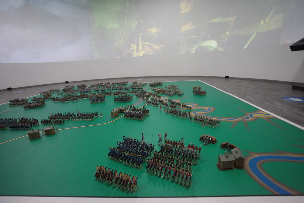 Макет демонстрирует первую фазу Бородинского сражения — одной из самых кровопролитных однодневных битв. Кроме того, на специальном мониторе показан ход столкновений, названы все тактические приёмы, имена командовавших частями генералов.