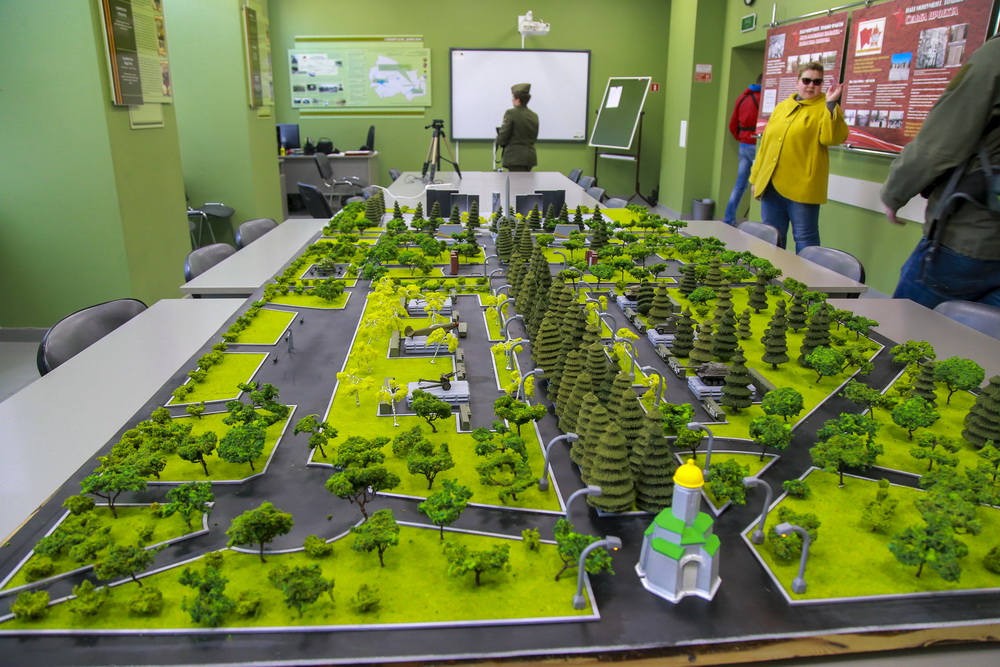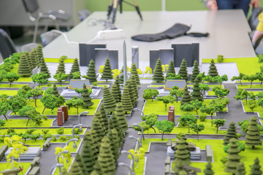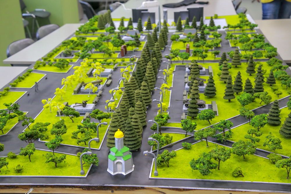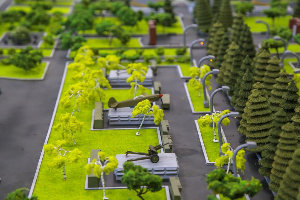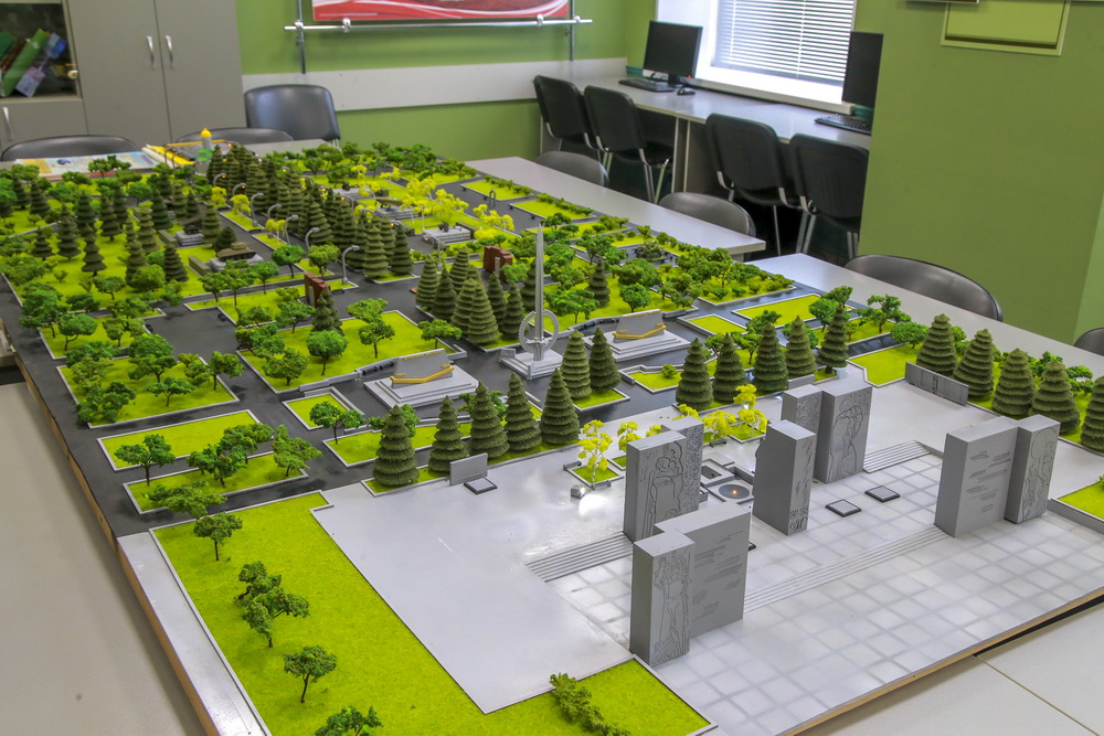 «Если создавать макет в одном масштабе, выдерживая все пропорции, он бы у нас был размером около 12 метров. Разместить его в нашем помещении было бы невозможно. С художественной точки зрения он был бы неинтересным. Поэтому разные элементы сделаны в разных масштабах. Нам не столько важна точность, где находится та или иная скамейка. Для нас главное — рассказать и показать, что у нас находится на Монументе Славы, какие у нас пилоны», — объяснил директор центра героико-патриотического воспитания «Пост №1» Евгений Котельников.