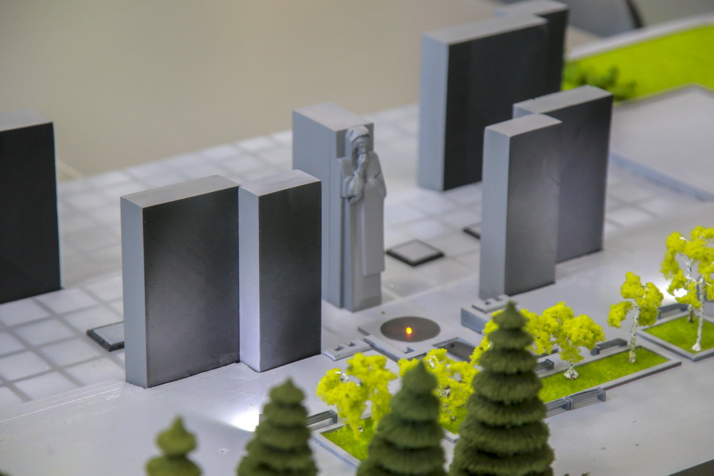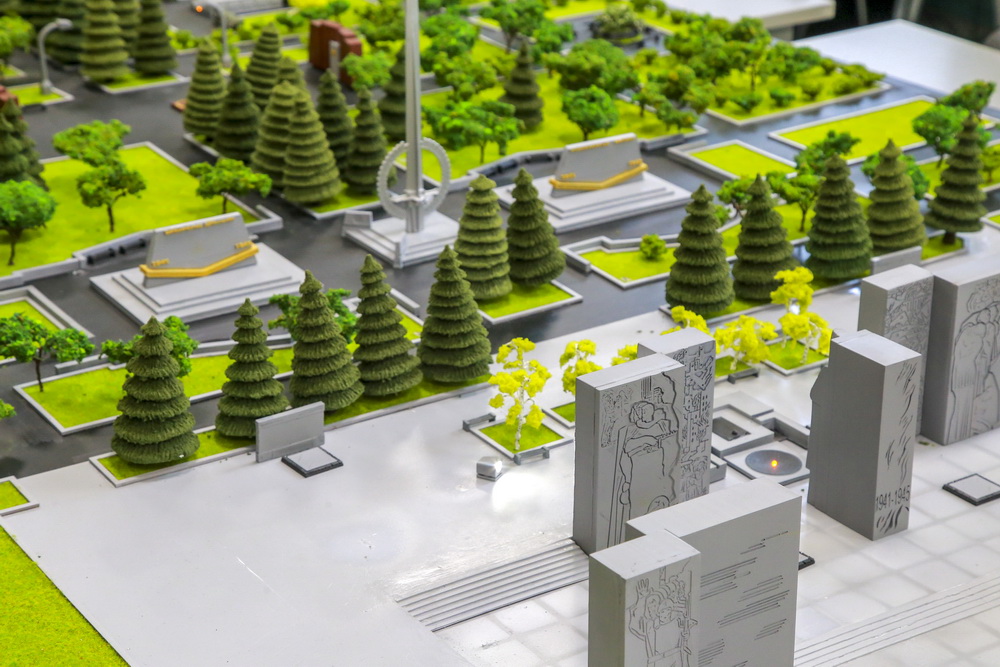 Миниатюрный Монумент Славы занимает половину большого зала — пилоны и ёлки напечатали на 3D-принтере в одном из новосибирских колледжей.