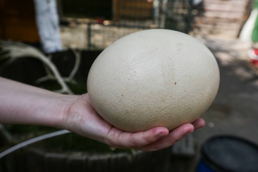 На ферме эти яйца или едят, или продают желающим попробовать. Правда, скорлупу приходится сверлить серьёзным инструментом.