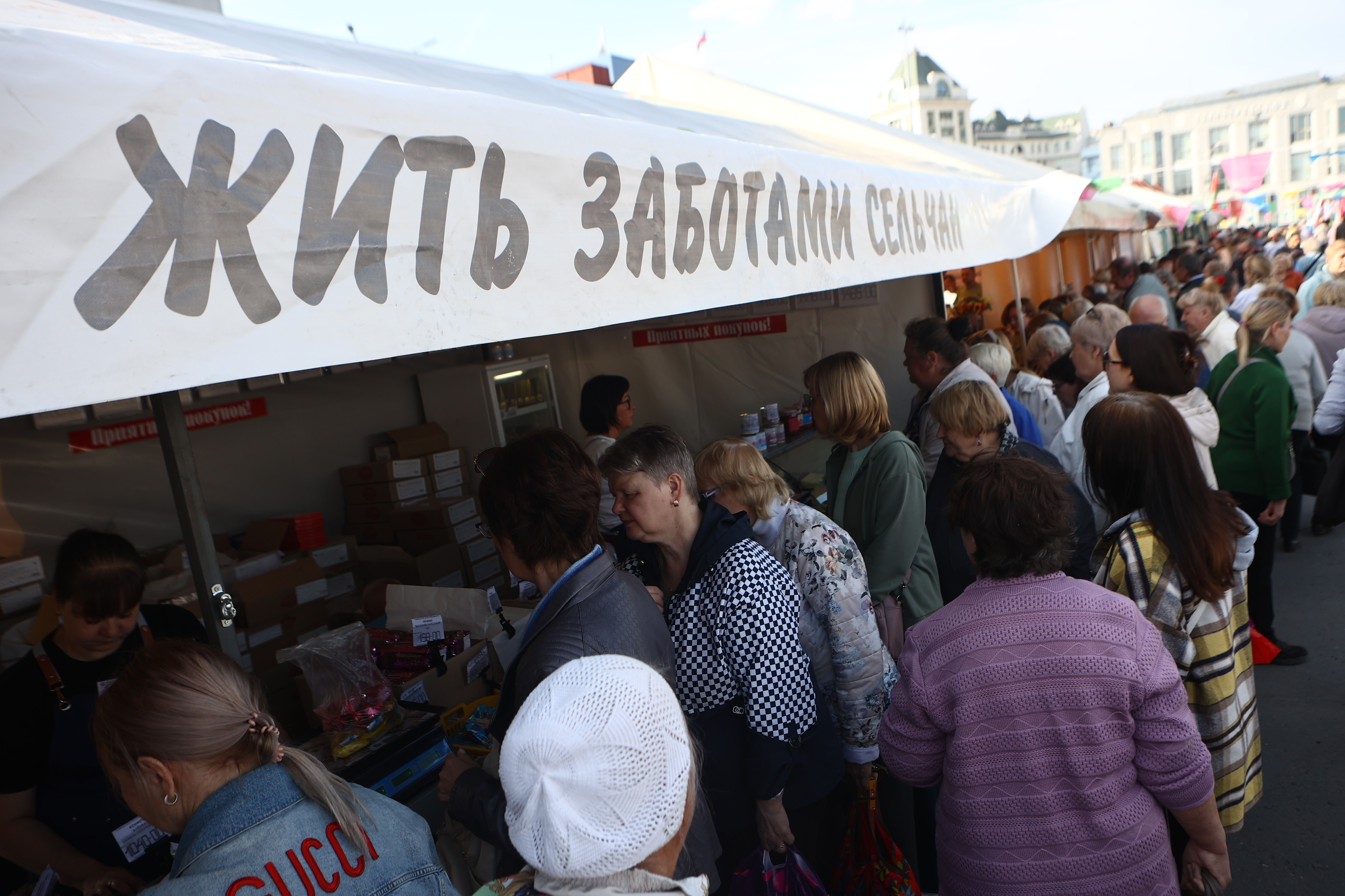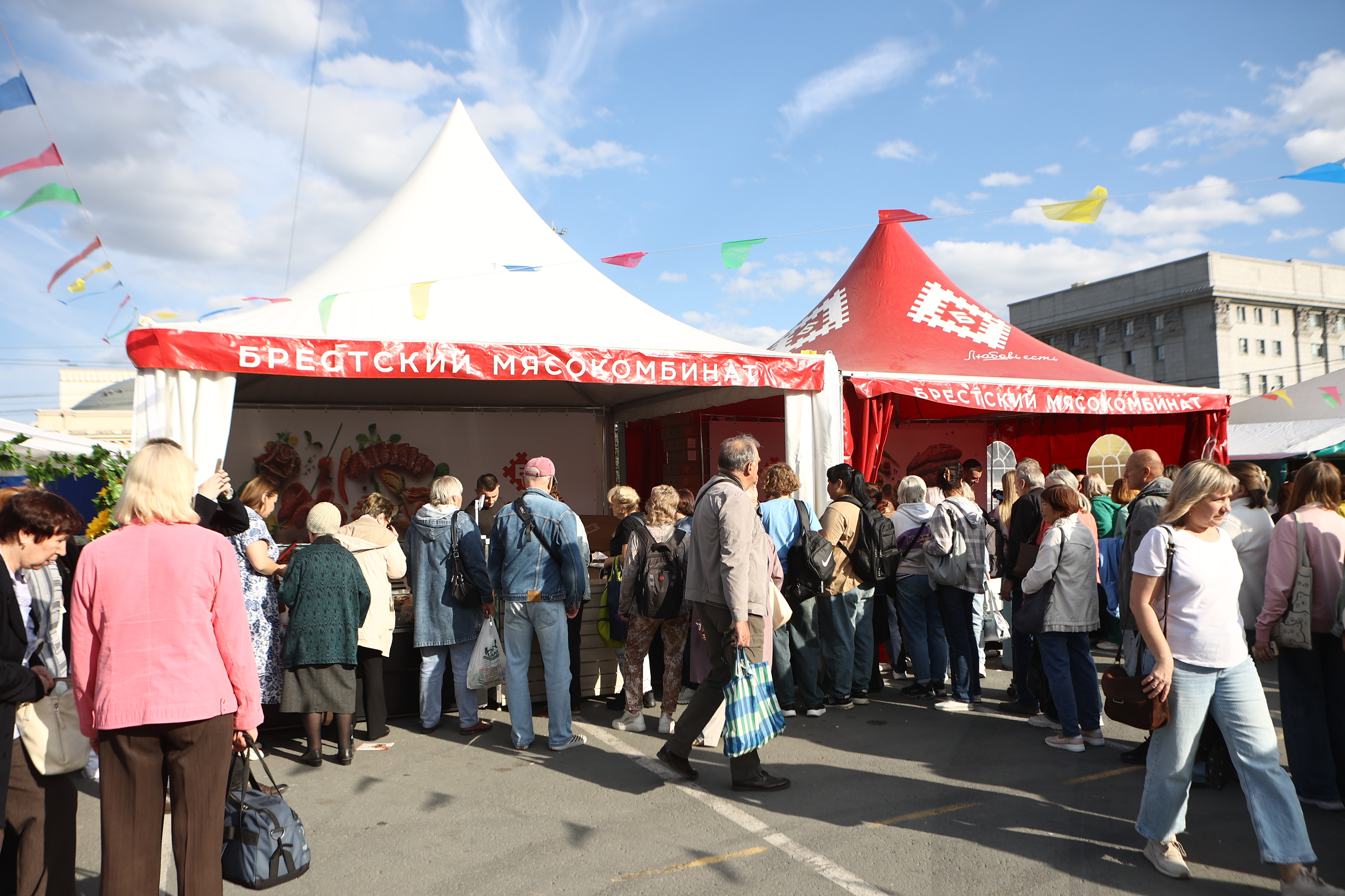 В этом году товары представляют 15 предприятий из Беларуси. Брестская и Гомельская области привезли мясную продукцию, Гродненская и Минская области — молочную, а Могилёвская — товары лёгкой промышленности. В первый день работы к палаткам выстроились очереди.