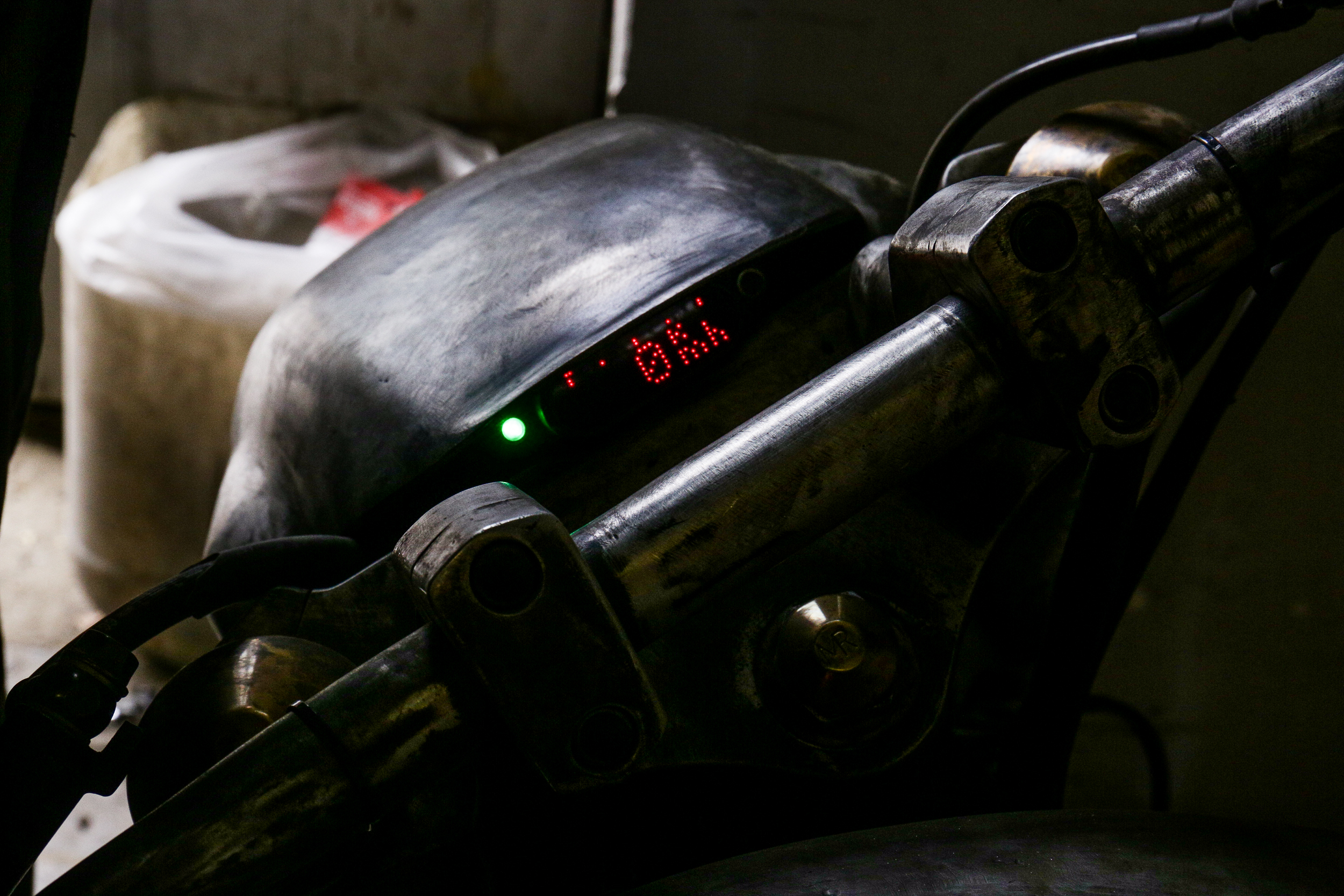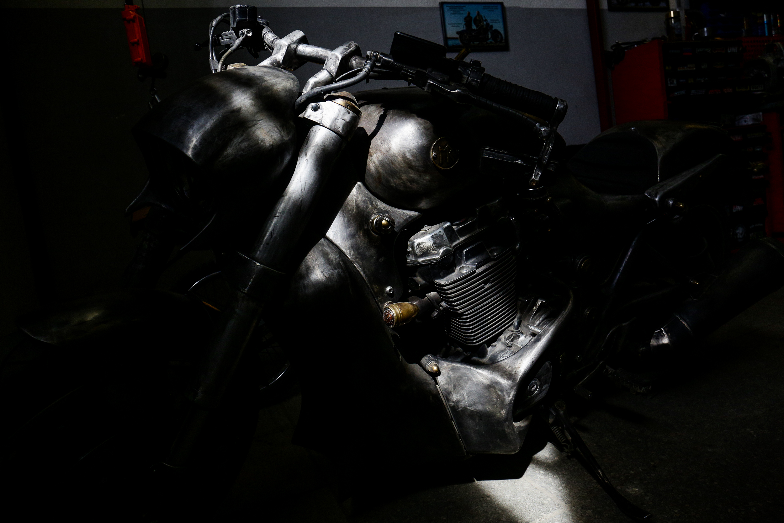 Рама, облицовка — всё самодельное, из металла — стали и титана. Этот мотоцикл не боится падений, по нему можно прыгать — с ним ничего не будет. Внутри скрывается мощная силовая структура. По тормозам и подвеске он превосходит многих стандартных собратьев. Пневмоподвеска позволяет ездить несколько часов и не чувствовать усталости. Весит он около 300 кг. Это, по словам Романа, немного.
