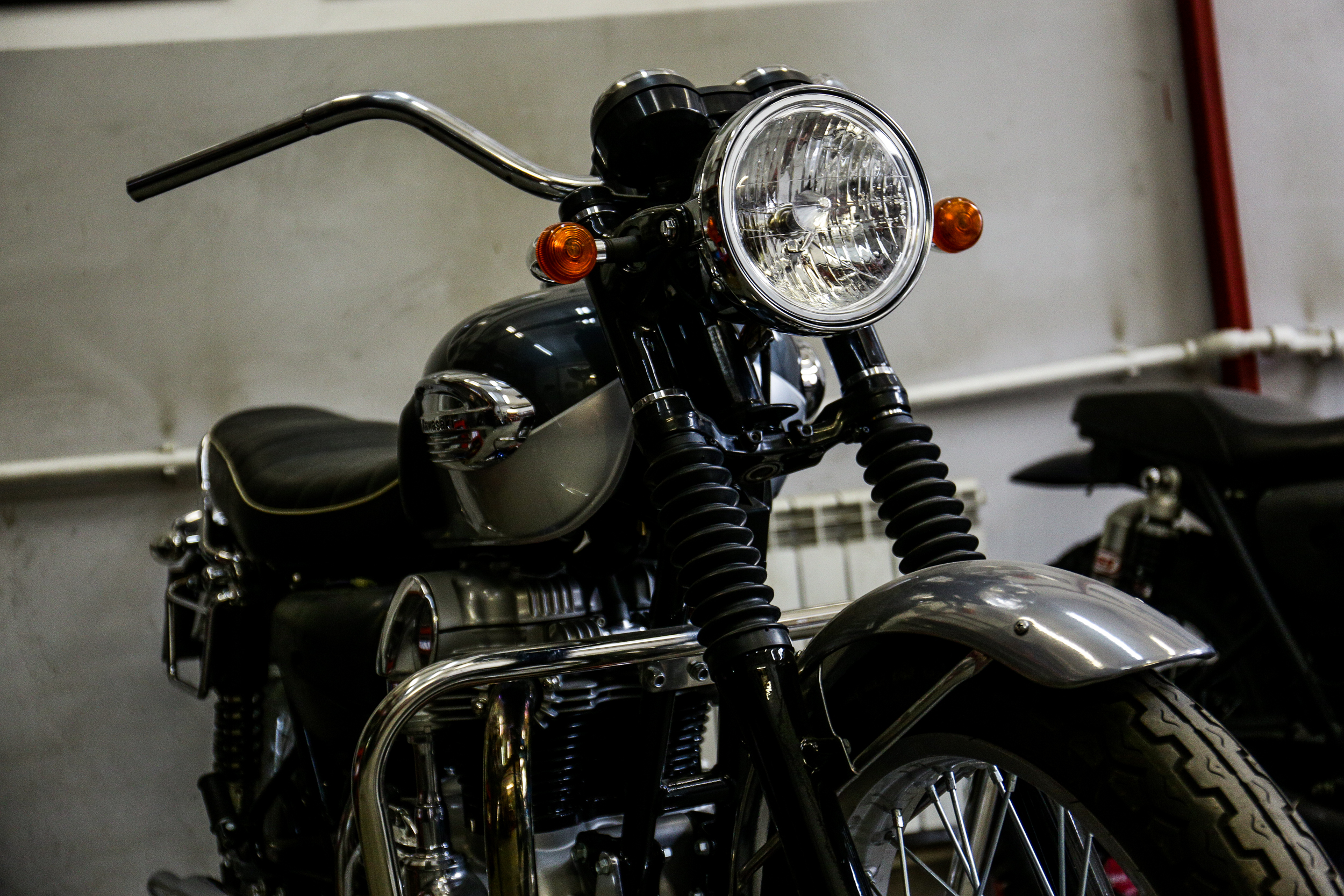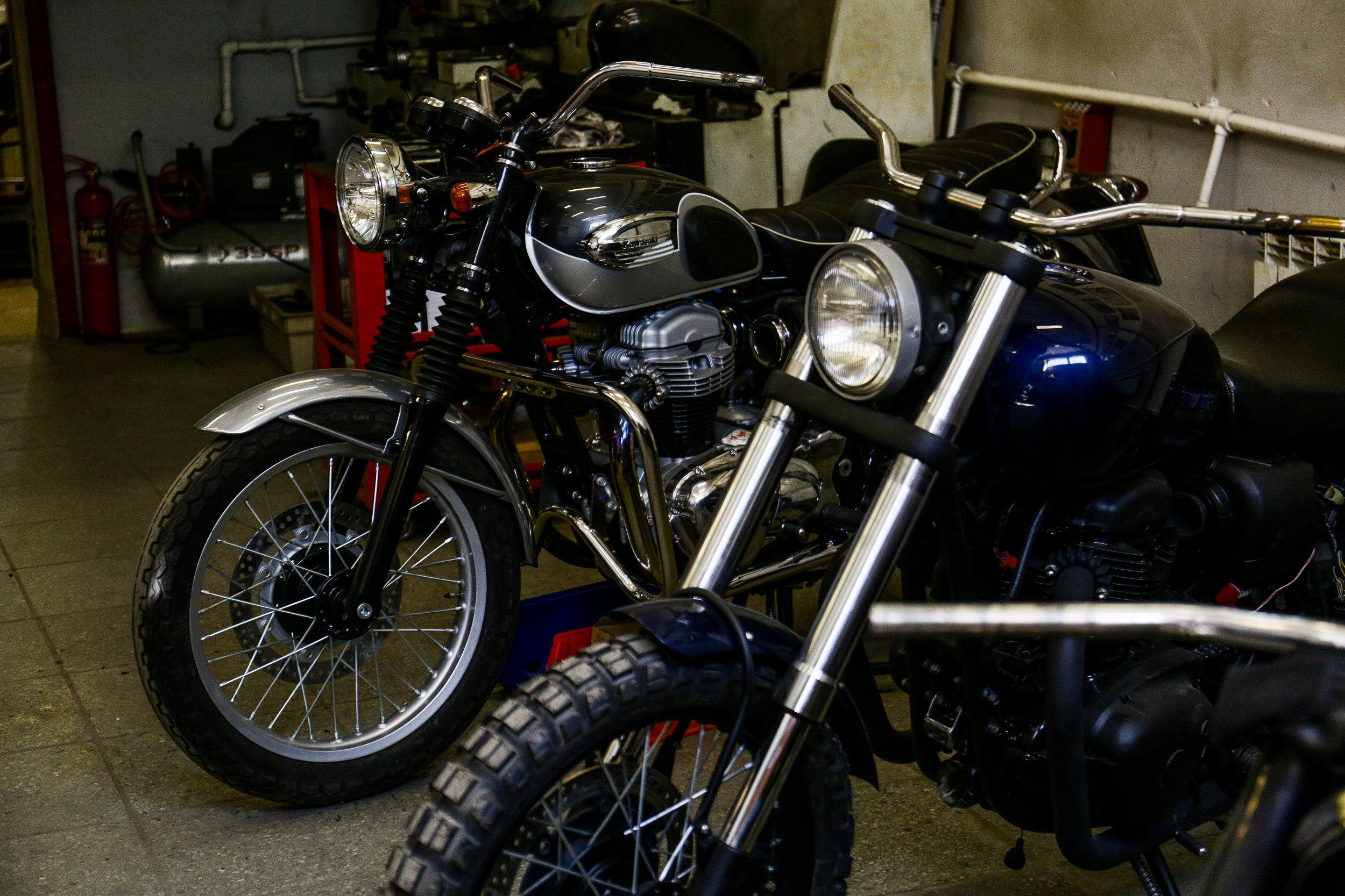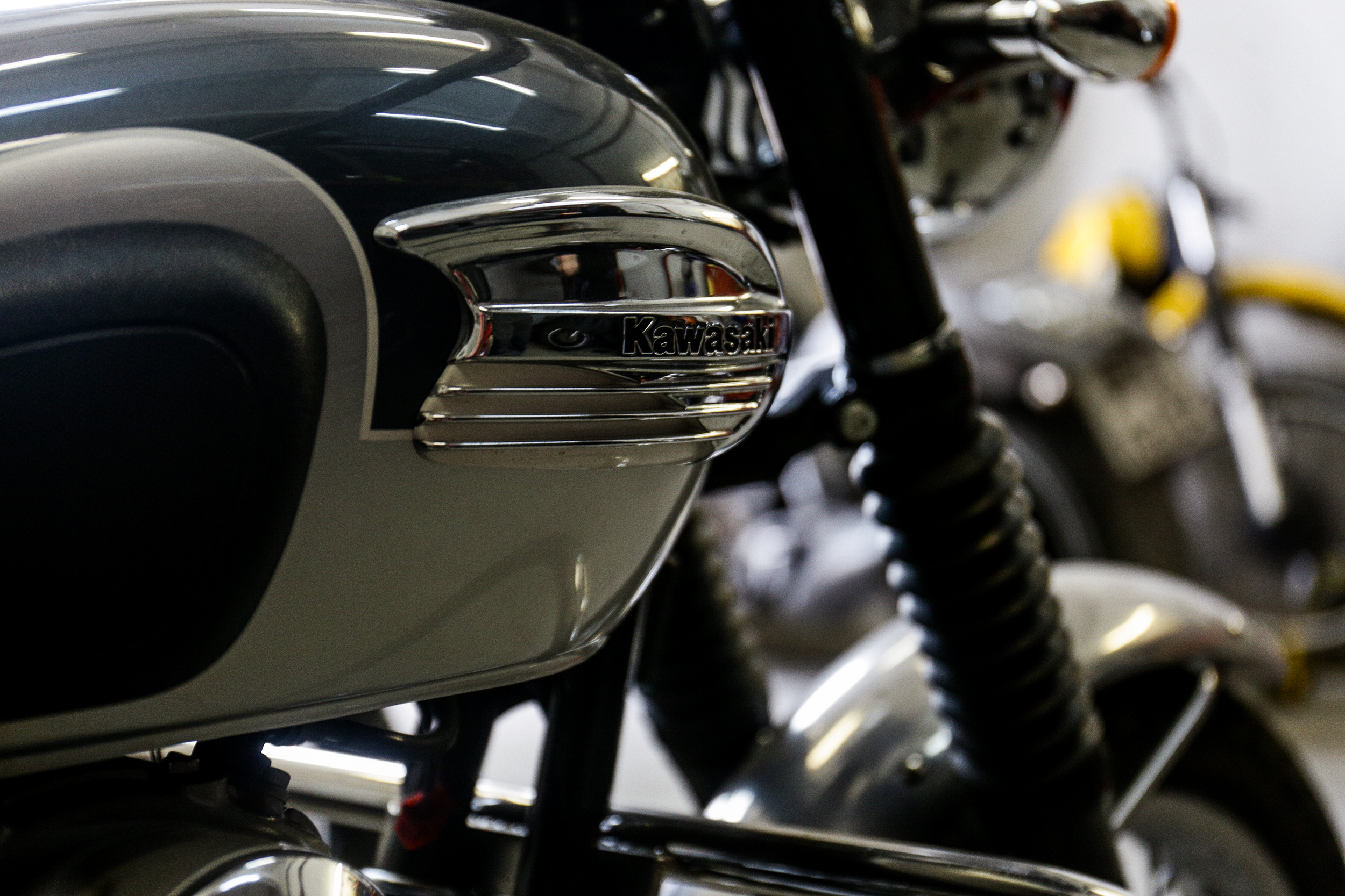 Чёрный Kawasaki пережил полную реставрацию — мастер разобрал его до винтика, снял всю краску, очистил двигатель и собрал заново в лучшем виде. «Сейчас этот мотоцикл выглядит симпатичнее, чем заводской. Потому что никто никогда не полировал вот так ему мотор», — говорит Роман.