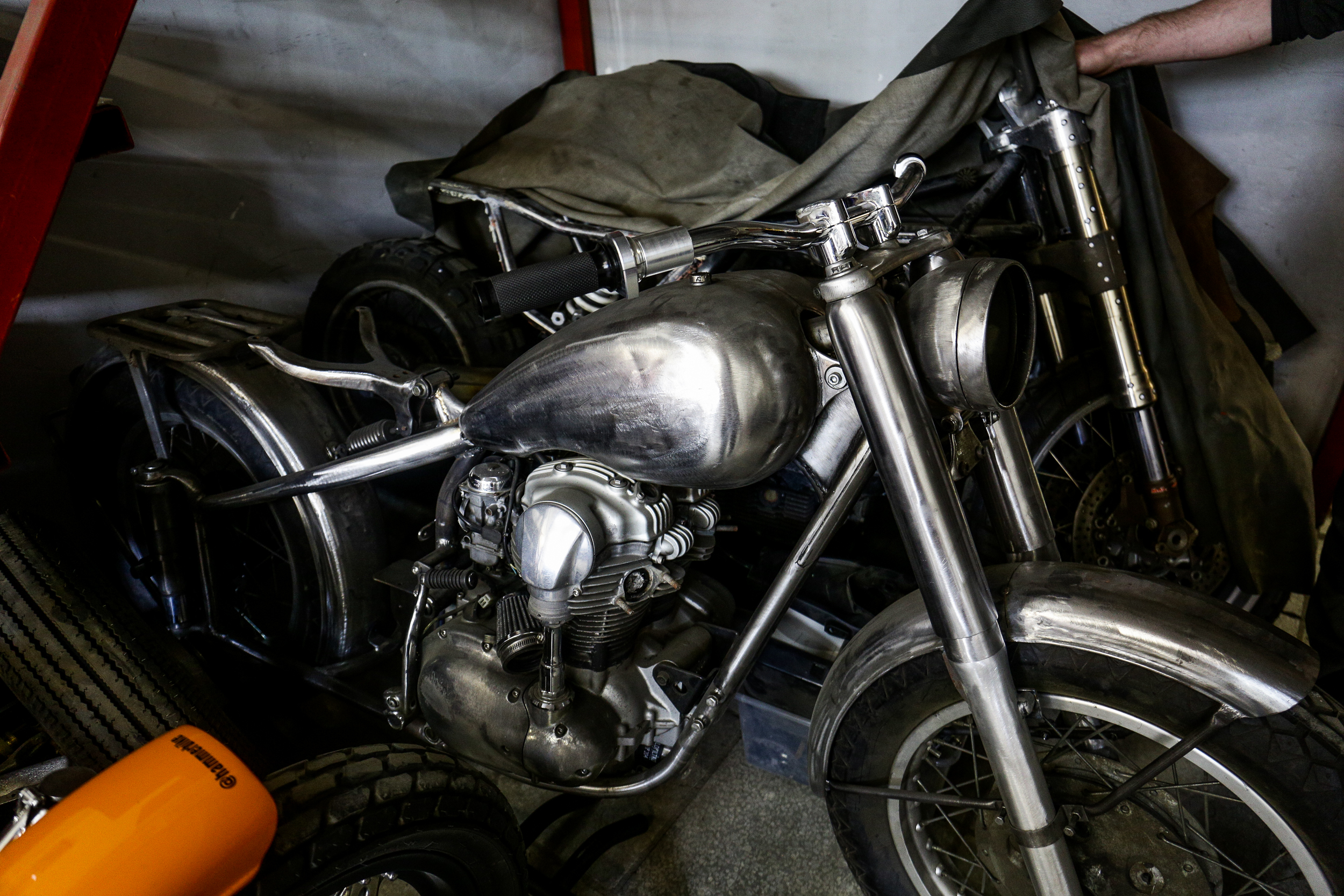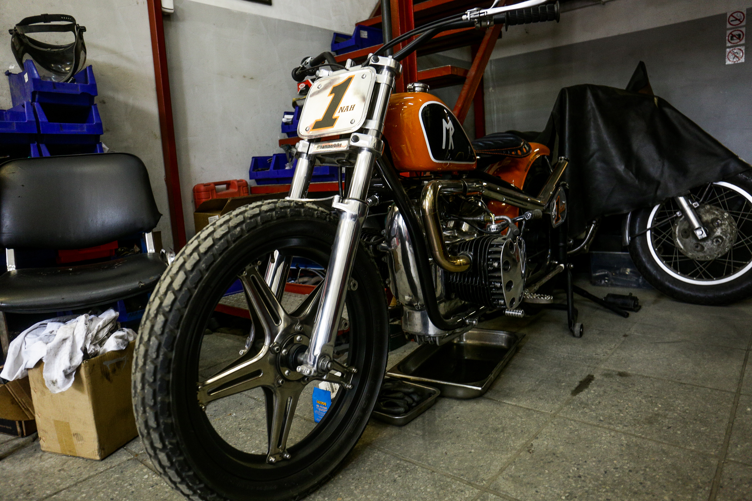 Для этого мотоцикла нужна специальная гоночная резина, которую просто так не достать. Покрышки я заказывал в Японии. Когда мне было десять лет, у меня был мопед “Карпаты”, и у него были очень похожие рукоятки и оранжевый бак. Такие ручки я нашёл у англичан, чтобы вот эту ностальгию испытать.