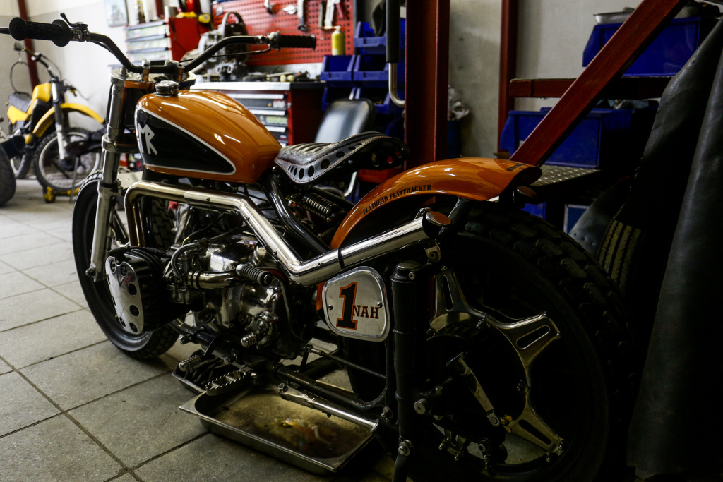 «Это уникальный гоночный мотоцикл в стиле 50-х годов. Гонки флэт-трек на них устраивали ещё до второй мировой войны. У нас в стране я первым сделал настоящий мотоцикл для таких гонок. Вот это уже второй экземпляр. Первый купил житель Новосибирска. Сейчас я делаю ещё один такой мотоцикл, и у нас уже будет маленькая команда из трёх участников. Мы сможем такие гонки организовать.