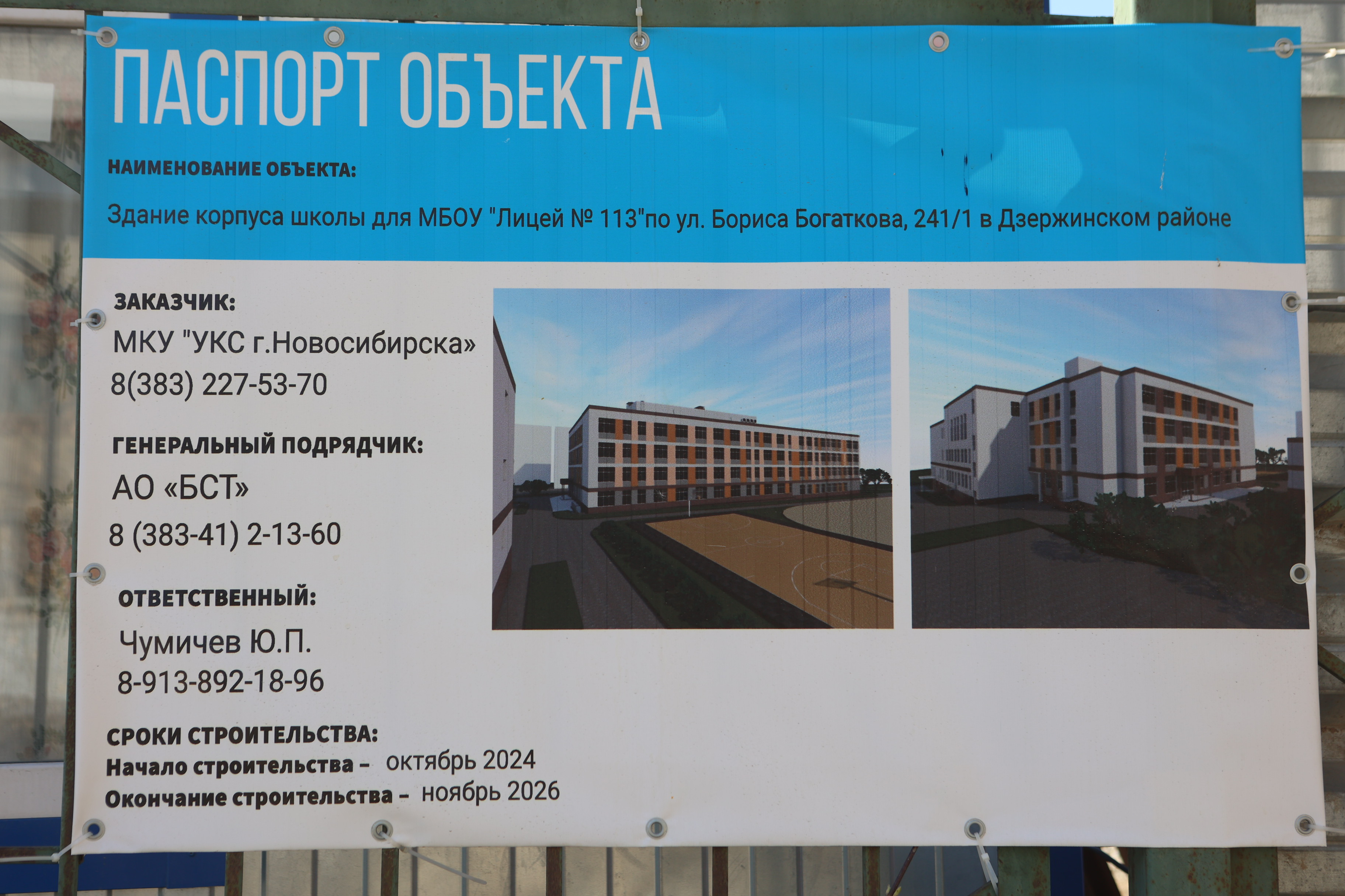 На улице Бориса Богаткова в Новосибирске продолжается строительство дополнительного корпуса для лицея №113. В новом здании будут учиться средние и старшие классы.