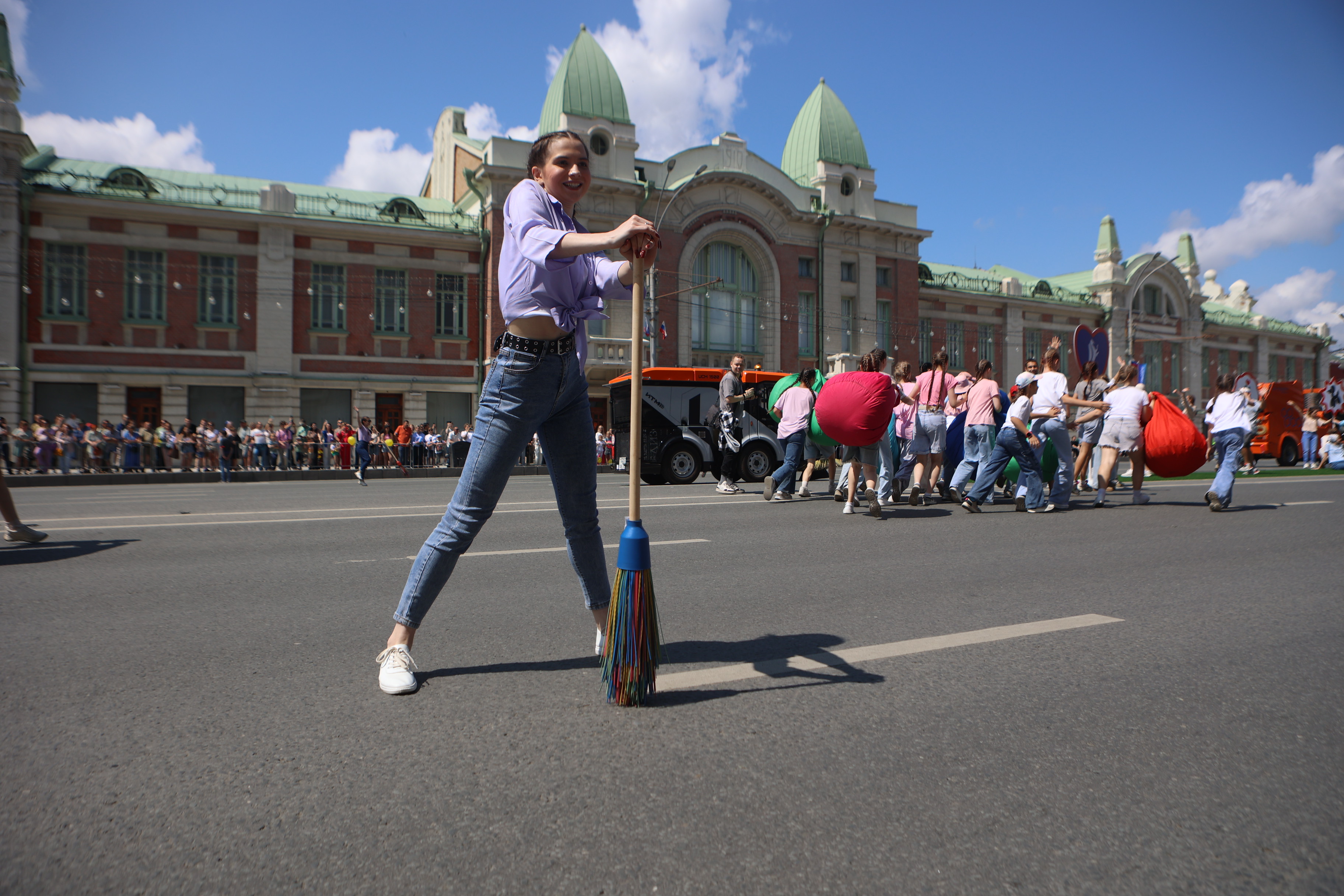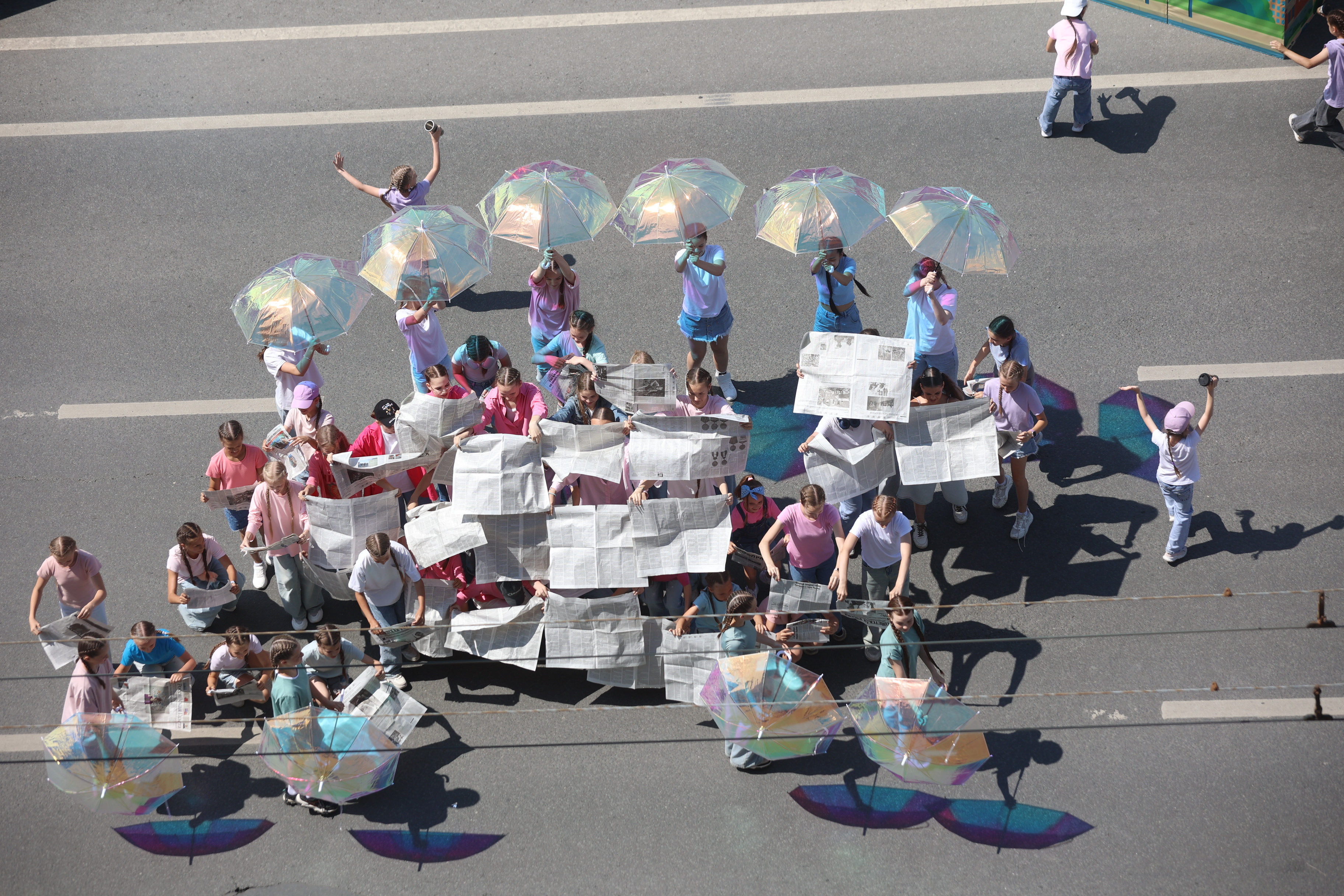 В шествии приняла участие даже беспилотная газонокосилка. Она вышла в сопровождении рабочего с пультом. Каждый блок сопровождали хореографические номера с участием детей.