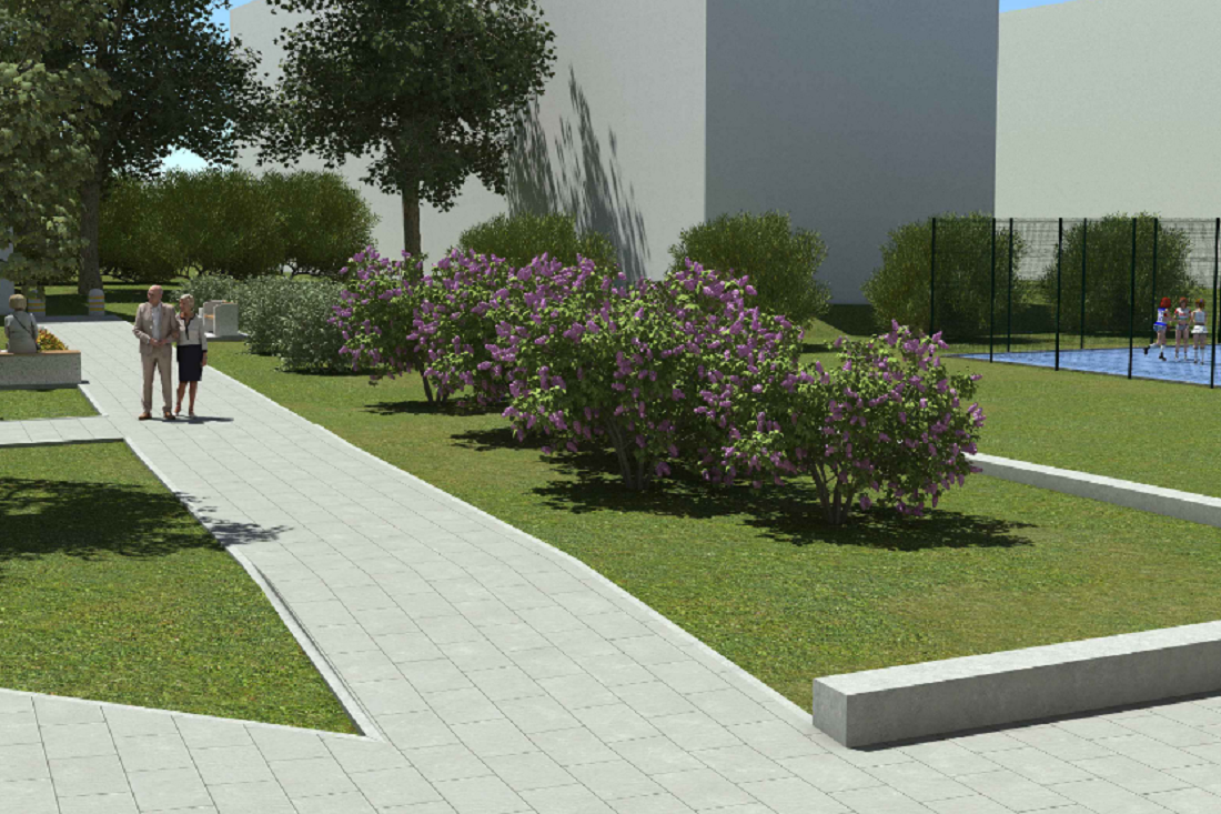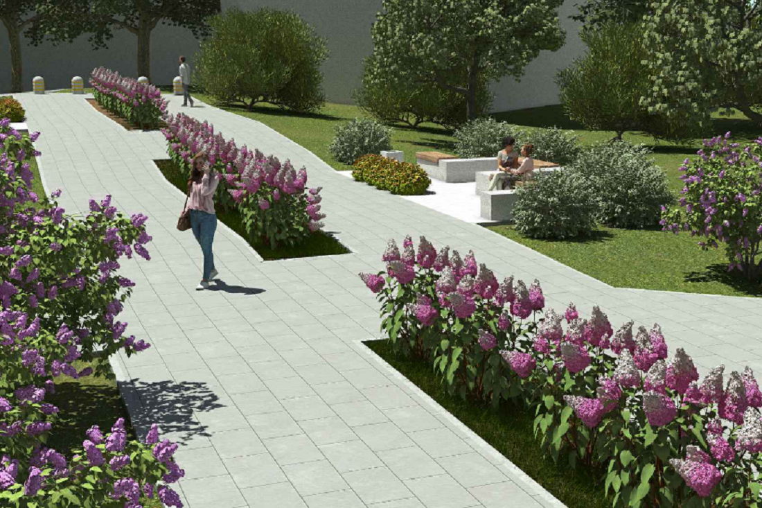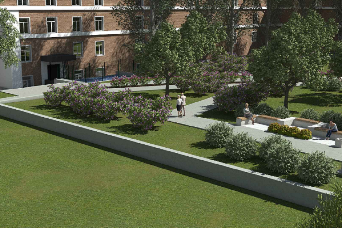 Площадь будущего сквера — 5000 кв. метров. Тут обустроят дорожки и спортивную площадку, сделают подпорную стену и смонтируют лестницу с ограждением и пандусом, разобьют газоны, посадят деревья и кустарники.