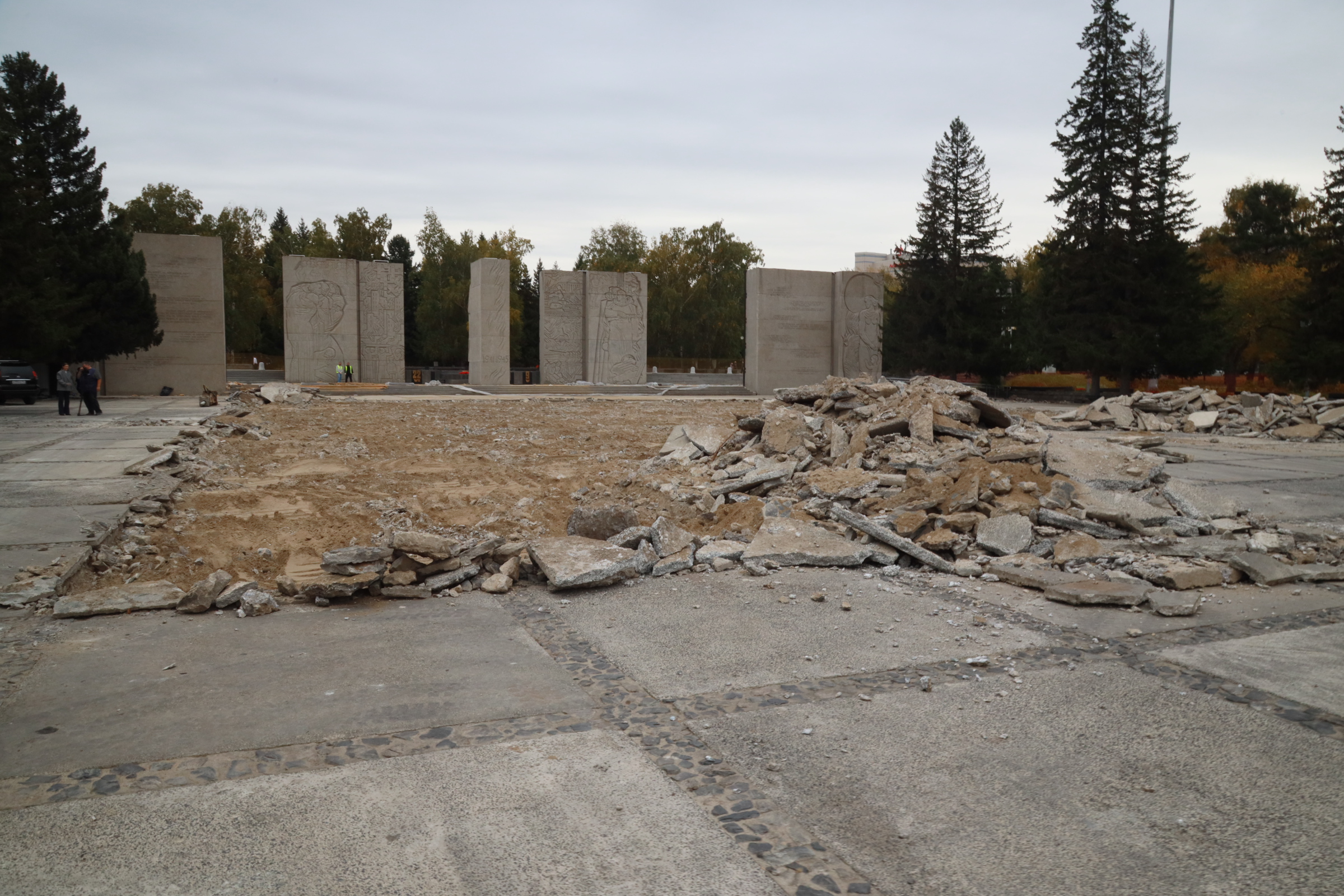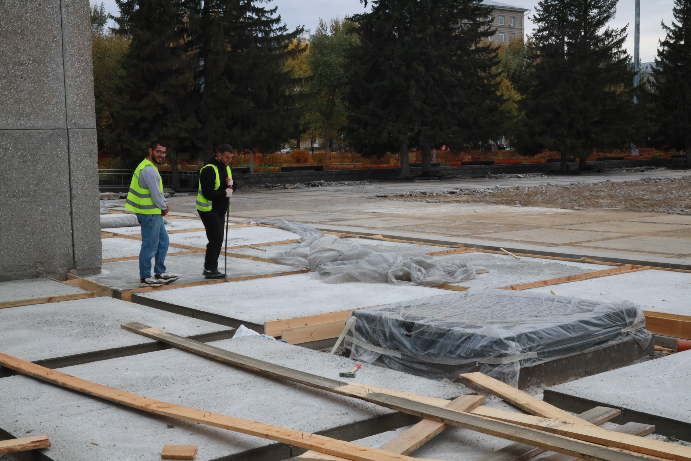 Реконструкция на площадке у Вечного огня выполнена на 65%. Демонтированы старые плиты, обустроено бетонное основание. Сейчас здесь сооружают опалубку для заливки верхнего слоя мозаичного покрытия.