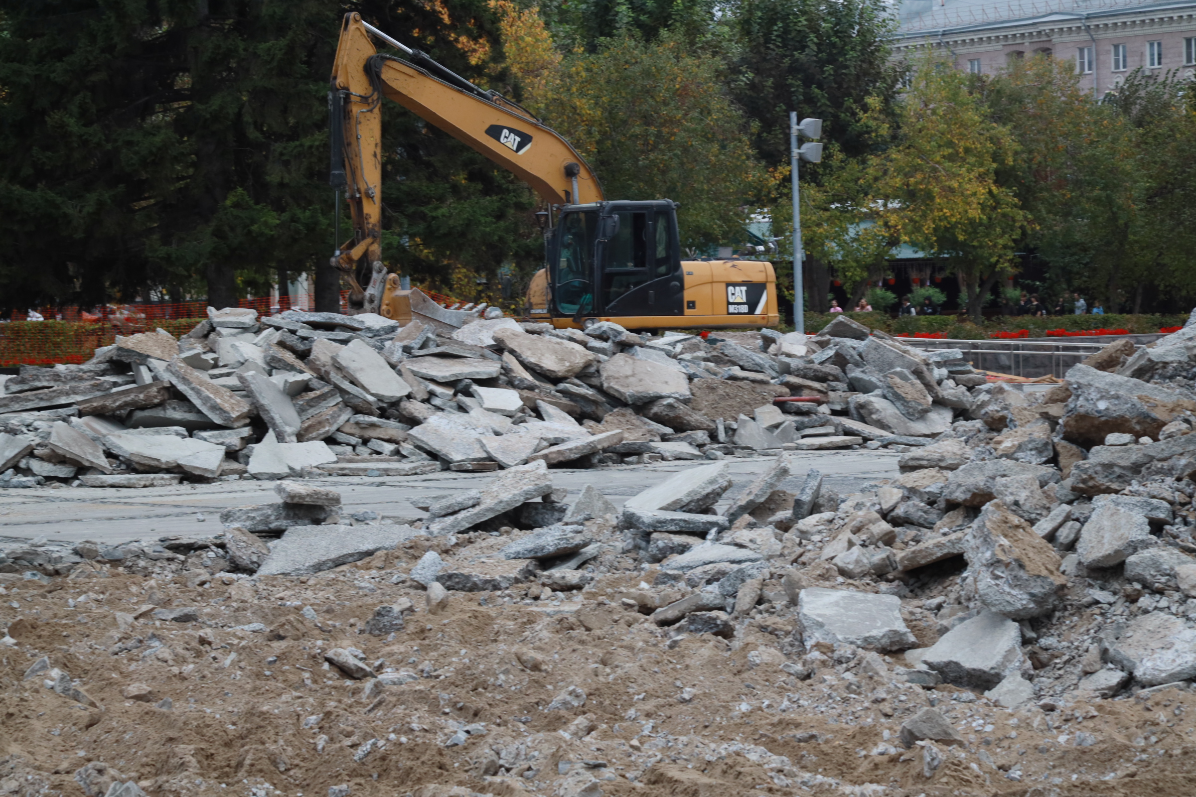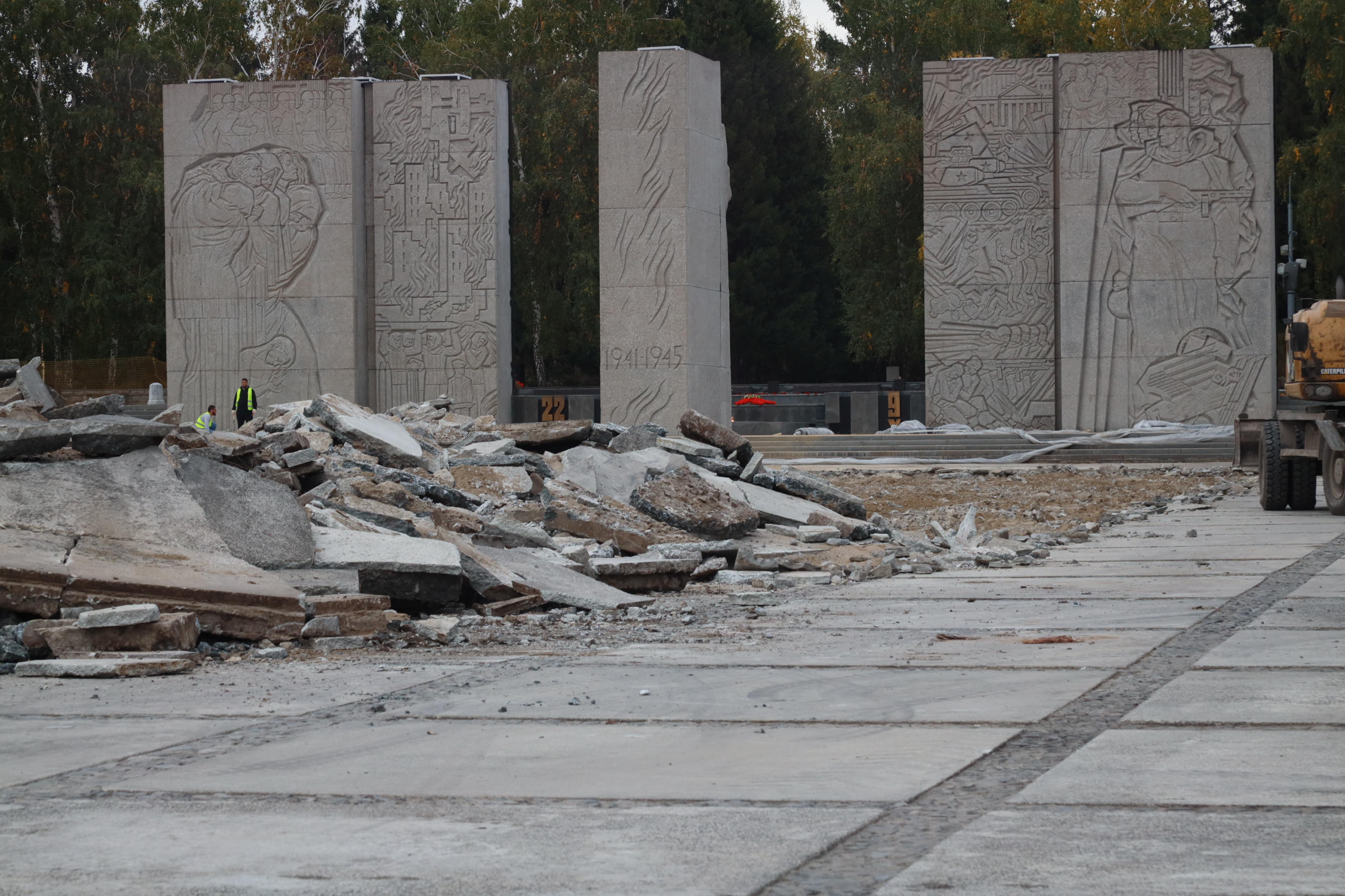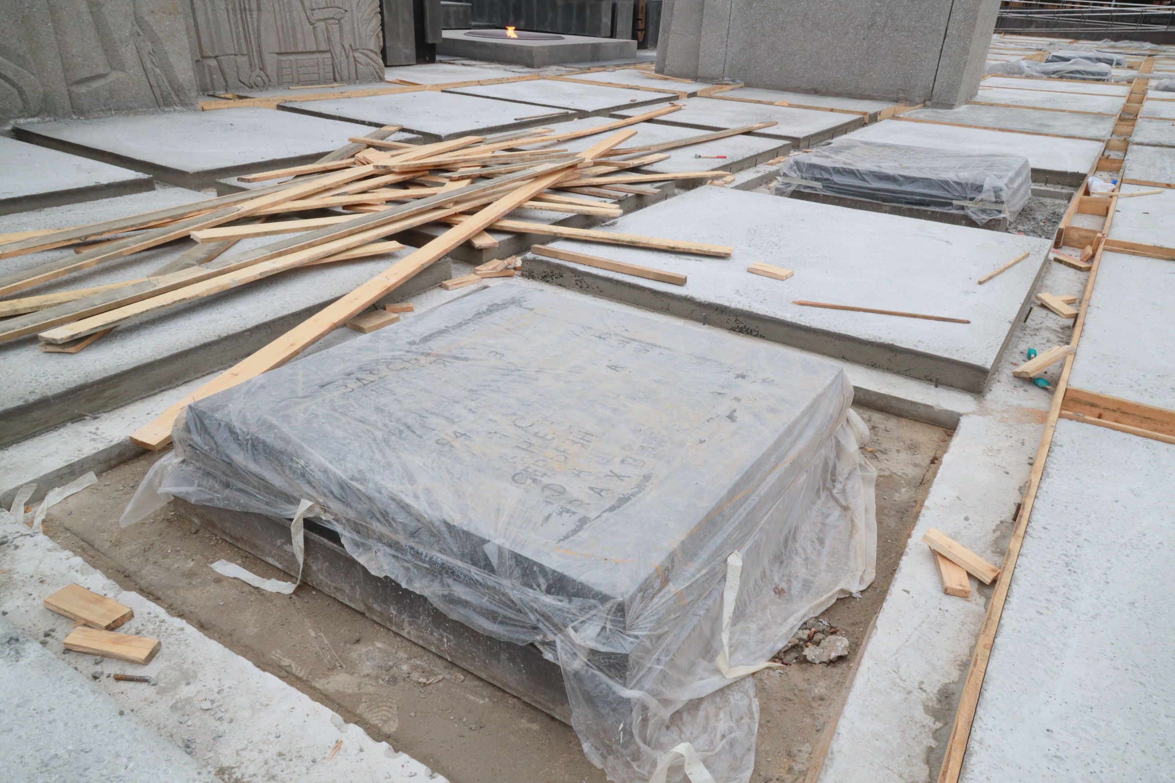На основной площадке монумента готовность оценивают в 20% — пока убирают старый бетон. Подрядчику предстоит уложить на этом участке больше 600 новых элементов из боя мраморных плит «Брекчия».