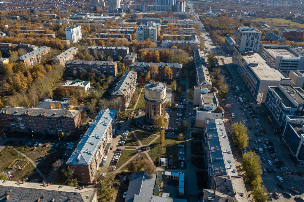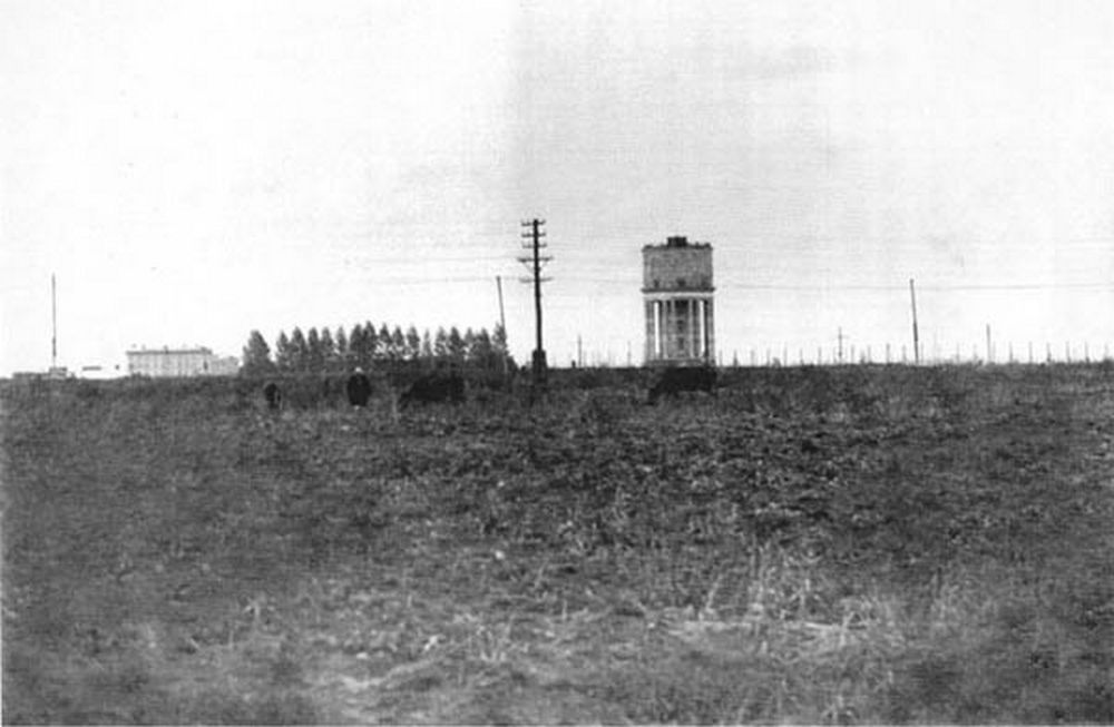 Первым капитальным зданием в этих окрестностях стала водонапорная башня, построенная в 1939 году. Она снабжала водой левый берег. Сооружение окружали огороды, пашня и места для выпаса коров.