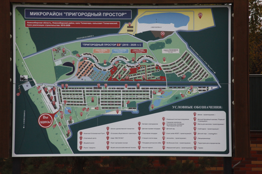 Девелопер рассказал, что на создание посёлка его вдохновил малоэтажный пригород Антверпена в Бельгии: побывал там в гостях у друзей и решил создать что-то подобное в Новосибирске. За годы возле Толмачёвского шоссе вырос большой район с таунхаусами площадью от 57 до 140 кв. метров, многоквартирными домами с одно-, двух- и трёхкомнатным жильём, двумя детскими садами, тремя спортивными клубами, торговым центром, ресторанчиком, конечной остановкой автобуса №28 и платформой городской электрички.