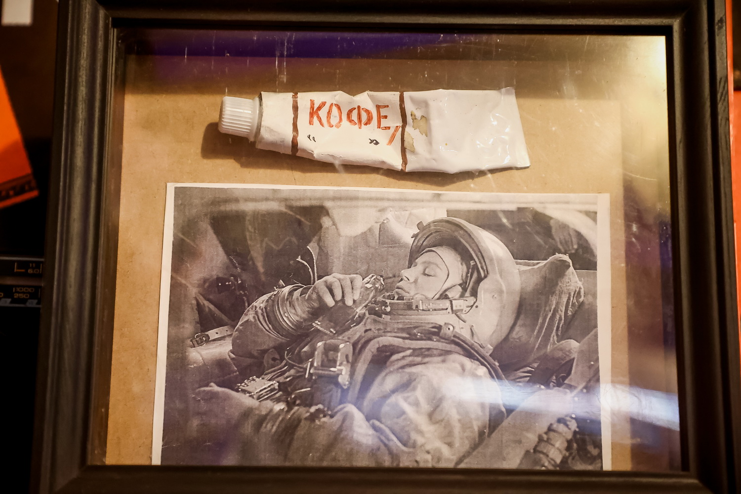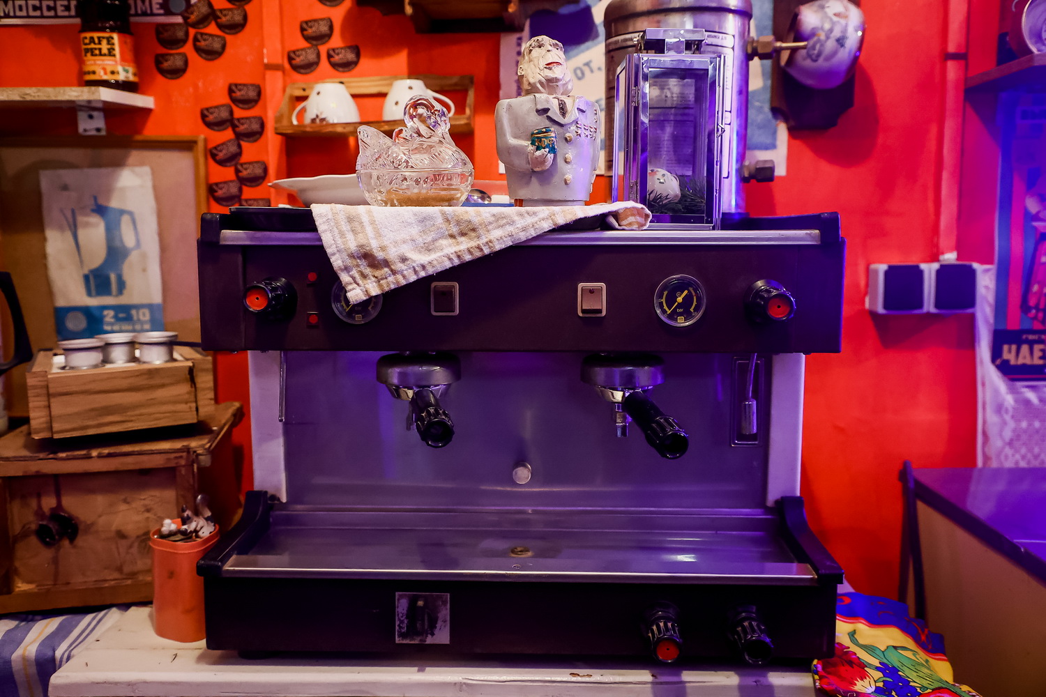Здесь можно увидеть одну из первых кофемашин, привезённых в Советский Союз. Называется она Omnia F. По словам экскурсовода, аппарат действующий. Его можно подключить и приготовить кофе, но в целях безопасности этого не делают, поскольку механизму уже более 70 лет. Производили такое оборудование в Венгрии.