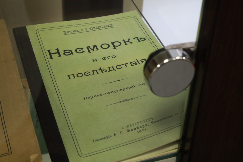 В экспозиции достаточно много медицинской и фармацевтической литературы, изданной в начале 1900-х годов. Старые книги до сих пор не утратили своей актуальности, некоторые из них — с интересными названиями, например «Насморк и его последствия».