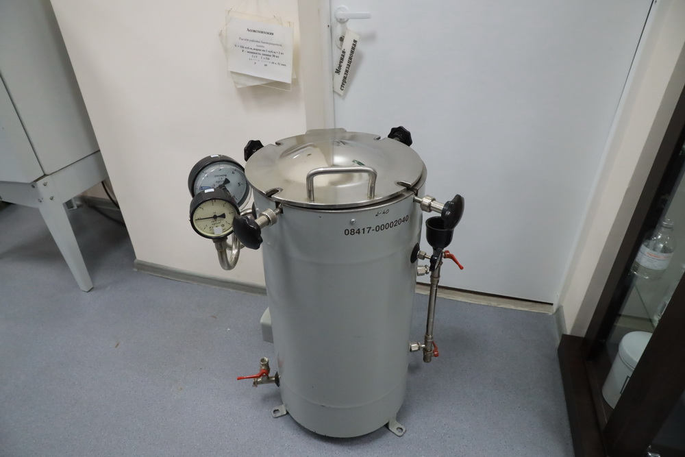 Ещё один экспонат — паровой стерилизатор. В нём стерилизуют лекарственные формы для инъекций и инфузий, а также медицинскую одежду для септического бокса. Чтобы пользоваться таким аппаратом, надо знать, как правильно выставить давление, провести тест и по его цвету определить, как прошла обработка. Этим нюансам специалистов обучают отдельно.