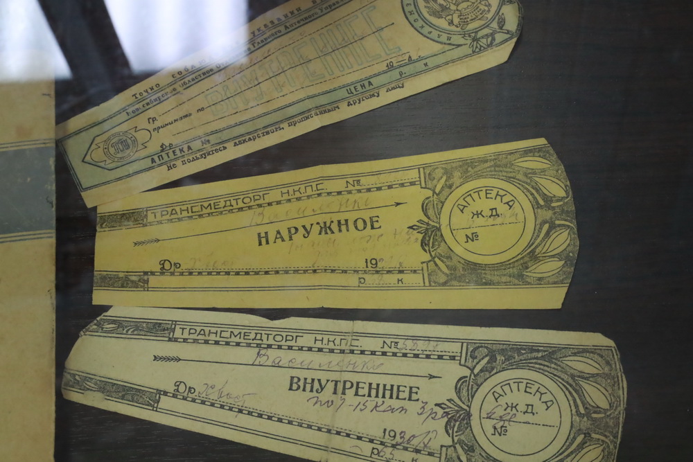 Представлены на витрине и этикетки для лекарств. Сейчас для оформления рецептурного препарата достаточно набрать на компьютере текст и нажать пару кнопок, чтобы его распечатать. А раньше каждую позицию подписывали вручную: по специальной форме указывали, как принимать микстуру, её цену, срок годности, фамилию пациента. Помимо этого, к флакону скрупулёзно клеили дополнительные инструкции, например, как взбалтывать или где хранить.