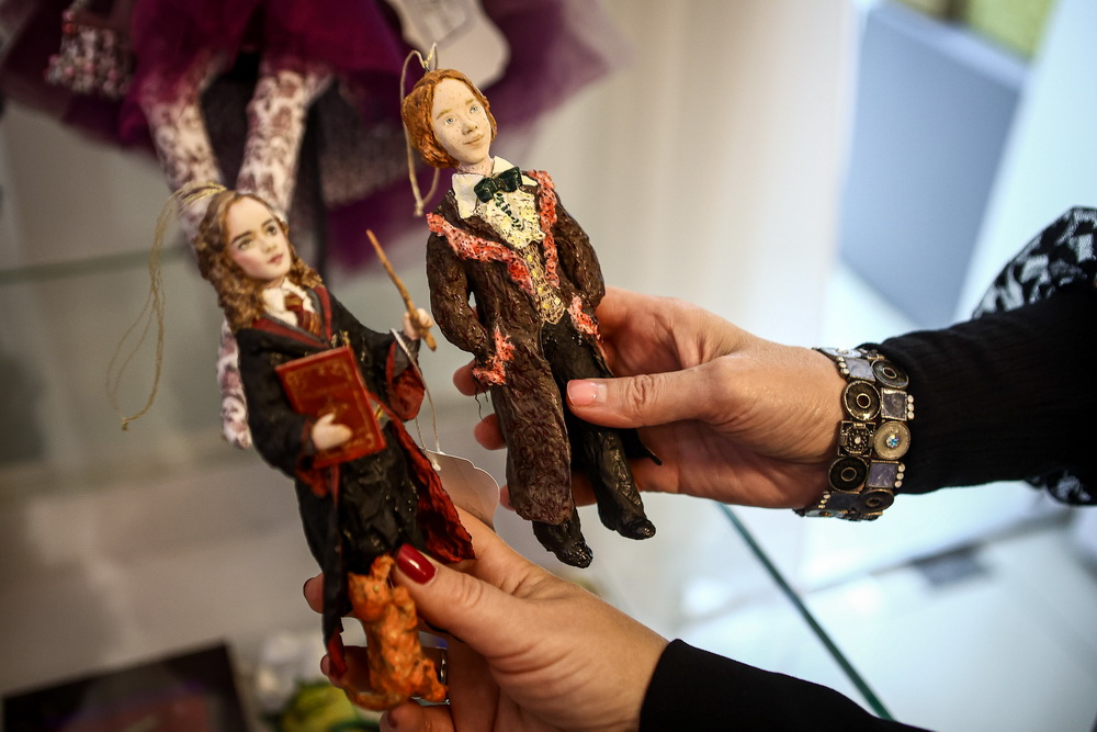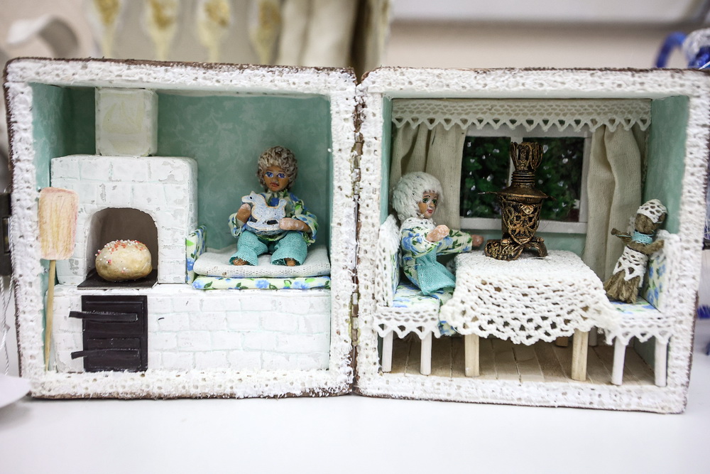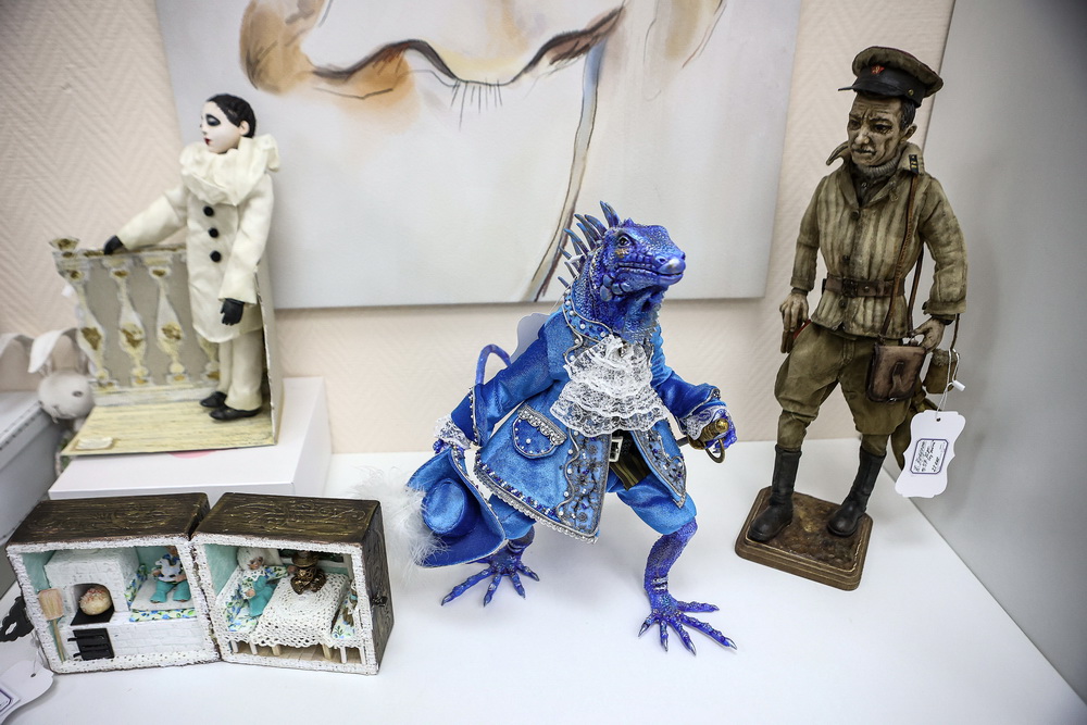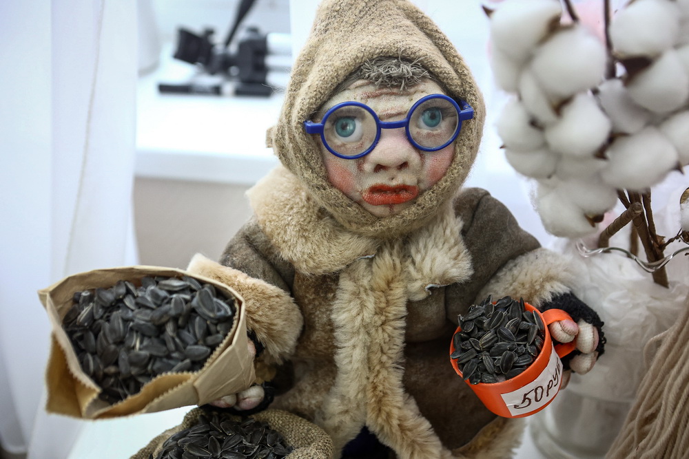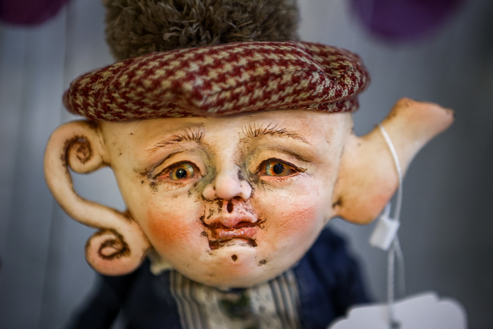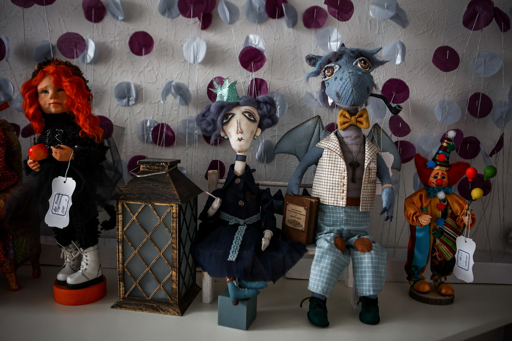 У каждого экспоната — своя история. И чем дальше, тем сказочнее. С музейных полок маячат шубная Моль, а за ней Кот с мандаринами и Бык-силач. Это всё лепные куклы. Их делают из пластика или скульптурного пластилина.