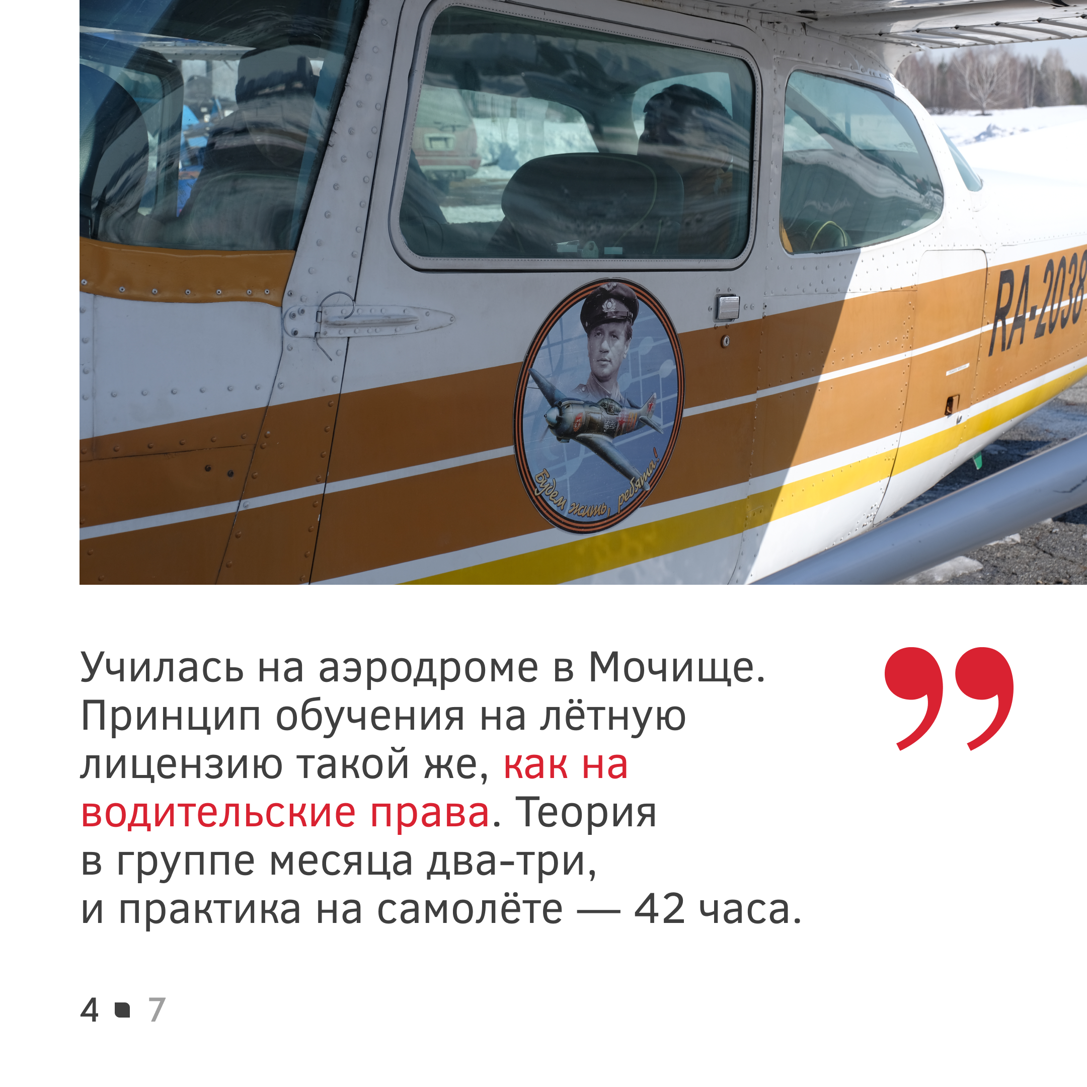 Выучилась у нас на аэродроме в Мочище. Там готовят частных пилотов самолётов с одним двигателем. Принцип обучения на лётную лицензию такой же, как на водительские права. Сначала теория в группе месяца два-три, потом практика на самолёте — 42 часа. Я их отлетала за девять месяцев. Дальше — экзамен.