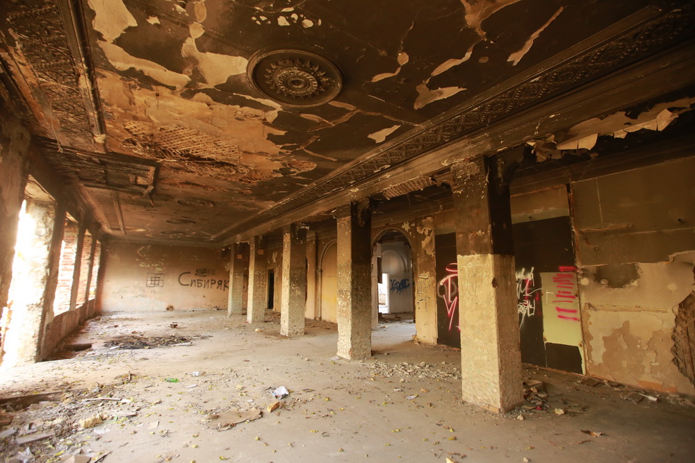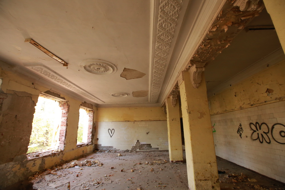 Сейчас история часто пребывает в неприглядном состоянии: полный разгром. Одно из зданий — баня, тоже памятник. Когда-то здесь было даже довольно помпезно. Это видно по аркам и лепным розеткам. Сегодня же — вырванные с корнем или выбитые окна. Даже следы пожара на потолке кое-где и «наскальная живопись».