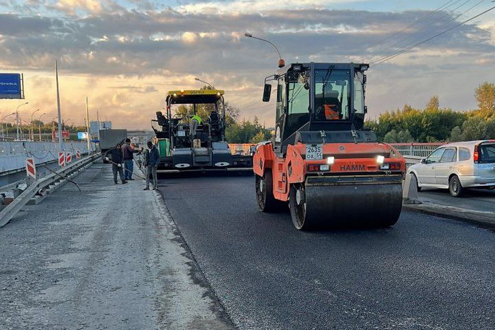 Подрядчик заканчивает укладывать асфальт в центре проезжей части на правом мосту через реку Иню на Бердском шоссе.