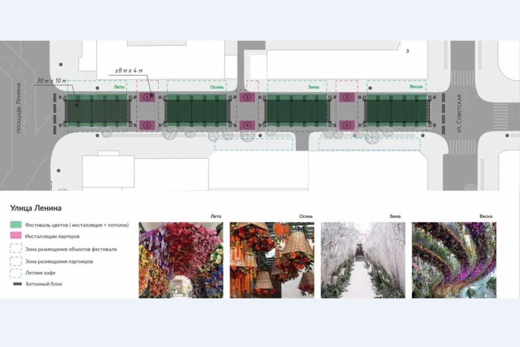 Отрезок улицы от площади Ленина до пересечения в Советской разделят на четыре локации, каждая из них будет посвящена четырём сезонам. Весну, лето, осень и зиму представят в виде цветочных композиций, подвесных потолков и тоннелей, собранных из ярких соцветий.