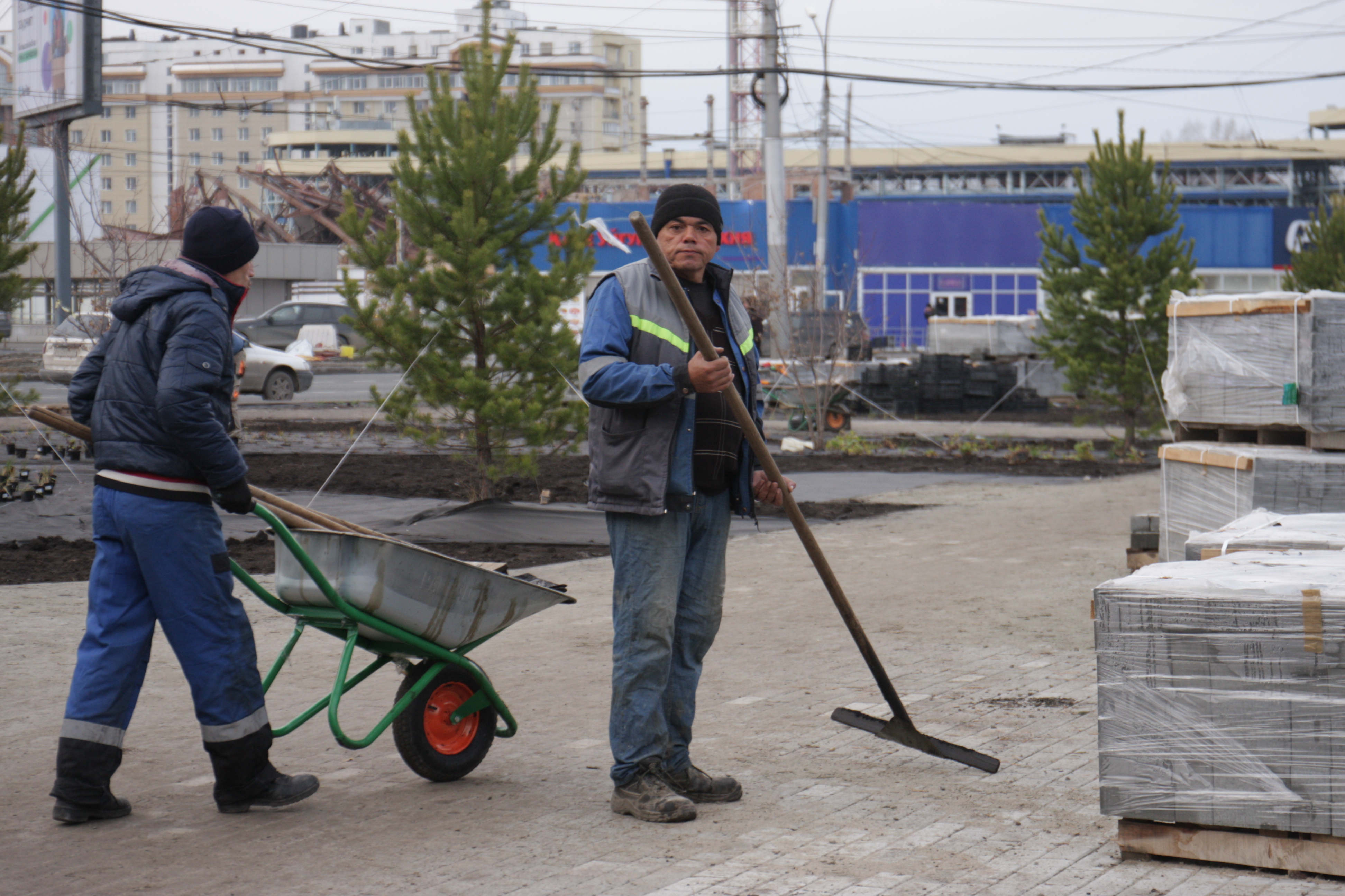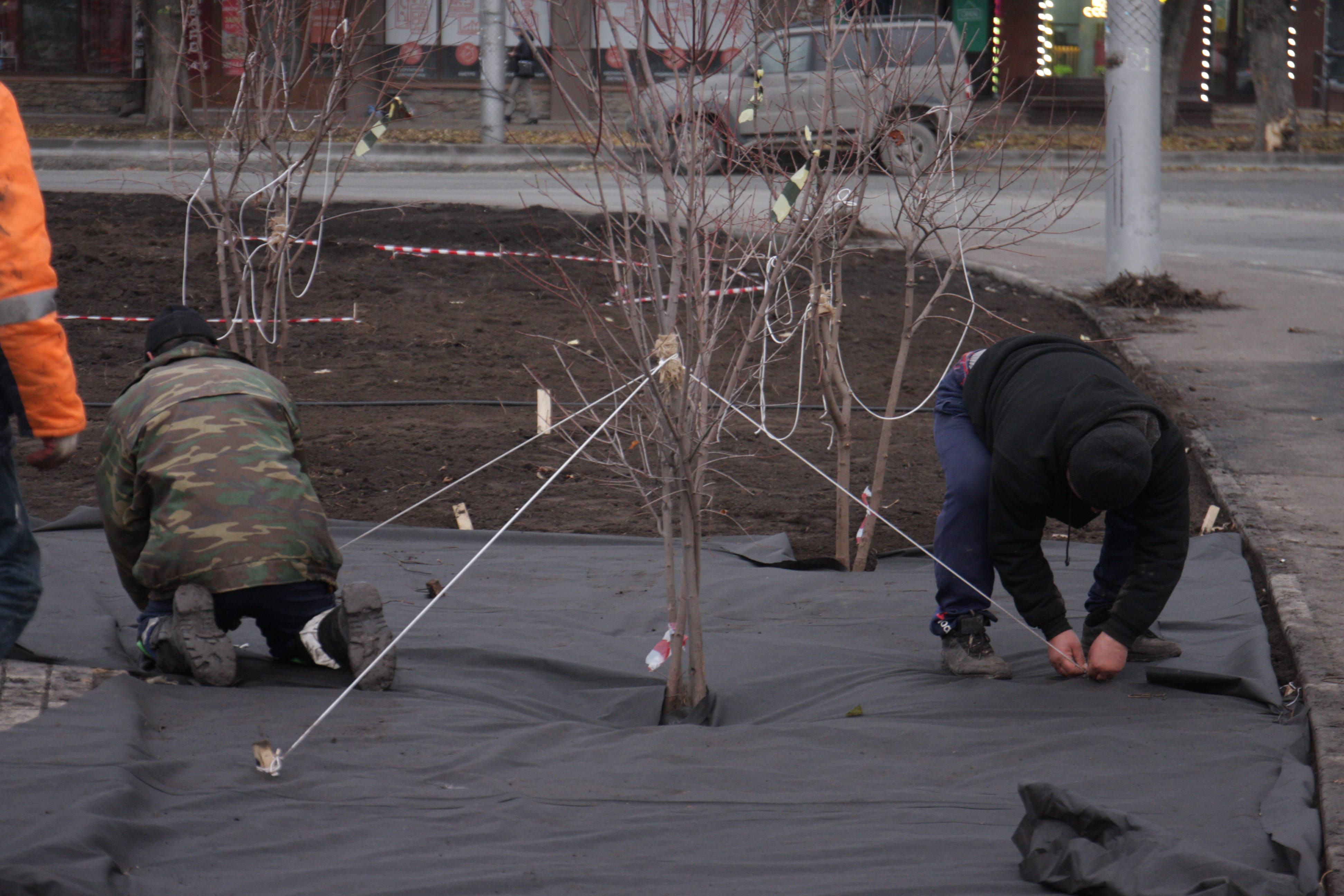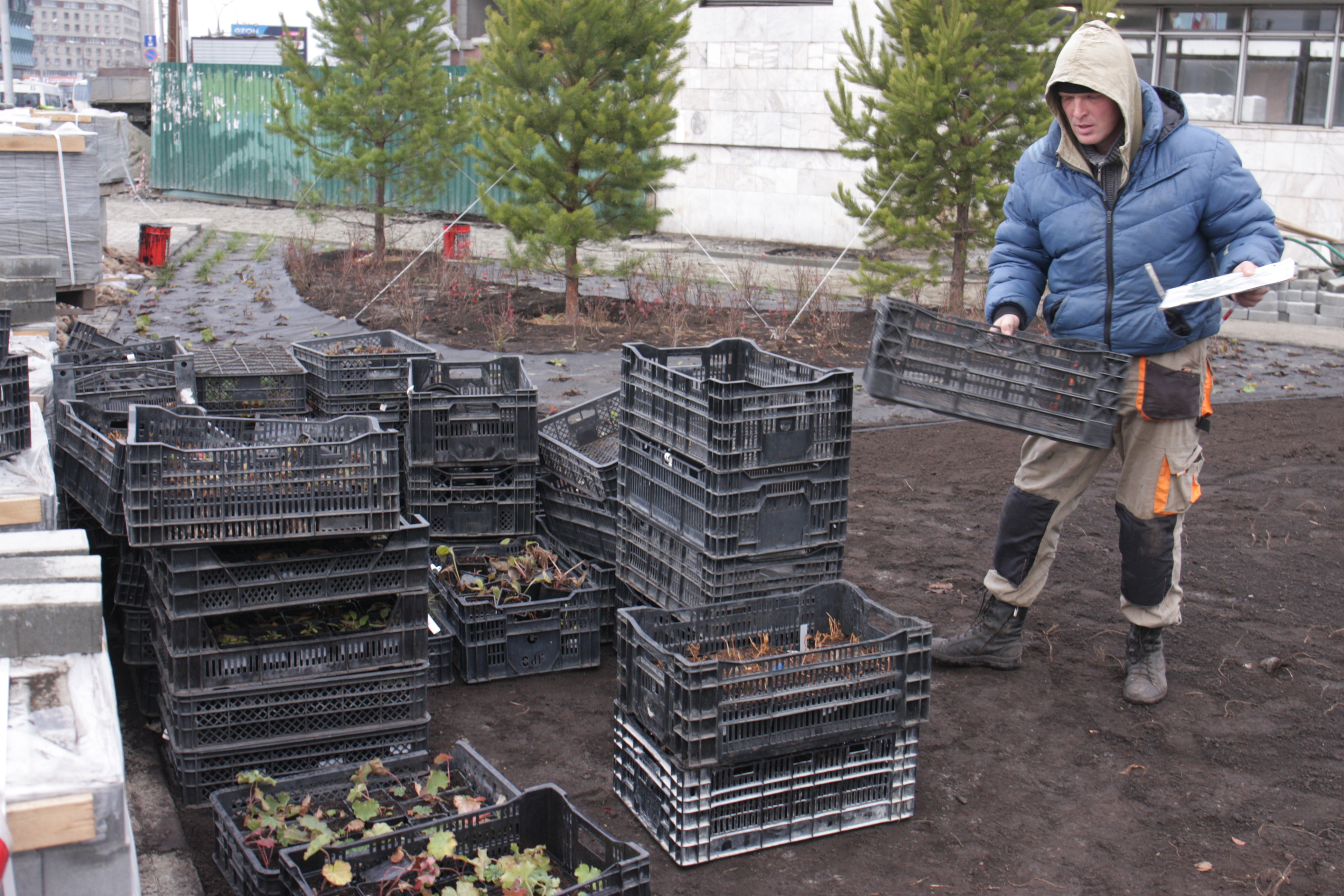 На площади Маркса стоит густой запах герани. Территория перед гостиницей «Турист» застелена тканью с разметкой. Рабочие-ландшафтники снуют с растениями в стаканчиках. «52 герани сюда, 48 посконников — туда!» — командует бригадир. Тут же в ямах закрепляют четырёхметровые сосны.