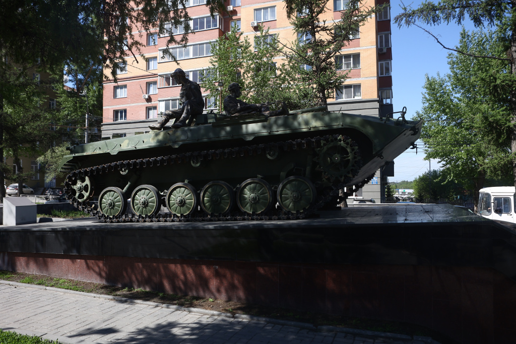 Памятник воинам-интернационалистам на пересечении Красного проспекта и улицы Северной установили на постамент в 2016 году. Сначала БМП стояла «лицом» к центру Новосибирска. В ночь на 26 апреля 2018-го кто-то развернул 20-тонную машину на 180 градусов в сторону старого городского аэропорта. В феврале 2020-го мемориал открыли заново, но уже обновлённым — технику отреставрировали и добавили фигуры солдат.