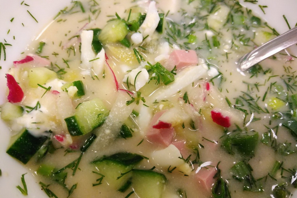 Ингредиенты: литр жирного кефира, отварная свёкла, свежий огурец, две отварные картофелины, четыре крутых яйца, при желании — колбаса (250 г), зелень (лук, укроп), кипячёная холодная вода, соль, горчица или хрен (столовая ложка), чёрный перец.
