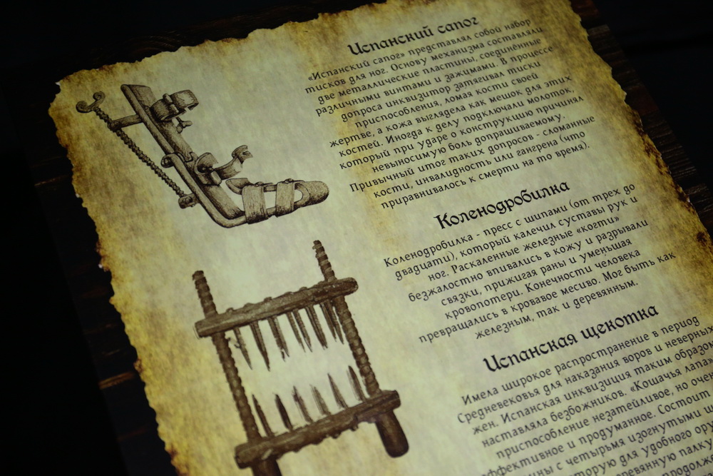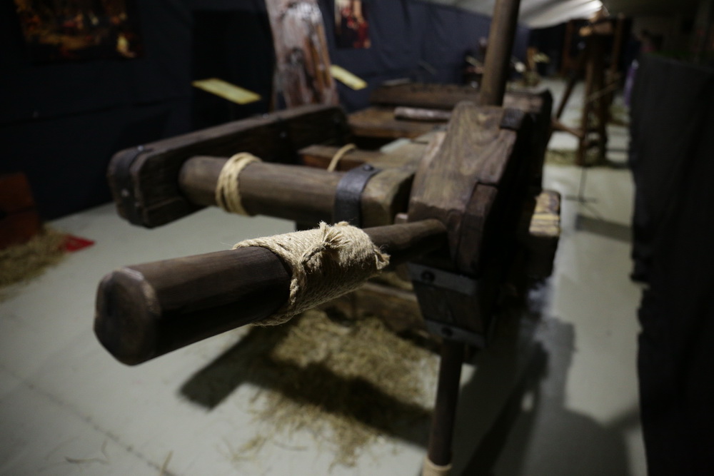 Для того чтобы воссоздать инструменты, потребовалось больше года. Все они сделаны по реальным чертежам — организаторы запросили их в архивах Ватикана. Для придания достоверности в изготовлении орудий инквизиции использовали старую древесину начала этого века. На выставке представлено более 50 экспонатов — дыбы, гильотины и костюм чумного доктора. Все инструменты можно трогать и даже примерять на себе.
