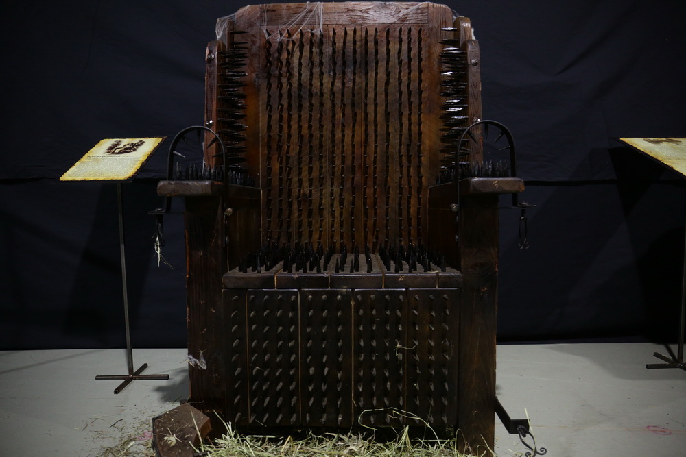«Из уникальных у нас — кресло дознаний („ведьмин стул“ по-другому). Изготавливали его месяца два с половиной. Очень кропотливый труд, там более 1000 шипов. И для кузнецов вызвало особенную сложность изготовление масок позора, чтобы они были похожи функционально и весили так же, как и в те времена. Весили они от пяти до семи килограммов», — рассказал организатор выставки «Тайны инквизиции. Орудия пыток Средневековья» Андрей Величкин.