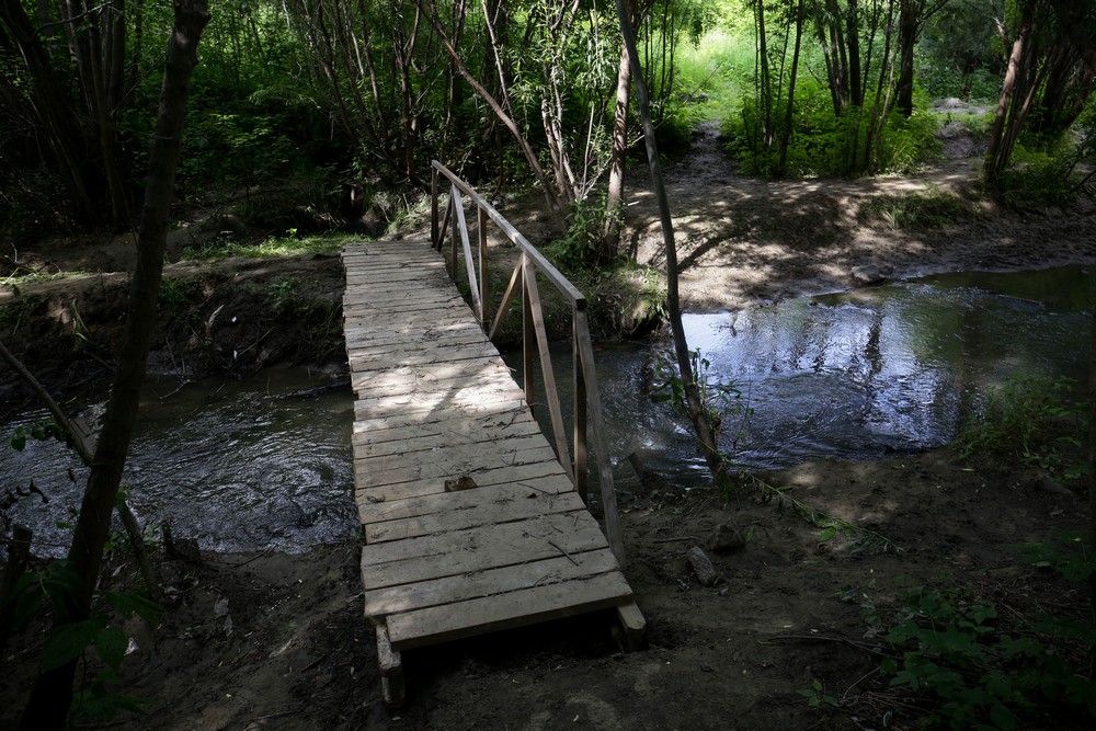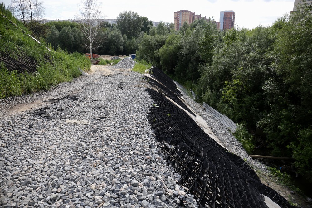 Для железобетонного мостика уже сделали четыре сваи — по две на каждом берегу. Русло речки рядом со строящимся жилым комплексом очистили от мусора и топляка. Чуть дальше вниз по течению через речку перекинули небольшой деревянный мостик. Со стороны ЖК «Ельцовский парк» берег частично отсыпали камнями, частично укрепили с помощью специальной георешётки. На первом этапе вход в парк обустроят со стороны улицы Танковой.