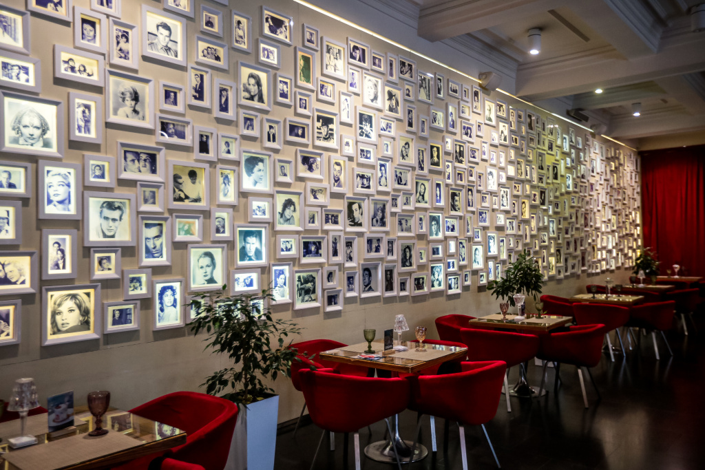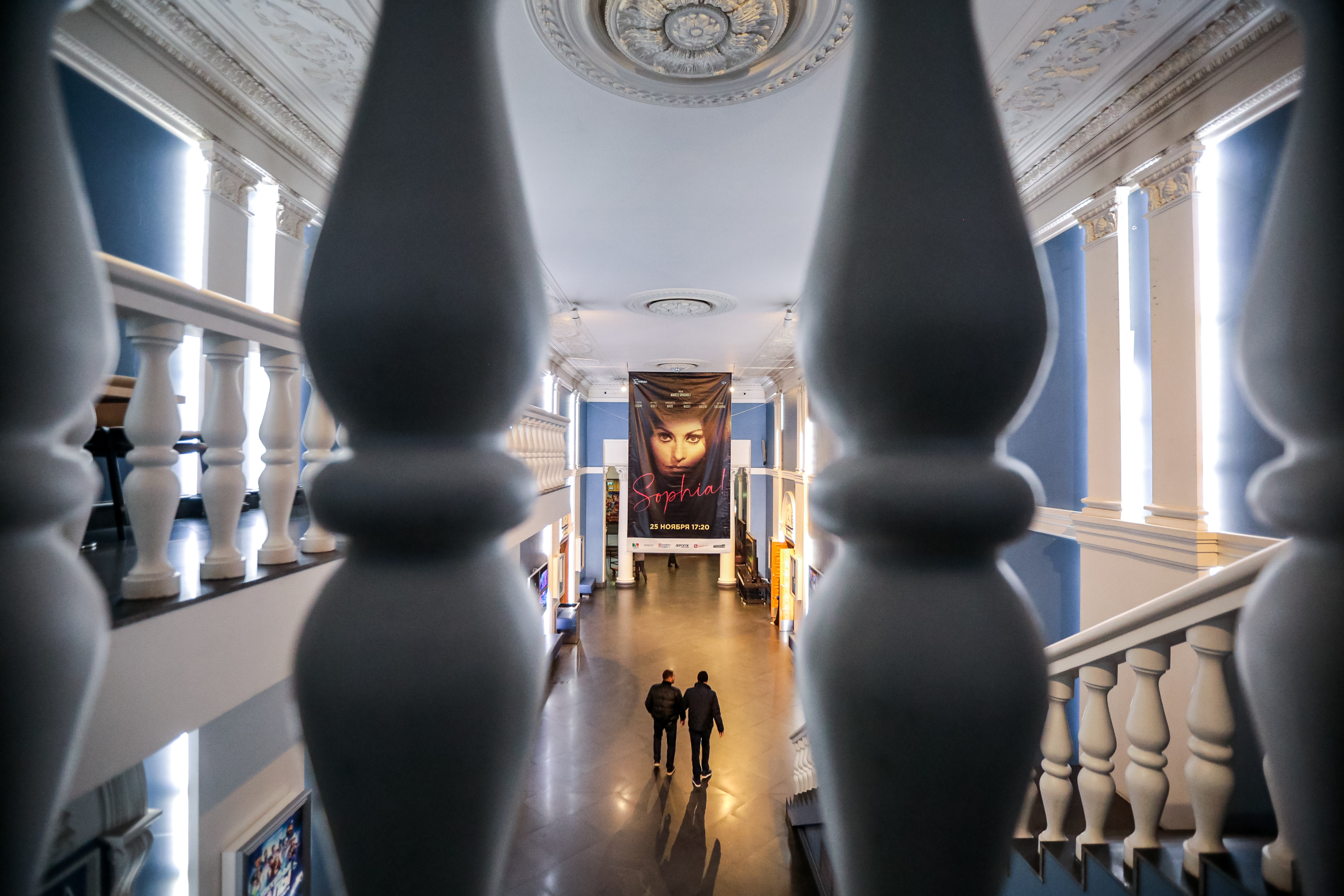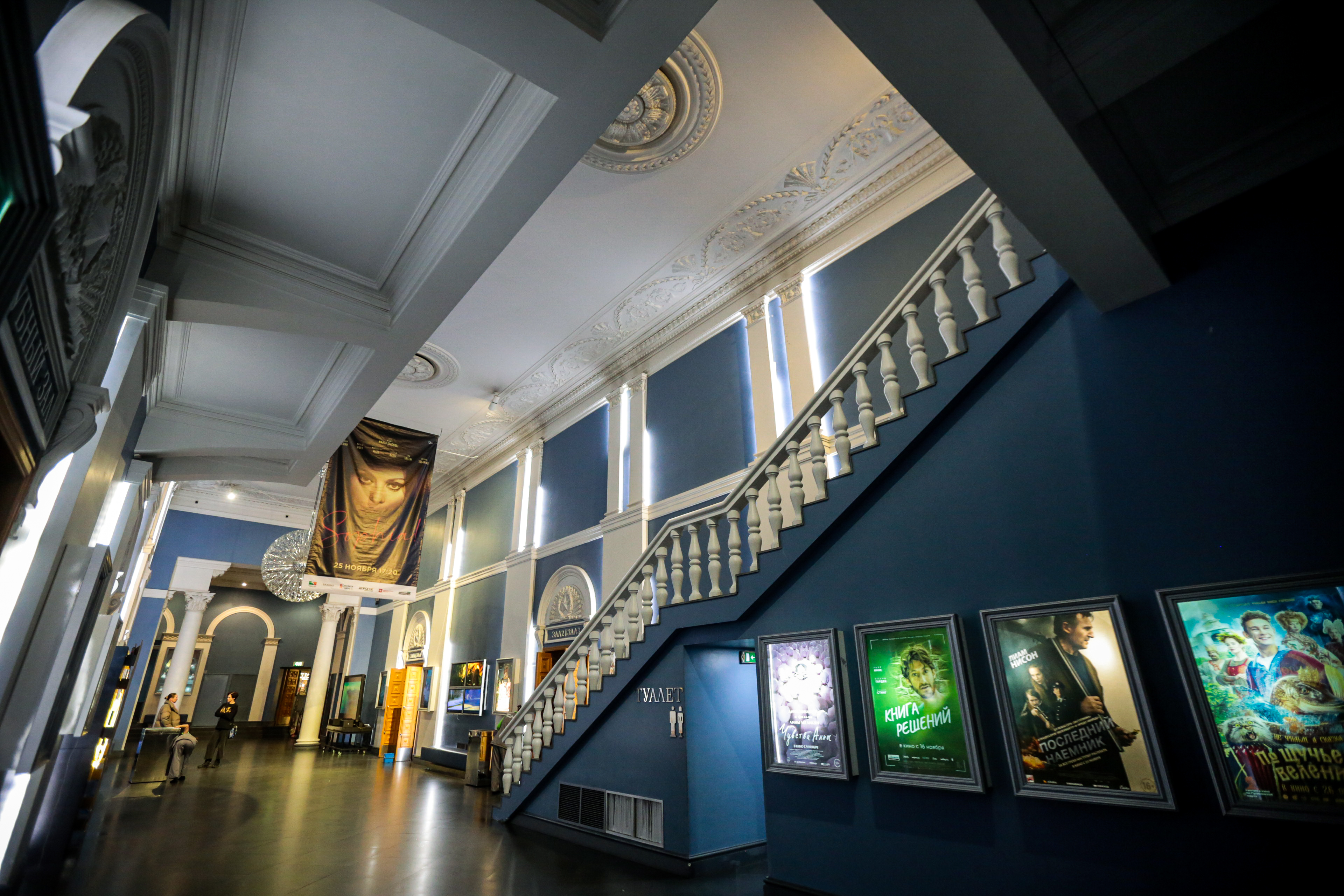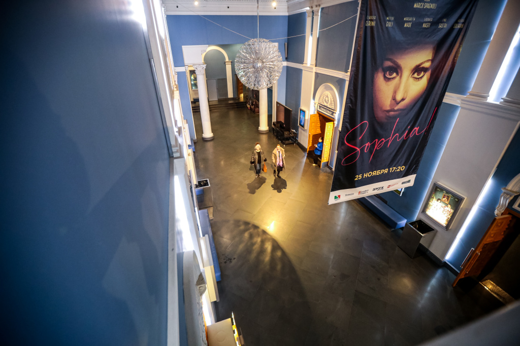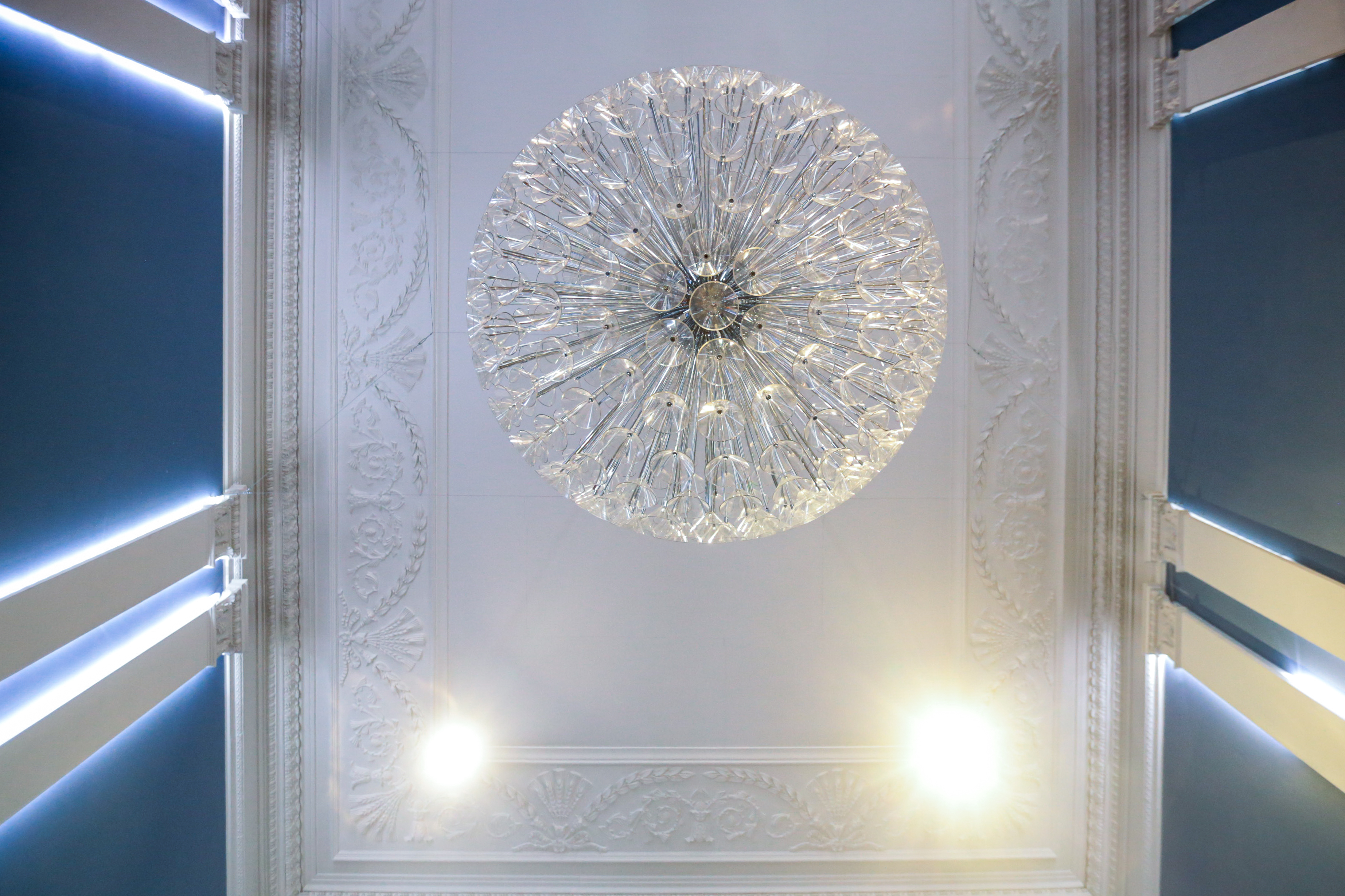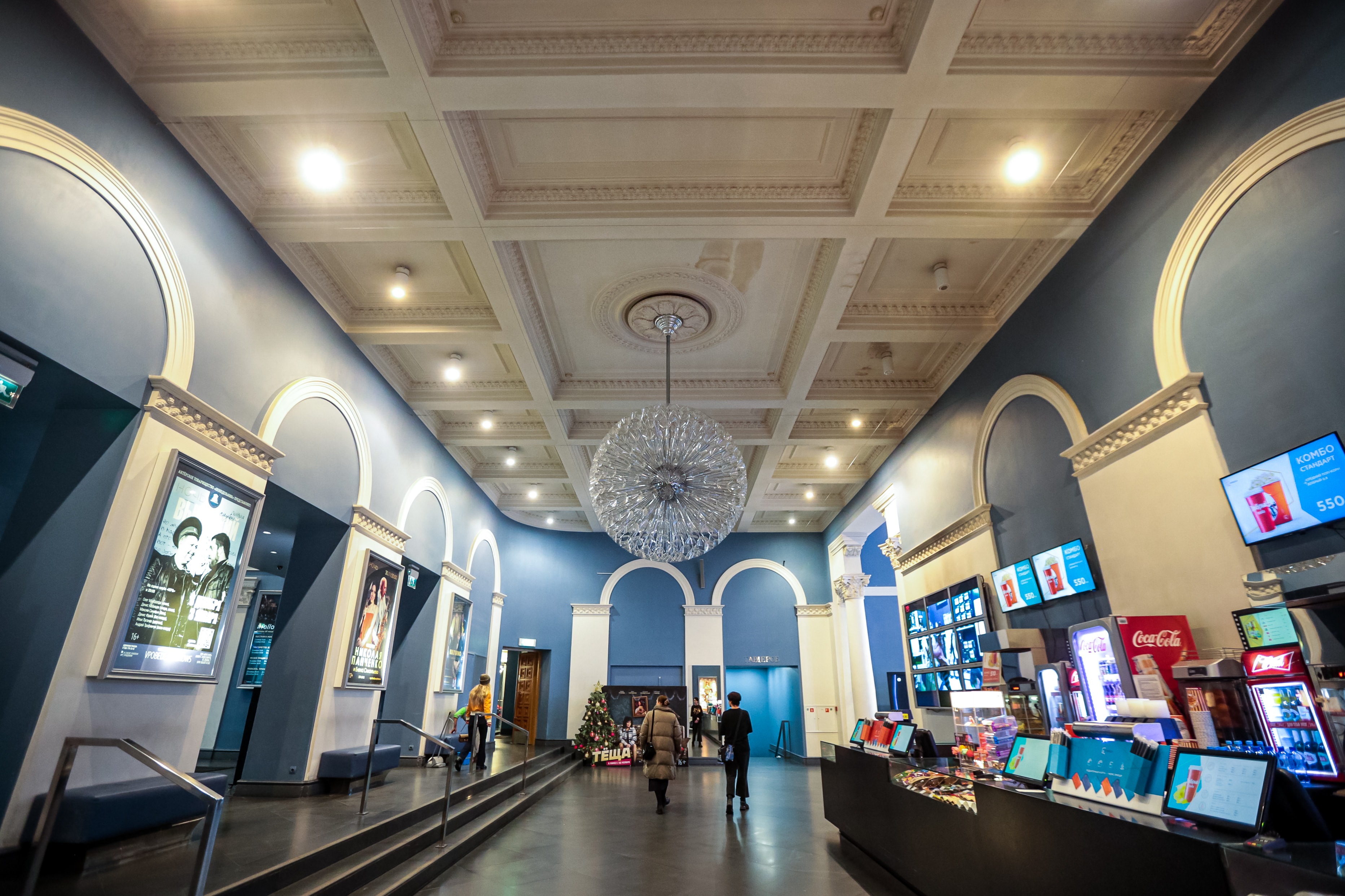 Безусловным украшением фойе «Победы» служат не только восстановленная лепнина и кессонированные потолки, но и огромные люстры в виде шаров. Они собраны из множества прозрачных элементов. Их изготовили по спецзаказу в Италии.