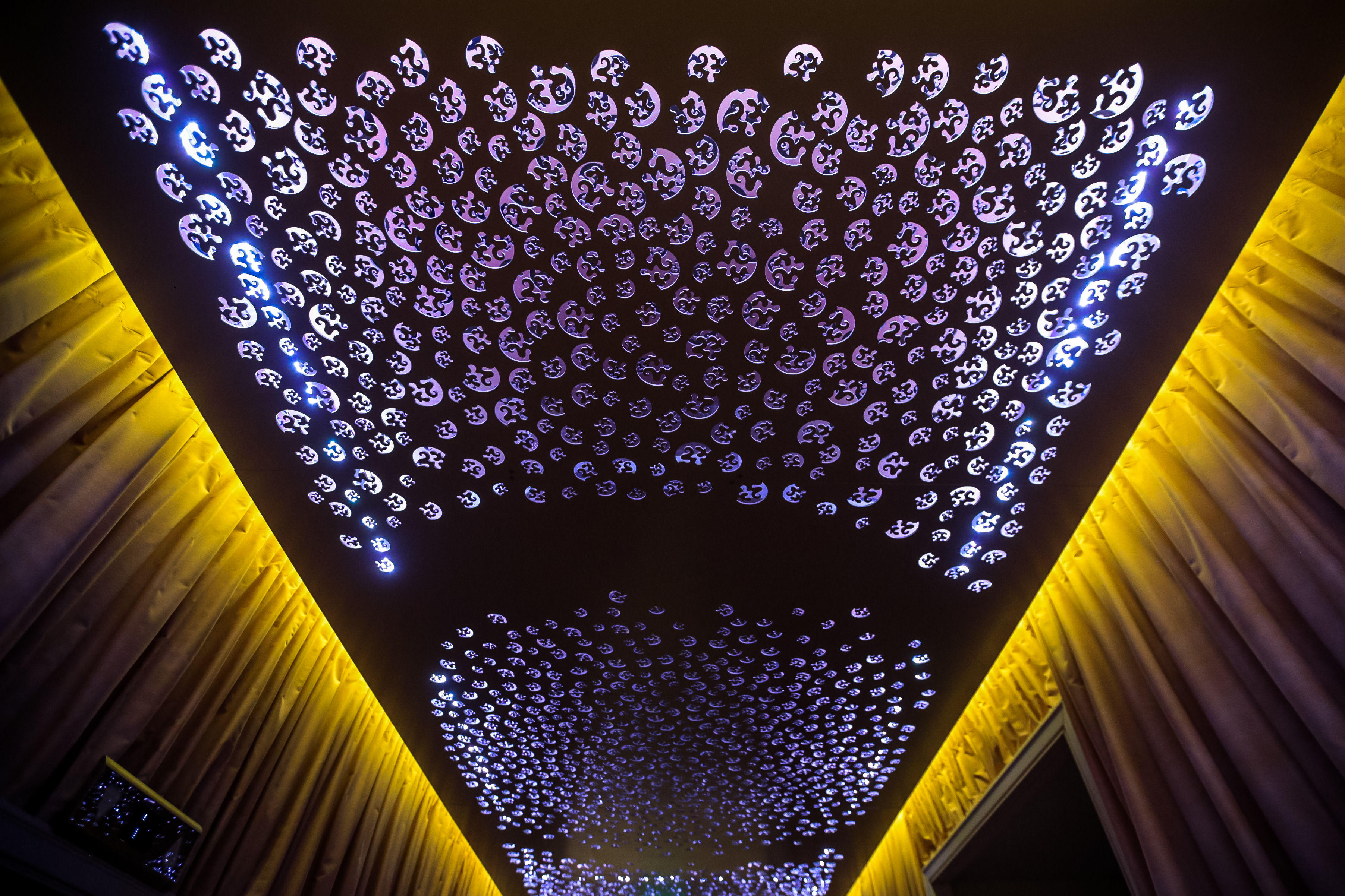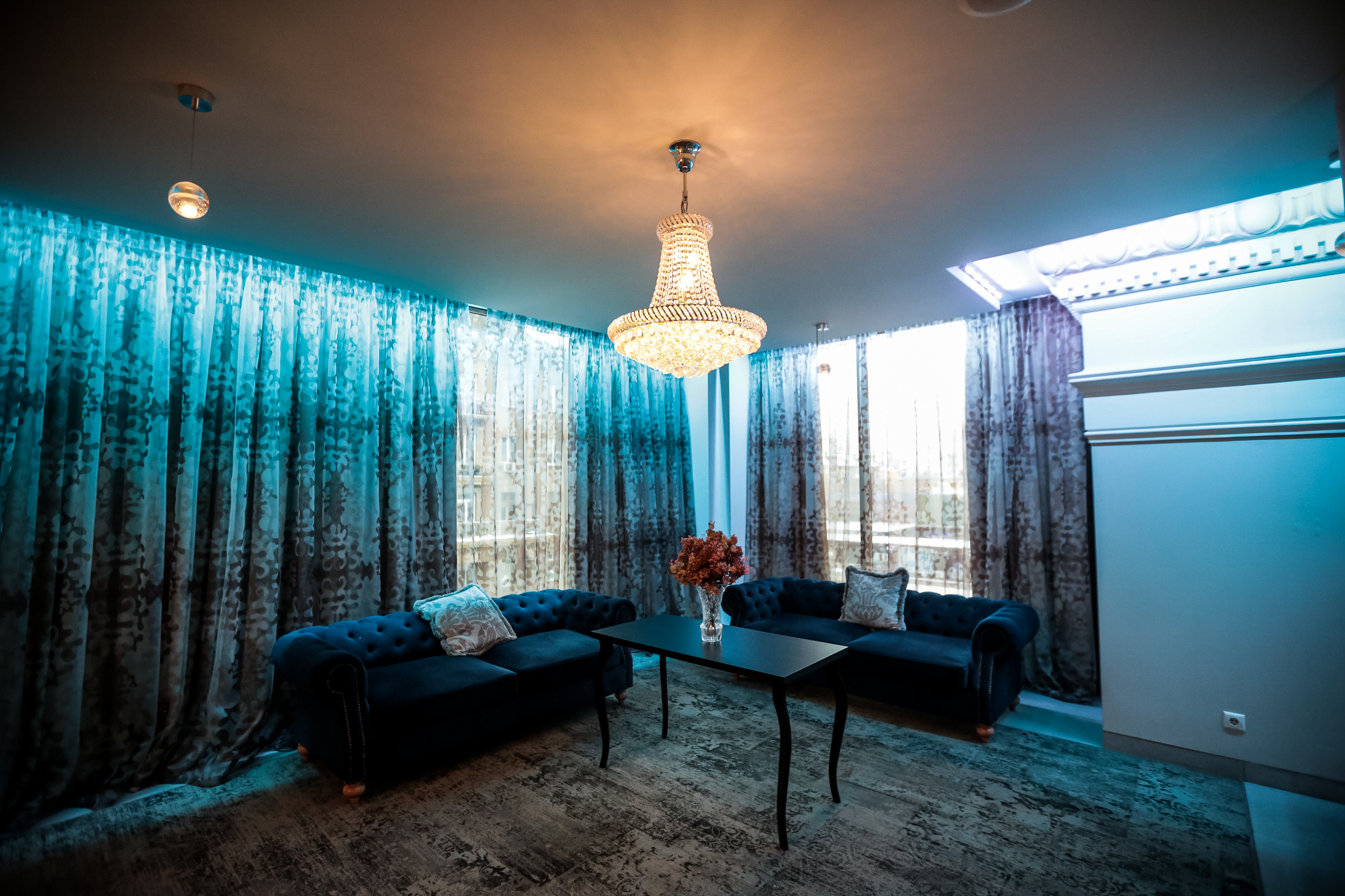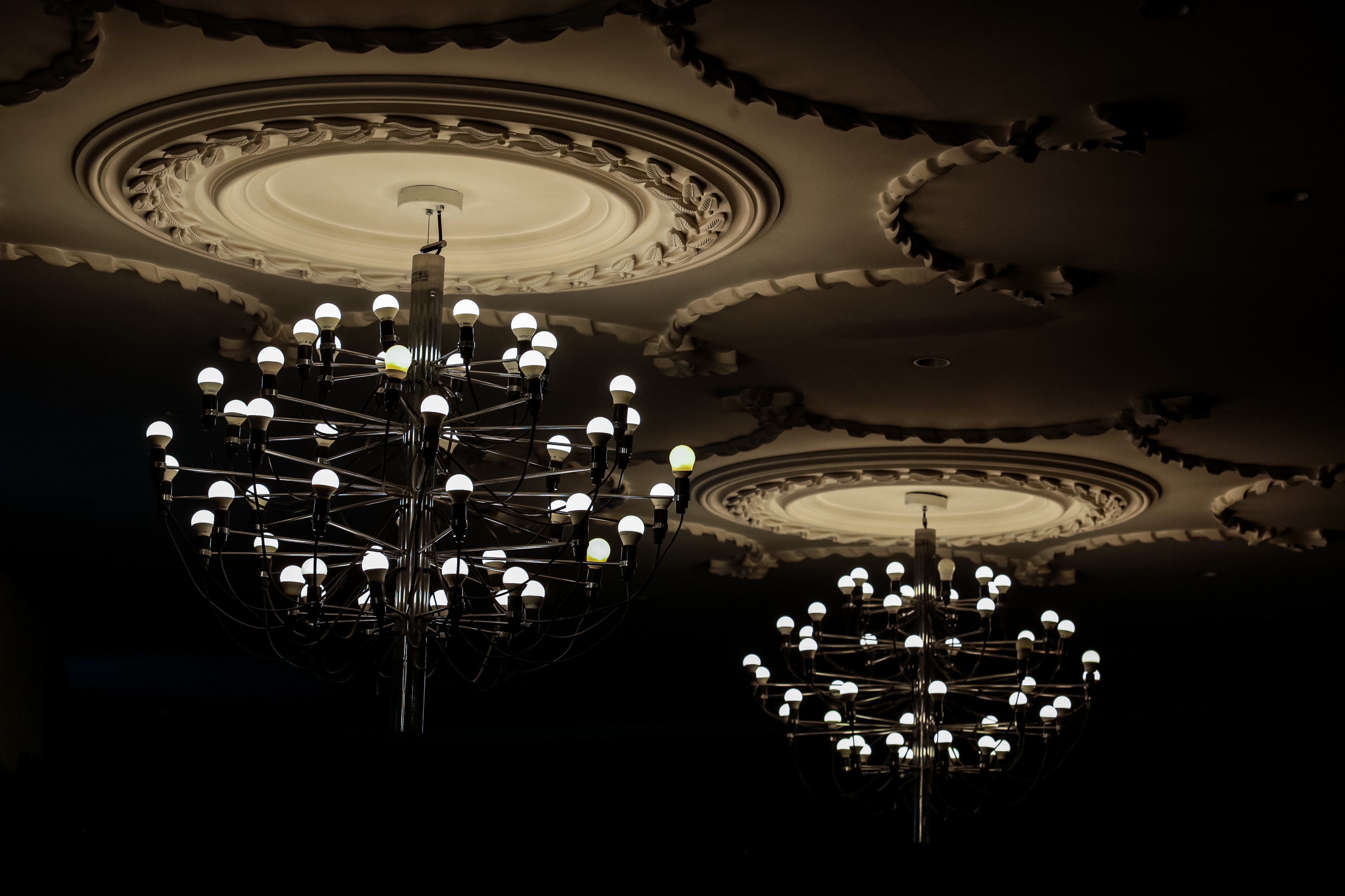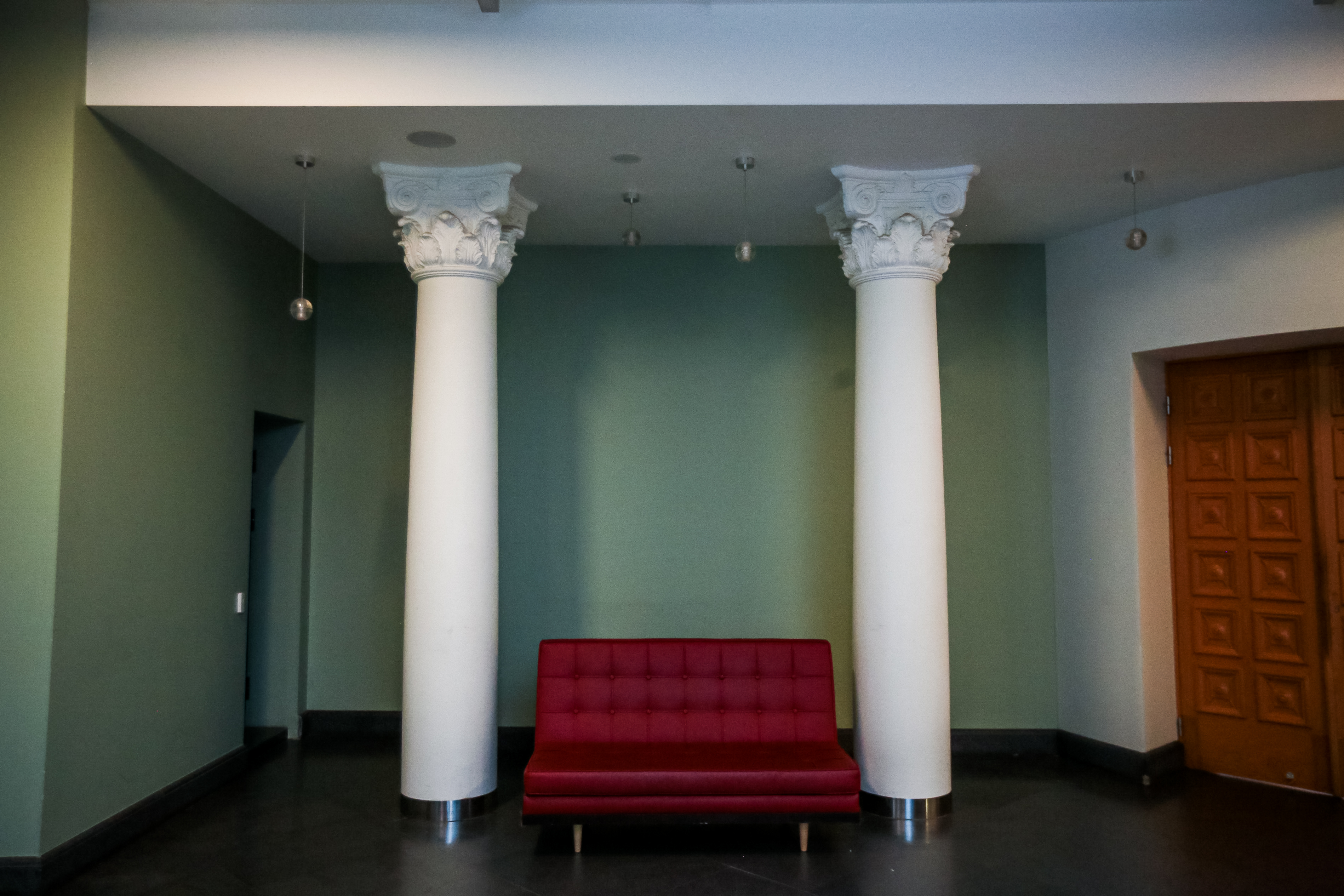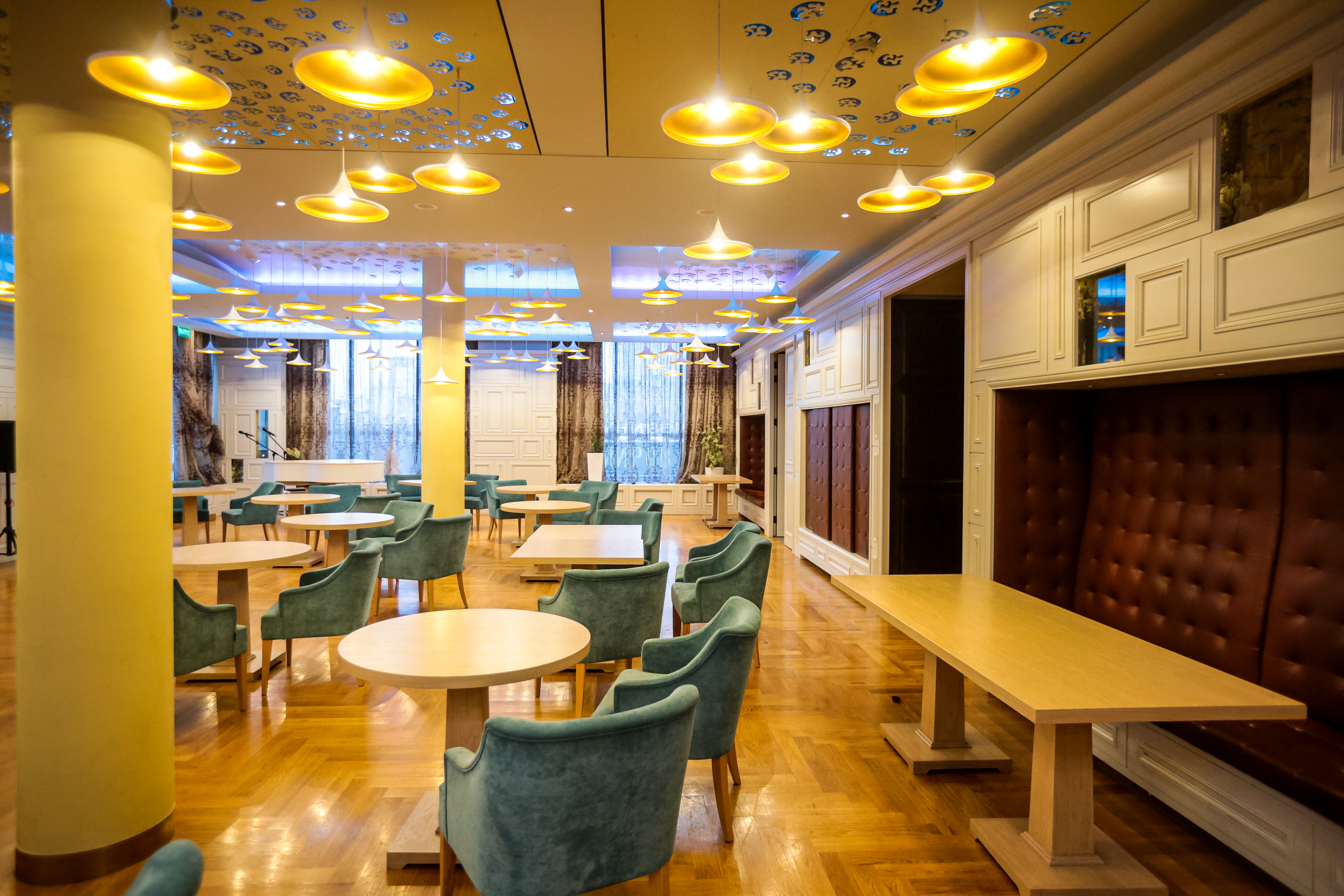 Безусловным украшением фойе «Победы» служат не только восстановленная лепнина и кессонированные потолки, но и огромные люстры в виде шаров. Они собраны из множества прозрачных элементов. Их изготовили по спецзаказу в Италии.