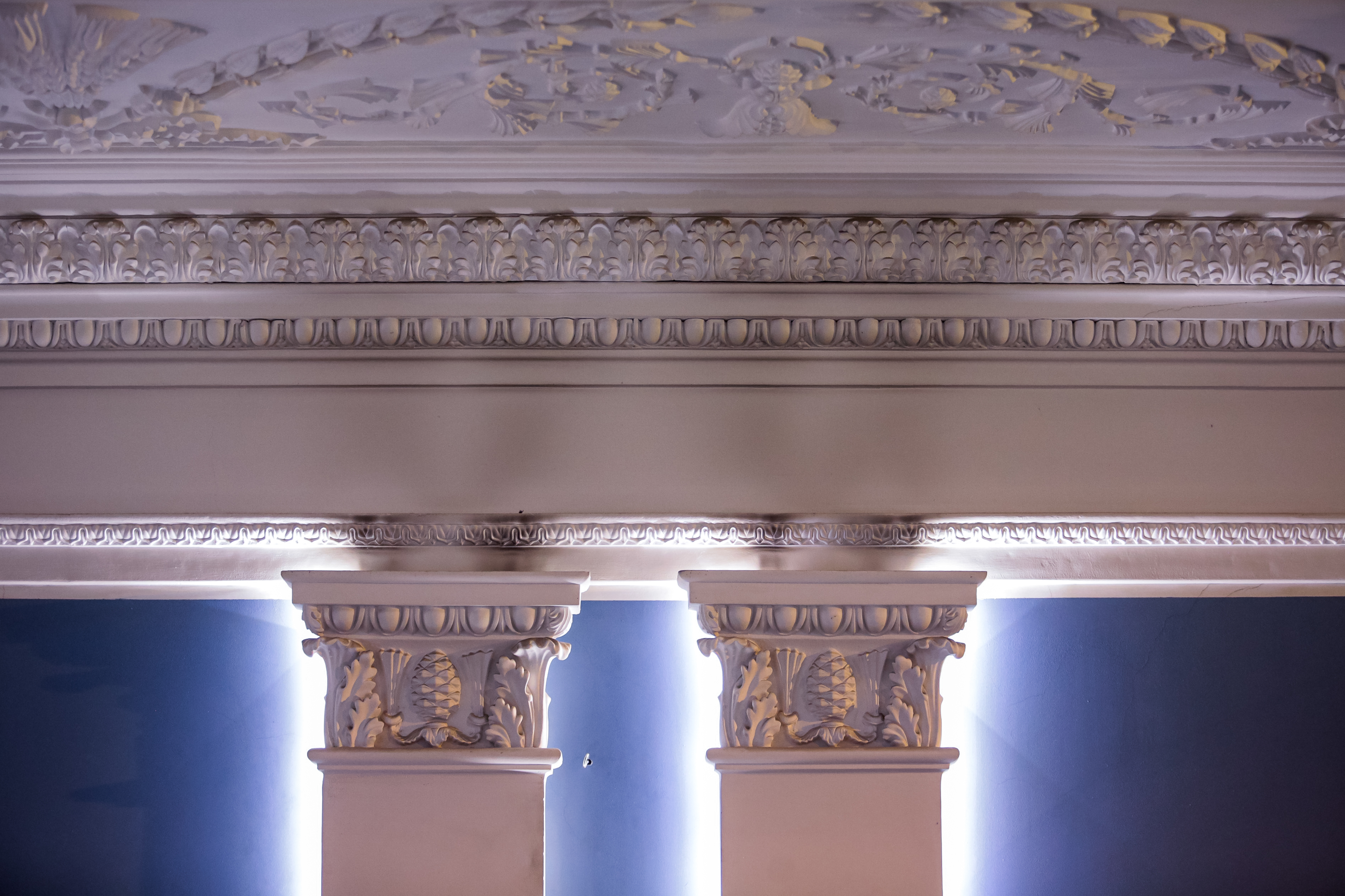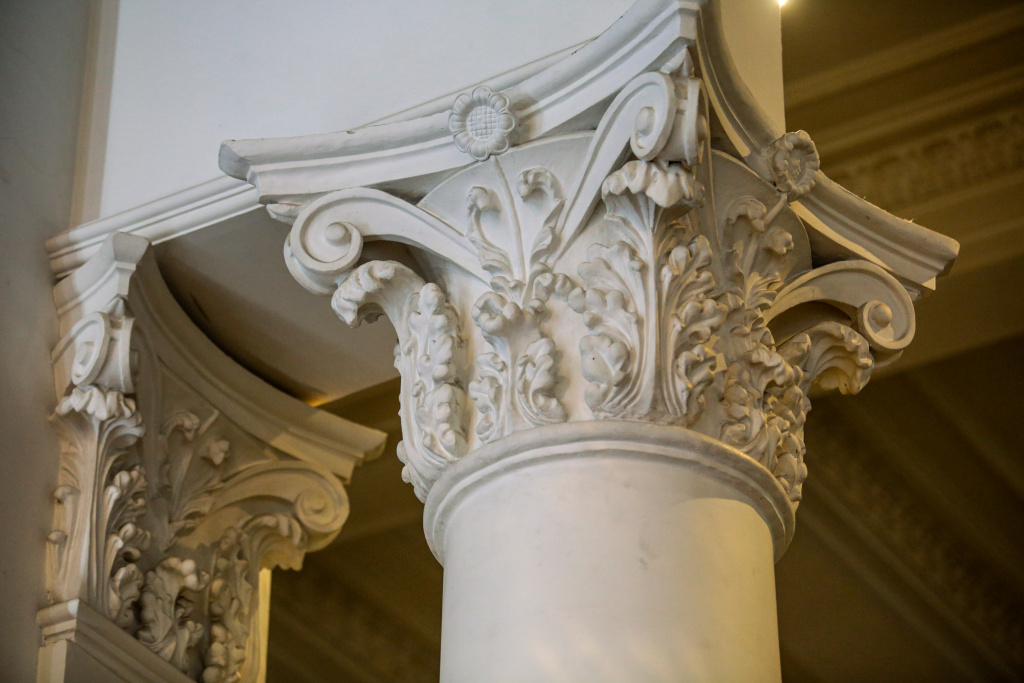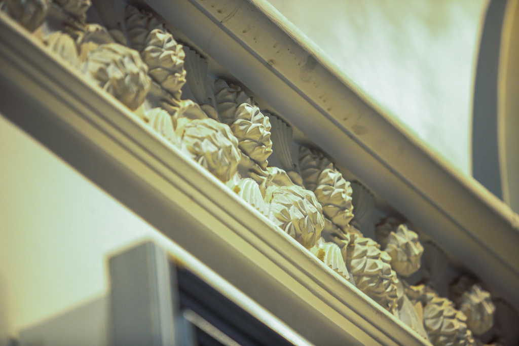 Всю лепнину, украшавшую интерьер и утраченную за постсоветский период, восстановили в первозданном виде. Получилось найти мастера, который занимался изготовлением декора во вторую реконструкцию. У специалиста, к счастью, сохранились не только рецепт смеси для лепнины, но и формы. Деревянные двери с декоративными элементами тоже удалось сберечь.